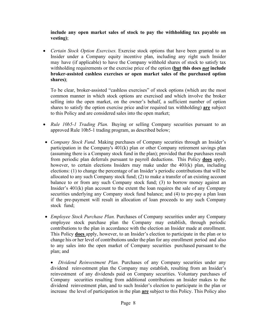 Page 8 include any open market sales of stock to pay the withholding tax payable on vesting); • Certain Stock Option Exercises. Exercise stock options that have been granted to an Insider under a Company equity incentive plan, including any right such Insider may have (if applicable) to have the Company withhold shares of stock to satisfy tax withholding requirements or the exercise price of the option (but this does not include broker-assisted cashless exercises or open market sales of the purchased option shares); To be clear, broker-assisted “cashless exercises” of stock options (which are the most common manner in which stock options are exercised and which involve the broker selling into the open market, on the owner’s behalf, a sufficient number of option shares to satisfy the option exercise price and/or required tax withholding) are subject to this Policy and are considered sales into the open market; • Rule 10b5-1 Trading Plan. Buying or selling Company securities pursuant to an approved Rule 10b5-1 trading program, as described below; • Company Stock Fund. Making purchases of Company securities through an Insider’s participation in the Company's 401(k) plan or other Company retirement savings plan (assuming there is a Company stock fund in the plan); provided that the purchases result from periodic plan deferrals pursuant to payroll deductions. This Policy does apply, however, to certain elections Insiders may make under the 401(k) plan, including elections: (1) to change the percentage of an Insider’s periodic contributions that will be allocated to any such Company stock fund; (2) to make a transfer of an existing account balance to or from any such Company stock fund; (3) to borrow money against an Insider’s 401(k) plan account to the extent the loan requires the sale of any Company securities underlying any Company stock fund balance; and (4) to pre-pay a plan loan if the pre-payment will result in allocation of loan proceeds to any such Company stock fund; • Employee Stock Purchase Plan. Purchases of Company securities under any Company employee stock purchase plan the Company may establish, through periodic contributions to the plan in accordance with the election an Insider made at enrollment. This Policy does apply, however, to an Insider’s election to participate in the plan or to change his or her level of contributions under the plan for any enrollment period and also to any sales into the open market of Company securities purchased pursuant to the plan; and • Dividend Reinvestment Plan. Purchases of any Company securities under any dividend reinvestment plan the Company may establish, resulting from an Insider’s reinvestment of any dividends paid on Company securities. Voluntary purchases of Company securities resulting from additional contributions an Insider makes to the dividend reinvestment plan, and to such Insider’s election to participate in the plan or increase the level of participation in the plan are subject to this Policy. This Policy also