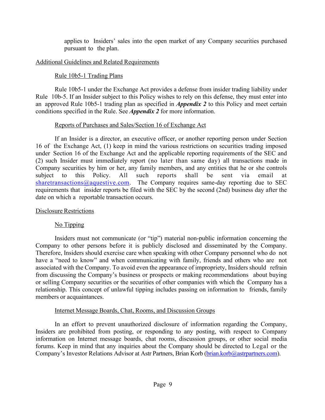 Page 9 applies to Insiders’ sales into the open market of any Company securities purchased pursuant to the plan. Additional Guidelines and Related Requirements Rule 10b5-1 Trading Plans Rule 10b5-1 under the Exchange Act provides a defense from insider trading liability under Rule 10b-5. If an Insider subject to this Policy wishes to rely on this defense, they must enter into an approved Rule 10b5-1 trading plan as specified in Appendix 2 to this Policy and meet certain conditions specified in the Rule. See Appendix 2 for more information. Reports of Purchases and Sales/Section 16 of Exchange Act If an Insider is a director, an executive officer, or another reporting person under Section 16 of the Exchange Act, (1) keep in mind the various restrictions on securities trading imposed under Section 16 of the Exchange Act and the applicable reporting requirements of the SEC and (2) such Insider must immediately report (no later than same day) all transactions made in Company securities by him or her, any family members, and any entities that he or she controls subject to this Policy. All such reports shall be sent via email at sharetransactions@aquestive.com. The Company requires same-day reporting due to SEC requirements that insider reports be filed with the SEC by the second (2nd) business day after the date on which a reportable transaction occurs. Disclosure Restrictions No Tipping Insiders must not communicate (or “tip”) material non-public information concerning the Company to other persons before it is publicly disclosed and disseminated by the Company. Therefore, Insiders should exercise care when speaking with other Company personnel who do not have a “need to know” and when communicating with family, friends and others who are not associated with the Company. To avoid even the appearance of impropriety, Insiders should refrain from discussing the Company’s business or prospects or making recommendations about buying or selling Company securities or the securities of other companies with which the Company has a relationship. This concept of unlawful tipping includes passing on information to friends, family members or acquaintances. Internet Message Boards, Chat, Rooms, and Discussion Groups In an effort to prevent unauthorized disclosure of information regarding the Company, Insiders are prohibited from posting, or responding to any posting, with respect to Company information on Internet message boards, chat rooms, discussion groups, or other social media forums. Keep in mind that any inquiries about the Company should be directed to Legal or the Company’s Investor Relations Advisor at Astr Partners, Brian Korb (brian.korb@astrpartners.com).
