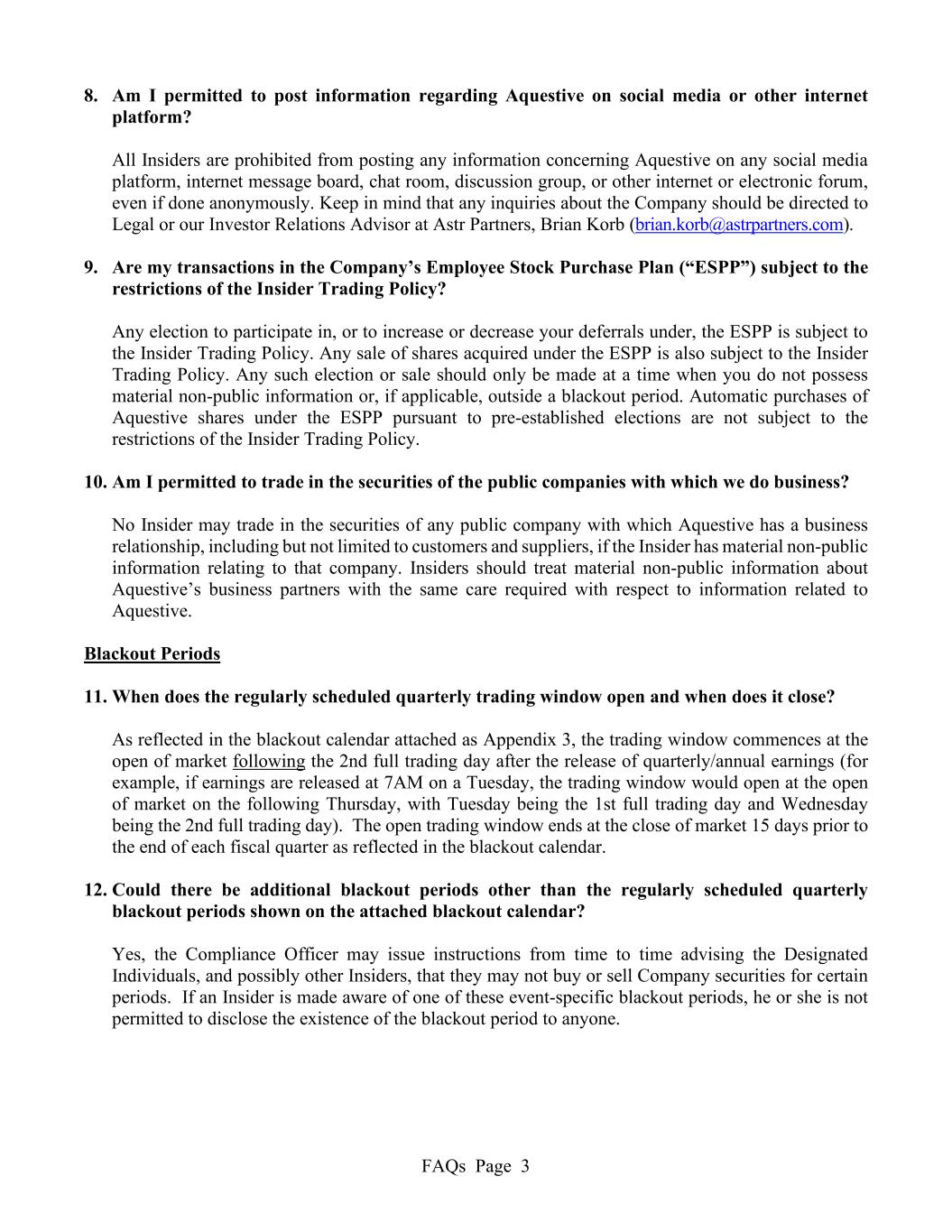 FAQs Page 3 8. Am I permitted to post information regarding Aquestive on social media or other internet platform? All Insiders are prohibited from posting any information concerning Aquestive on any social media platform, internet message board, chat room, discussion group, or other internet or electronic forum, even if done anonymously. Keep in mind that any inquiries about the Company should be directed to Legal or our Investor Relations Advisor at Astr Partners, Brian Korb (brian.korb@astrpartners.com). 9. Are my transactions in the Company’s Employee Stock Purchase Plan (“ESPP”) subject to the restrictions of the Insider Trading Policy? Any election to participate in, or to increase or decrease your deferrals under, the ESPP is subject to the Insider Trading Policy. Any sale of shares acquired under the ESPP is also subject to the Insider Trading Policy. Any such election or sale should only be made at a time when you do not possess material non-public information or, if applicable, outside a blackout period. Automatic purchases of Aquestive shares under the ESPP pursuant to pre-established elections are not subject to the restrictions of the Insider Trading Policy. 10. Am I permitted to trade in the securities of the public companies with which we do business? No Insider may trade in the securities of any public company with which Aquestive has a business relationship, including but not limited to customers and suppliers, if the Insider has material non-public information relating to that company. Insiders should treat material non-public information about Aquestive’s business partners with the same care required with respect to information related to Aquestive. Blackout Periods 11. When does the regularly scheduled quarterly trading window open and when does it close? As reflected in the blackout calendar attached as Appendix 3, the trading window commences at the open of market following the 2nd full trading day after the release of quarterly/annual earnings (for example, if earnings are released at 7AM on a Tuesday, the trading window would open at the open of market on the following Thursday, with Tuesday being the 1st full trading day and Wednesday being the 2nd full trading day). The open trading window ends at the close of market 15 days prior to the end of each fiscal quarter as reflected in the blackout calendar. 12. Could there be additional blackout periods other than the regularly scheduled quarterly blackout periods shown on the attached blackout calendar? Yes, the Compliance Officer may issue instructions from time to time advising the Designated Individuals, and possibly other Insiders, that they may not buy or sell Company securities for certain periods. If an Insider is made aware of one of these event-specific blackout periods, he or she is not permitted to disclose the existence of the blackout period to anyone.