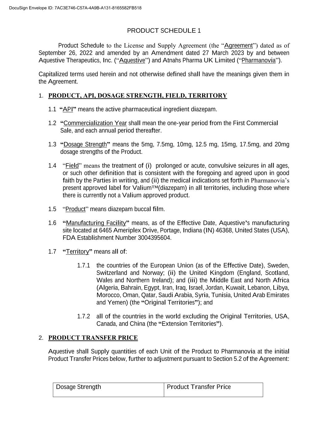 PRODUCT SCHEDULE 1 Product Schedule to the License and Supply Agreement (the “Agreement”) dated as of September 26, 2022 and amended by an Amendment dated 27 March 2023 by and between Aquestive Therapeutics, Inc. (“Aquestive”) and Atnahs Pharma UK Limited (“Pharmanovia”). Capitalized terms used herein and not otherwise defined shall have the meanings given them in the Agreement. 1. PRODUCT, API, DOSAGE STRENGTH, FIELD, TERRITORY 1.1 “API” means the active pharmaceutical ingredient diazepam. 1.2 “Commercialization Year shall mean the one-year period from the First Commercial Sale, and each annual period thereafter. 1.3 “Dosage Strength” means the 5mg, 7.5mg, 10mg, 12.5 mg, 15mg, 17.5mg, and 20mg dosage strengths of the Product. 1.4 “Field” means the treatment of (i) prolonged or acute, convulsive seizures in all ages, or such other definition that is consistent with the foregoing and agreed upon in good faith by the Parties in writing, and (ii) the medical indications set forth in Pharmanovia’s present approved label for Valium™(diazepam) in all territories, including those where there is currently not a Valium approved product. 1.5 “Product” means diazepam buccal film. 1.6 “Manufacturing Facility” means, as of the Effective Date, Aquestive’s manufacturing site located at 6465 Ameriplex Drive, Portage, Indiana (IN) 46368, United States (USA), FDA Establishment Number 3004395604. 1.7 “Territory” means all of: 1.7.1 the countries of the European Union (as of the Effective Date), Sweden, Switzerland and Norway; (ii) the United Kingdom (England, Scotland, Wales and Northern Ireland); and (iii) the Middle East and North Africa (Algeria, Bahrain, Egypt, Iran, Iraq, Israel, Jordan, Kuwait, Lebanon, Libya, Morocco, Oman, Qatar, Saudi Arabia, Syria, Tunisia, United Arab Emirates and Yemen) (the “Original Territories”); and 1.7.2 all of the countries in the world excluding the Original Territories, USA, Canada, and China (the “Extension Territories”). 2. PRODUCT TRANSFER PRICE Aquestive shall Supply quantities of each Unit of the Product to Pharmanovia at the initial Product Transfer Prices below, further to adjustment pursuant to Section 5.2 of the Agreement: Dosage Strength Product Transfer Price DocuSign Envelope ID: 7AC3E746-C57A-4A9B-A131-8165582FB518