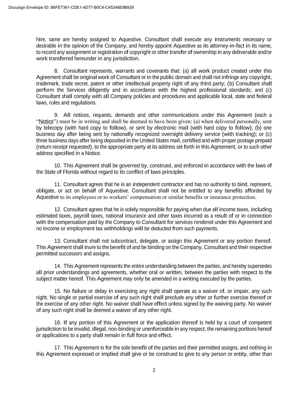 2 hire, same are hereby assigned to Aquestive. Consultant shall execute any instruments necessary or desirable in the opinion of the Company, and hereby appoint Aquestive as its attorney-in-fact in its name, to record any assignment or registration of copyright or other transfer of ownership in any deliverable and/or work transferred hereunder in any jurisdiction. 8. Consultant represents, warrants and covenants that: (a) all work product created under this Agreement shall be original work of Consultant or in the public domain and shall not infringe any copyright, trademark, trade secret, patent or other intellectual property right of any third party; (b) Consultant shall perform the Services diligently and in accordance with the highest professional standards; and (c) Consultant shall comply with all Company policies and procedures and applicable local, state and federal laws, rules and regulations. 9. All notices, requests, demands and other communications under this Agreement (each a “Notice”) must be in writing and shall be deemed to have been given: (a) when delivered personally, sent by telecopy (with hard copy to follow), or sent by electronic mail (with hard copy to follow); (b) one business day after being sent by nationally recognized overnight delivery service (with tracking); or (c) three business days after being deposited in the United States mail, certified and with proper postage prepaid (return receipt requested), to the appropriate party at its address set forth in this Agreement, or to such other address specified in a Notice. 10. This Agreement shall be governed by, construed, and enforced in accordance with the laws of the State of Florida without regard to its conflict of laws principles. 11. Consultant agrees that he is an independent contractor and has no authority to bind, represent, obligate, or act on behalf of Aquestive. Consultant shall not be entitled to any benefits afforded by Aquestive to its employees or to workers’ compensation or similar benefits or insurance protection. 12. Consultant agrees that he is solely responsible for paying when due all income taxes, including estimated taxes, payroll taxes, national insurance and other taxes incurred as a result of or in connection with the compensation paid by the Company to Consultant for services rendered under this Agreement and no income or employment tax withholdings will be deducted from such payments. 13. Consultant shall not subcontract, delegate, or assign this Agreement or any portion thereof. This Agreement shall inure to the benefit of and be binding on the Company, Consultant and their respective permitted successors and assigns. 14. This Agreement represents the entire understanding between the parties, and hereby supersedes all prior understandings and agreements, whether oral or written, between the parties with respect to the subject matter hereof. This Agreement may only be amended in a writing executed by the parties. 15. No failure or delay in exercising any right shall operate as a waiver of, or impair, any such right. No single or partial exercise of any such right shall preclude any other or further exercise thereof or the exercise of any other right. No waiver shall have effect unless signed by the waiving party. No waiver of any such right shall be deemed a waiver of any other right. 16. If any portion of this Agreement or the application thereof is held by a court of competent jurisdiction to be invalid, illegal, non-binding or unenforceable in any respect, the remaining portions hereof or applications to a party shall remain in full force and effect. 17. This Agreement is for the sole benefit of the parties and their permitted assigns, and nothing in this Agreement expressed or implied shall give or be construed to give to any person or entity, other than Docusign Envelope ID: B6FE7361-CDE1-4D77-B0C4-C45248E9B939