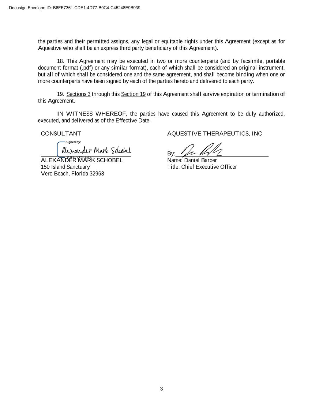 3 the parties and their permitted assigns, any legal or equitable rights under this Agreement (except as for Aquestive who shall be an express third party beneficiary of this Agreement). 18. This Agreement may be executed in two or more counterparts (and by facsimile, portable document format (.pdf) or any similar format), each of which shall be considered an original instrument, but all of which shall be considered one and the same agreement, and shall become binding when one or more counterparts have been signed by each of the parties hereto and delivered to each party. 19. Sections 3 through this Section 19 of this Agreement shall survive expiration or termination of this Agreement. IN WITNESS WHEREOF, the parties have caused this Agreement to be duly authorized, executed, and delivered as of the Effective Date. CONSULTANT AQUESTIVE THERAPEUTICS, INC. _______________________________ ALEXANDER MARK SCHOBEL 150 Island Sanctuary Vero Beach, Florida 32963 By:________________________________ Name: Daniel Barber Title: Chief Executive Officer Docusign Envelope ID: B6FE7361-CDE1-4D77-B0C4-C45248E9B939