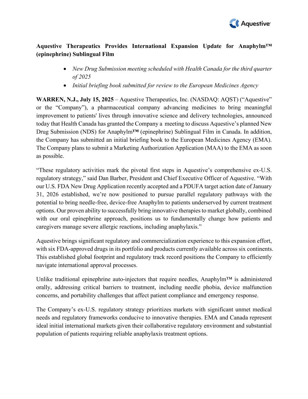 Aquestive Therapeutics Provides International Expansion Update for Anaphylm™  (epinephrine) Sublingual Film  • New Drug Submission meeting scheduled with Health Canada for the third quarter  of 2025  • Initial briefing book submitted for review to the European Medicines Agency  WARREN, N.J., July 15, 2025 – Aquestive Therapeutics, Inc. (NASDAQ: AQST) (“Aquestive”  or the “Company”), a pharmaceutical company advancing medicines to bring meaningful  improvement to patients' lives through innovative science and delivery technologies, announced  today that Health Canada has granted the Company a  meeting to discuss Aquestive’s planned New  Drug Submission (NDS) for Anaphylm™ (epinephrine) Sublingual Film in Canada. In addition,  the Company has submitted an initial briefing book to the European Medicines Agency (EMA).  The Company plans to submit a Marketing Authorization Application (MAA) to the EMA as soon  as possible.   “These regulatory activities mark the pivotal first steps in Aquestive’s comprehensive ex-U.S.  regulatory strategy,” said Dan Barber, President and Chief Executive Officer of Aquestive. “With  our U.S. FDA New Drug Application recently accepted and a PDUFA target action date of January  31, 2026 established, we’re now positioned to pursue parallel regulatory pathways with the  potential to bring needle-free, device-free Anaphylm to patients underserved by current treatment  options. Our proven ability to successfully bring innovative therapies to market globally, combined  with our oral epinephrine approach, positions us to fundamentally change how patients and  caregivers manage severe allergic reactions, including anaphylaxis.”  Aquestive brings significant regulatory and commercialization experience to this expansion effort,  with six FDA-approved drugs in its portfolio and products currently available across six continents.  This established global footprint and regulatory track record positions the Company to efficiently  navigate international approval processes.  Unlike traditional epinephrine auto-injectors that require needles, Anaphylm™ is administered  orally, addressing critical barriers to treatment, including needle phobia, device malfunction  concerns, and portability challenges that affect patient compliance and emergency response.   The Company’s ex-U.S. regulatory strategy prioritizes markets with significant unmet medical  needs and regulatory frameworks conducive to innovative therapies. EMA and Canada represent  ideal initial international markets given their collaborative regulatory environment and substantial  population of patients requiring reliable anaphylaxis treatment options.