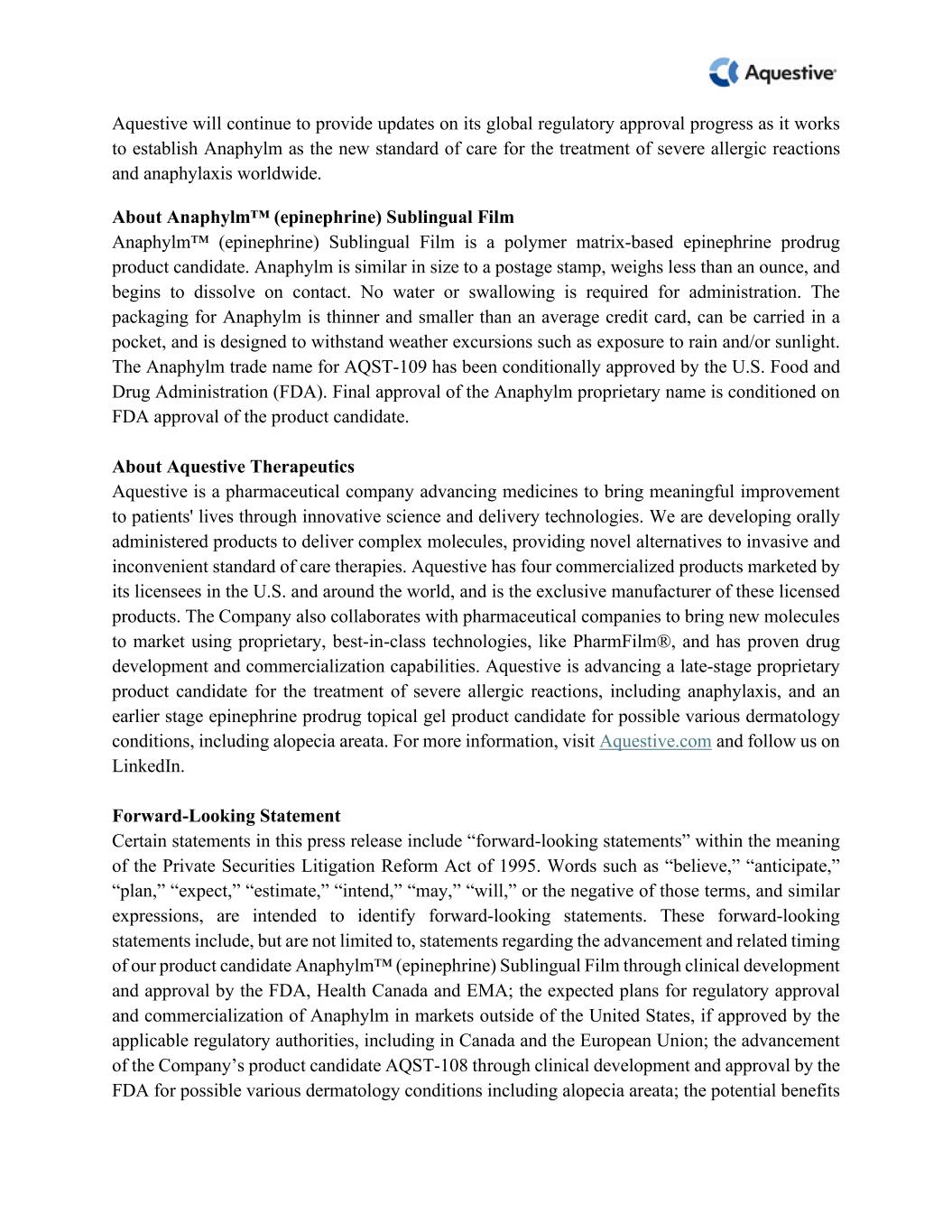 Aquestive will continue to provide updates on its global regulatory approval progress as it works  to establish Anaphylm as the new standard of care for the treatment of severe allergic reactions  and anaphylaxis worldwide.   About Anaphylm™ (epinephrine) Sublingual Film   Anaphylm™ (epinephrine) Sublingual Film is a polymer matrix-based epinephrine prodrug  product candidate. Anaphylm is similar in size to a postage stamp, weighs less than an ounce, and  begins to dissolve on contact. No water or swallowing is required for administration. The  packaging for Anaphylm is thinner and smaller than an average credit card, can be carried in a  pocket, and is designed to withstand weather excursions such as exposure to rain and/or sunlight.  The Anaphylm trade name for AQST-109 has been conditionally approved by the U.S. Food and  Drug Administration (FDA). Final approval of the Anaphylm proprietary name is conditioned on  FDA approval of the product candidate.    About Aquestive Therapeutics  Aquestive is a pharmaceutical company advancing medicines to bring meaningful improvement  to patients' lives through innovative science and delivery technologies. We are developing orally  administered products to deliver complex molecules, providing novel alternatives to invasive and  inconvenient standard of care therapies. Aquestive has four commercialized products marketed by  its licensees in the U.S. and around the world, and is the exclusive manufacturer of these licensed  products. The Company also collaborates with pharmaceutical companies to bring new molecules  to market using proprietary, best-in-class technologies, like PharmFilm®, and has proven drug  development and commercialization capabilities. Aquestive is advancing a late-stage proprietary  product candidate for the treatment of severe allergic reactions, including anaphylaxis, and an  earlier stage epinephrine prodrug topical gel product candidate for possible various dermatology  conditions, including alopecia areata. For more information, visit Aquestive.com and follow us on  LinkedIn.    Forward-Looking Statement  Certain statements in this press release include “forward-looking statements” within the meaning  of the Private Securities Litigation Reform Act of 1995. Words such as “believe,” “anticipate,”  “plan,” “expect,” “estimate,” “intend,” “may,” “will,” or the negative of those terms, and similar  expressions, are intended to identify forward-looking statements. These forward-looking  statements include, but are not limited to, statements regarding the advancement and related timing  of our product candidate Anaphylm™ (epinephrine) Sublingual Film through clinical development  and approval by the FDA, Health Canada and EMA; the expected plans for regulatory approval  and commercialization of Anaphylm in markets outside of the United States, if approved by the  applicable regulatory authorities, including in Canada and the European Union; the advancement  of the Company’s product candidate AQST-108 through clinical development and approval by the  FDA for possible various dermatology conditions including alopecia areata; the potential benefits