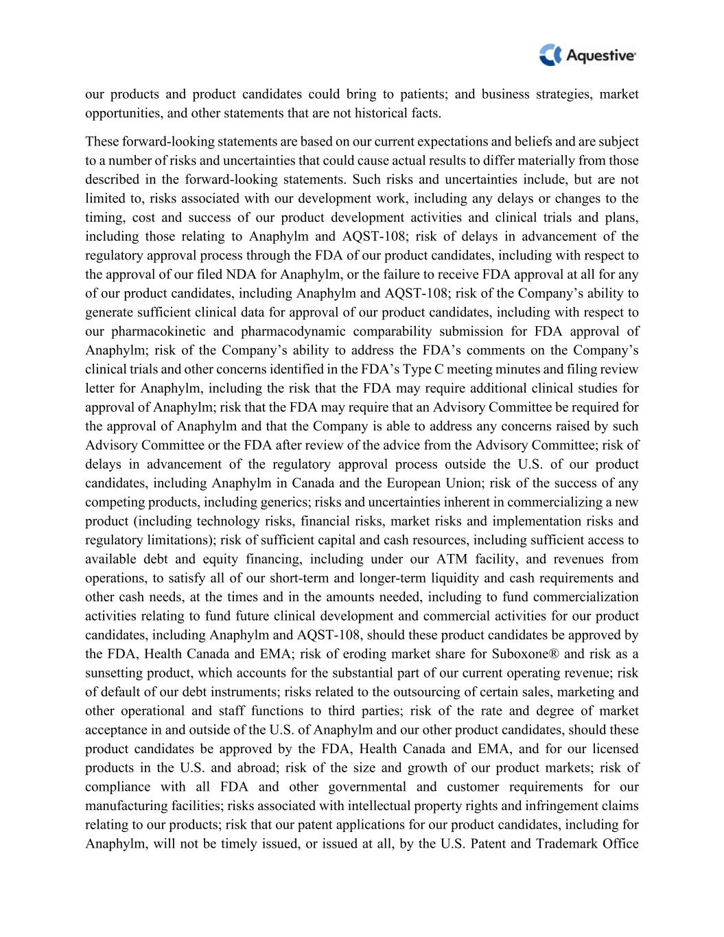 our products and product candidates could bring to patients; and business strategies, market  opportunities, and other statements that are not historical facts.  These forward-looking statements are based on our current expectations and beliefs and are subject  to a number of risks and uncertainties that could cause actual results to differ materially from those  described in the forward-looking statements. Such risks and uncertainties include, but are not  limited to, risks associated with our development work, including any delays or changes to the  timing, cost and success of our product development activities and clinical trials and plans,  including those relating to Anaphylm and AQST-108; risk of delays in advancement of the  regulatory approval process through the FDA of our product candidates, including with respect to  the approval of our filed NDA for Anaphylm, or the failure to receive FDA approval at all for any  of our product candidates, including Anaphylm and AQST-108; risk of the Company’s ability to  generate sufficient clinical data for approval of our product candidates, including with respect to  our pharmacokinetic and pharmacodynamic comparability submission for FDA approval of  Anaphylm; risk of the Company’s ability to address the FDA’s comments on the Company’s  clinical trials and other concerns identified in the FDA’s Type C meeting minutes and filing review  letter for Anaphylm, including the risk that the FDA may require additional clinical studies for  approval of Anaphylm; risk that the FDA may require that an Advisory Committee be required for  the approval of Anaphylm and that the Company is able to address any concerns raised by such  Advisory Committee or the FDA after review of the advice from the Advisory Committee; risk of  delays in advancement of the regulatory approval process outside the U.S. of our product  candidates, including Anaphylm in Canada and the European Union; risk of the success of any  competing products, including generics; risks and uncertainties inherent in commercializing a new  product (including technology risks, financial risks, market risks and implementation risks and  regulatory limitations); risk of sufficient capital and cash resources, including sufficient access to  available debt and equity financing, including under our ATM facility, and revenues from  operations, to satisfy all of our short-term and longer-term liquidity and cash requirements and  other cash needs, at the times and in the amounts needed, including to fund commercialization  activities relating to fund future clinical development and commercial activities for our product  candidates, including Anaphylm and AQST-108, should these product candidates be approved by  the FDA, Health Canada and EMA; risk of eroding market share for Suboxone® and risk as a  sunsetting product, which accounts for the substantial part of our current operating revenue; risk  of default of our debt instruments; risks related to the outsourcing of certain sales, marketing and  other operational and staff functions to third parties; risk of the rate and degree of market  acceptance in and outside of the U.S. of Anaphylm and our other product candidates, should these  product candidates be approved by the FDA, Health Canada and EMA, and for our licensed  products in the U.S. and abroad; risk of the size and growth of our product markets; risk of  compliance with all FDA and other governmental and customer requirements for our  manufacturing facilities; risks associated with intellectual property rights and infringement claims  relating to our products; risk that our patent applications for our product candidates, including for  Anaphylm, will not be timely issued, or issued at all, by the U.S. Patent and Trademark Office