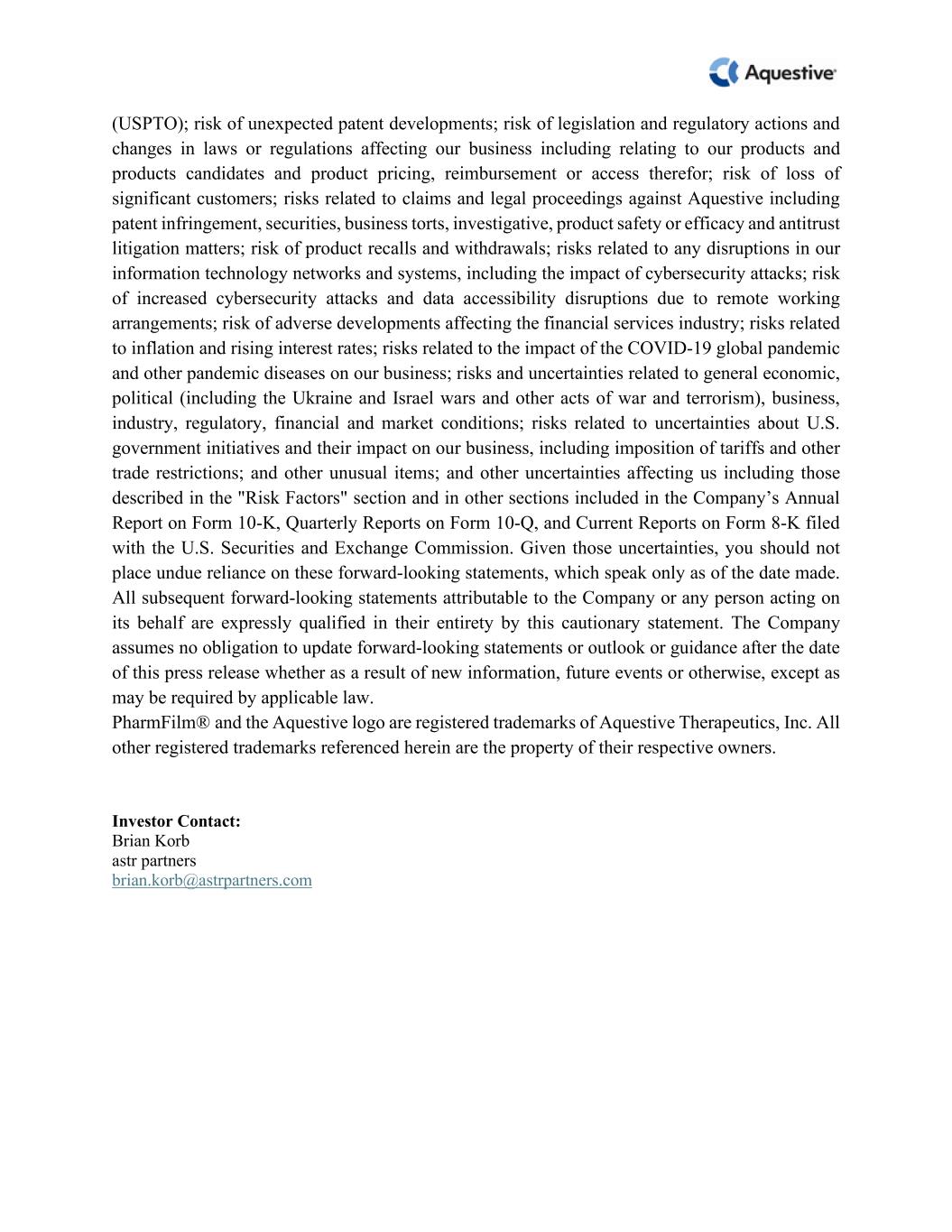 (USPTO); risk of unexpected patent developments; risk of legislation and regulatory actions and  changes in laws or regulations affecting our business including relating to our products and  products candidates and product pricing, reimbursement or access therefor; risk of loss of  significant customers; risks related to claims and legal proceedings against Aquestive including  patent infringement, securities, business torts, investigative, product safety or efficacy and antitrust  litigation matters; risk of product recalls and withdrawals; risks related to any disruptions in our  information technology networks and systems, including the impact of cybersecurity attacks; risk  of increased cybersecurity attacks and data accessibility disruptions due to remote working  arrangements; risk of adverse developments affecting the financial services industry; risks related  to inflation and rising interest rates; risks related to the impact of the COVID-19 global pandemic  and other pandemic diseases on our business; risks and uncertainties related to general economic,  political (including the Ukraine and Israel wars and other acts of war and terrorism), business,  industry, regulatory, financial and market conditions; risks related to uncertainties about U.S.  government initiatives and their impact on our business, including imposition of tariffs and other  trade restrictions; and other unusual items; and other uncertainties affecting us including those  described in the "Risk Factors" section and in other sections included in the Company’s Annual  Report on Form 10-K, Quarterly Reports on Form 10-Q, and Current Reports on Form 8-K filed  with the U.S. Securities and Exchange Commission. Given those uncertainties, you should not  place undue reliance on these forward-looking statements, which speak only as of the date made.  All subsequent forward-looking statements attributable to the Company or any person acting on  its behalf are expressly qualified in their entirety by this cautionary statement. The Company  assumes no obligation to update forward-looking statements or outlook or guidance after the date  of this press release whether as a result of new information, future events or otherwise, except as  may be required by applicable law.  PharmFilm® and the Aquestive logo are registered trademarks of Aquestive Therapeutics, Inc. All  other registered trademarks referenced herein are the property of their respective owners.      Investor Contact:  Brian Korb  astr partners  brian.korb@astrpartners.com