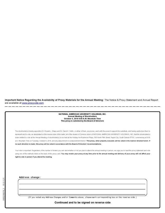 You are cordially invited to attend the 2016 Annual Meeting of Stockholders of National American University Holdings, Inc. to be held at the Holiday Inn-Rushmore Plaza, 505 North Fifth Street, Rapid City, South Dakota 57701, commencing at 9:00 a.m. Mountain Time on Tuesday, October 4, 2016.