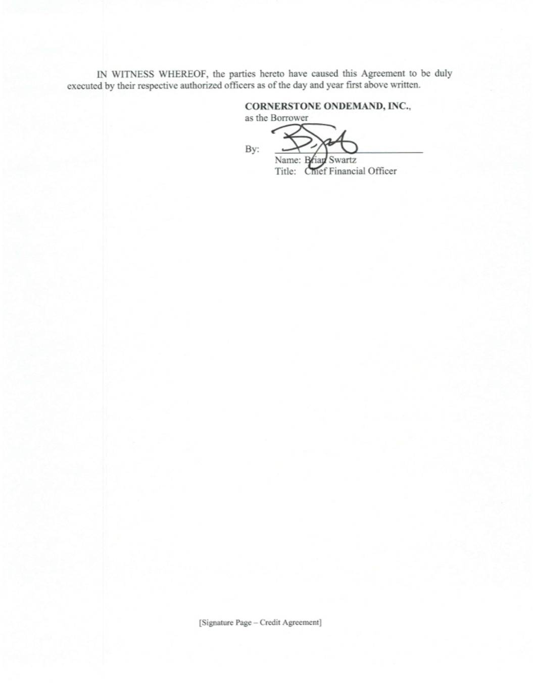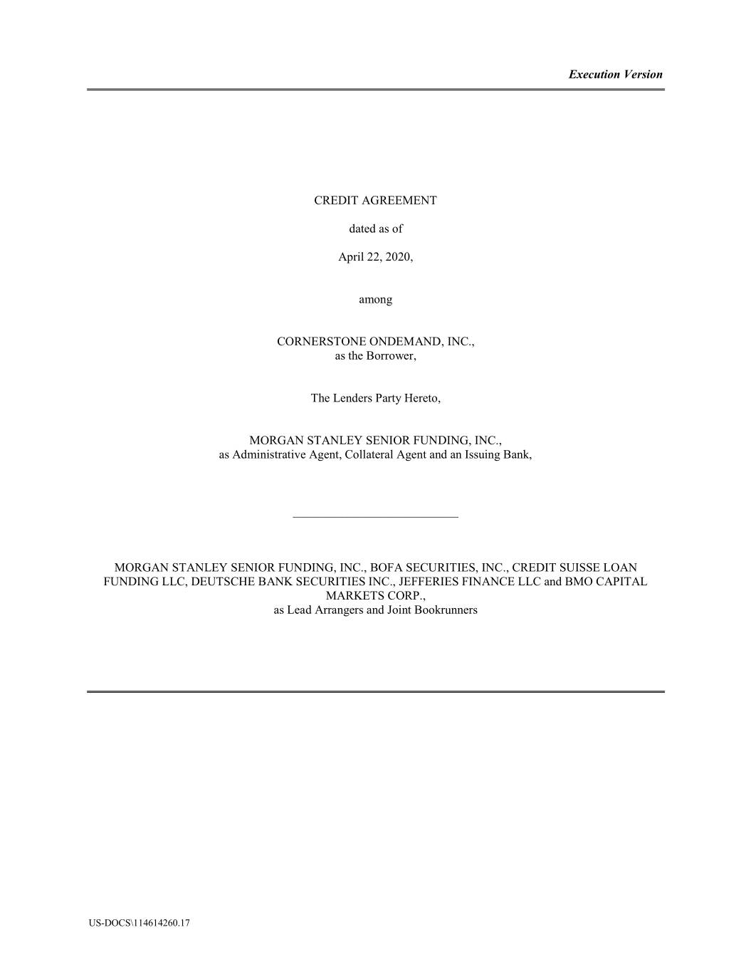 Execution Version CREDIT AGREEMENT dated as of April 22, 2020, among CORNERSTONE ONDEMAND, INC., as the Borrower, The Lenders Party Hereto, MORGAN STANLEY SENIOR FUNDING, INC., as Administrative Agent, Collateral Agent and an Issuing Bank, ___________________________ MORGAN STANLEY SENIOR FUNDING, INC., BOFA SECURITIES, INC., CREDIT SUISSE LOAN FUNDING LLC, DEUTSCHE BANK SECURITIES INC., JEFFERIES FINANCE LLC and BMO CAPITAL MARKETS CORP., as Lead Arrangers and Joint Bookrunners US-DOCS\114614260.17