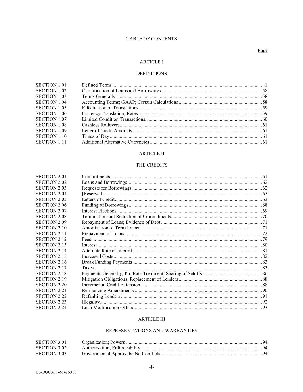 TABLE OF CONTENTS Page ARTICLE I DEFINITIONS SECTION 1.01 Defined Terms .......................................................................................................................... 1 SECTION 1.02 Classification of Loans and Borrowings ................................................................................. 58 SECTION 1.03 Terms Generally ..................................................................................................................... 58 SECTION 1.04 Accounting Terms; GAAP; Certain Calculations ................................................................... 58 SECTION 1.05 Effectuation of Transactions ................................................................................................... 59 SECTION 1.06 Currency Translation; Rates ................................................................................................... 59 SECTION 1.07 Limited Condition Transactions. ............................................................................................ 60 SECTION 1.08 Cashless Rollovers .................................................................................................................. 61 SECTION 1.09 Letter of Credit Amounts ........................................................................................................ 61 SECTION 1.10 Times of Day .......................................................................................................................... 61 SECTION 1.11 Additional Alternative Currencies .......................................................................................... 61 ARTICLE II THE CREDITS SECTION 2.01 Commitments ......................................................................................................................... 61 SECTION 2.02 Loans and Borrowings ............................................................................................................ 62 SECTION 2.03 Requests for Borrowings ........................................................................................................ 62 SECTION 2.04 [Reserved]............................................................................................................................... 63 SECTION 2.05 Letters of Credit ...................................................................................................................... 63 SECTION 2.06 Funding of Borrowings ........................................................................................................... 68 SECTION 2.07 Interest Elections .................................................................................................................... 69 SECTION 2.08 Termination and Reduction of Commitments......................................................................... 70 SECTION 2.09 Repayment of Loans; Evidence of Debt ................................................................................. 71 SECTION 2.10 Amortization of Term Loans .................................................................................................. 71 SECTION 2.11 Prepayment of Loans .............................................................................................................. 72 SECTION 2.12 Fees ......................................................................................................................................... 79 SECTION 2.13 Interest .................................................................................................................................... 80 SECTION 2.14 Alternate Rate of Interest ........................................................................................................ 81 SECTION 2.15 Increased Costs ....................................................................................................................... 82 SECTION 2.16 Break Funding Payments ........................................................................................................ 83 SECTION 2.17 Taxes ...................................................................................................................................... 83 SECTION 2.18 Payments Generally; Pro Rata Treatment; Sharing of Setoffs ................................................ 86 SECTION 2.19 Mitigation Obligations; Replacement of Lenders ................................................................... 88 SECTION 2.20 Incremental Credit Extension ................................................................................................. 88 SECTION 2.21 Refinancing Amendments ...................................................................................................... 90 SECTION 2.22 Defaulting Lenders ................................................................................................................. 91 SECTION 2.23 Illegality .................................................................................................................................. 92 SECTION 2.24 Loan Modification Offers ....................................................................................................... 93 ARTICLE III REPRESENTATIONS AND WARRANTIES SECTION 3.01 Organization; Powers ............................................................................................................. 94 SECTION 3.02 Authorization; Enforceability ................................................................................................. 94 SECTION 3.03 Governmental Approvals; No Conflicts ................................................................................. 94 -i- US-DOCS\114614260.17