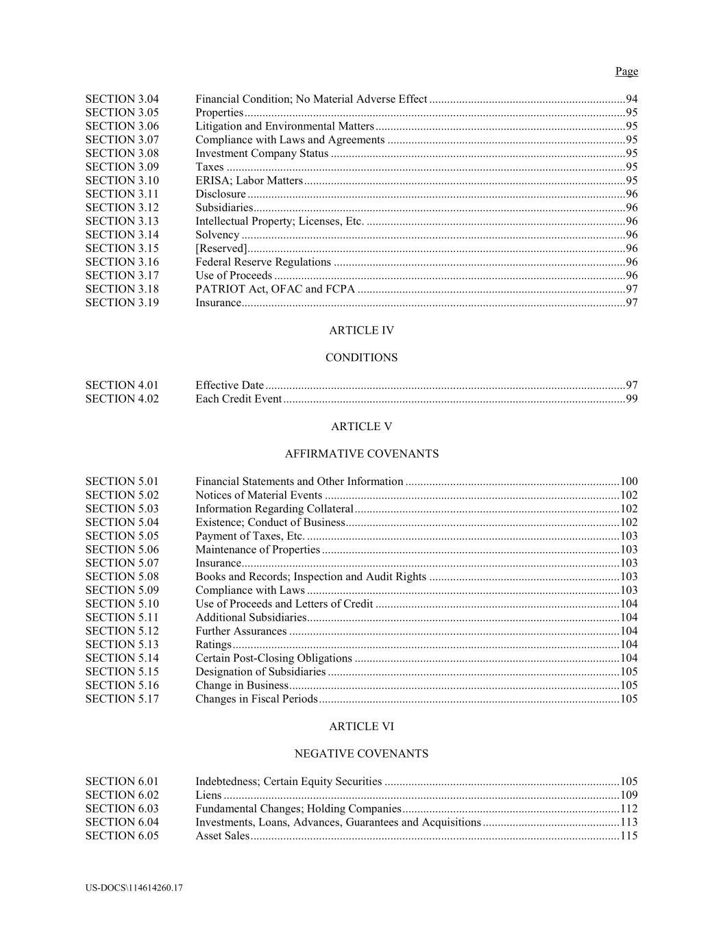 Page SECTION 3.04 Financial Condition; No Material Adverse Effect .................................................................. 94 SECTION 3.05 Properties ................................................................................................................................ 95 SECTION 3.06 Litigation and Environmental Matters .................................................................................... 95 SECTION 3.07 Compliance with Laws and Agreements ................................................................................ 95 SECTION 3.08 Investment Company Status ................................................................................................... 95 SECTION 3.09 Taxes ...................................................................................................................................... 95 SECTION 3.10 ERISA; Labor Matters ............................................................................................................ 95 SECTION 3.11 Disclosure ............................................................................................................................... 96 SECTION 3.12 Subsidiaries ............................................................................................................................. 96 SECTION 3.13 Intellectual Property; Licenses, Etc. ....................................................................................... 96 SECTION 3.14 Solvency ................................................................................................................................. 96 SECTION 3.15 [Reserved]............................................................................................................................... 96 SECTION 3.16 Federal Reserve Regulations .................................................................................................. 96 SECTION 3.17 Use of Proceeds ...................................................................................................................... 96 SECTION 3.18 PATRIOT Act, OFAC and FCPA .......................................................................................... 97 SECTION 3.19 Insurance................................................................................................................................. 97 ARTICLE IV CONDITIONS SECTION 4.01 Effective Date ......................................................................................................................... 97 SECTION 4.02 Each Credit Event ................................................................................................................... 99 ARTICLE V AFFIRMATIVE COVENANTS SECTION 5.01 Financial Statements and Other Information ........................................................................ 100 SECTION 5.02 Notices of Material Events ................................................................................................... 102 SECTION 5.03 Information Regarding Collateral ......................................................................................... 102 SECTION 5.04 Existence; Conduct of Business ............................................................................................ 102 SECTION 5.05 Payment of Taxes, Etc. ......................................................................................................... 103 SECTION 5.06 Maintenance of Properties .................................................................................................... 103 SECTION 5.07 Insurance............................................................................................................................... 103 SECTION 5.08 Books and Records; Inspection and Audit Rights ................................................................ 103 SECTION 5.09 Compliance with Laws ......................................................................................................... 103 SECTION 5.10 Use of Proceeds and Letters of Credit .................................................................................. 104 SECTION 5.11 Additional Subsidiaries ......................................................................................................... 104 SECTION 5.12 Further Assurances ............................................................................................................... 104 SECTION 5.13 Ratings .................................................................................................................................. 104 SECTION 5.14 Certain Post-Closing Obligations ......................................................................................... 104 SECTION 5.15 Designation of Subsidiaries .................................................................................................. 105 SECTION 5.16 Change in Business ............................................................................................................... 105 SECTION 5.17 Changes in Fiscal Periods ..................................................................................................... 105 ARTICLE VI NEGATIVE COVENANTS SECTION 6.01 Indebtedness; Certain Equity Securities ............................................................................... 105 SECTION 6.02 Liens ..................................................................................................................................... 109 SECTION 6.03 Fundamental Changes; Holding Companies ......................................................................... 112 SECTION 6.04 Investments, Loans, Advances, Guarantees and Acquisitions .............................................. 113 SECTION 6.05 Asset Sales ............................................................................................................................ 115 US-DOCS\114614260.17