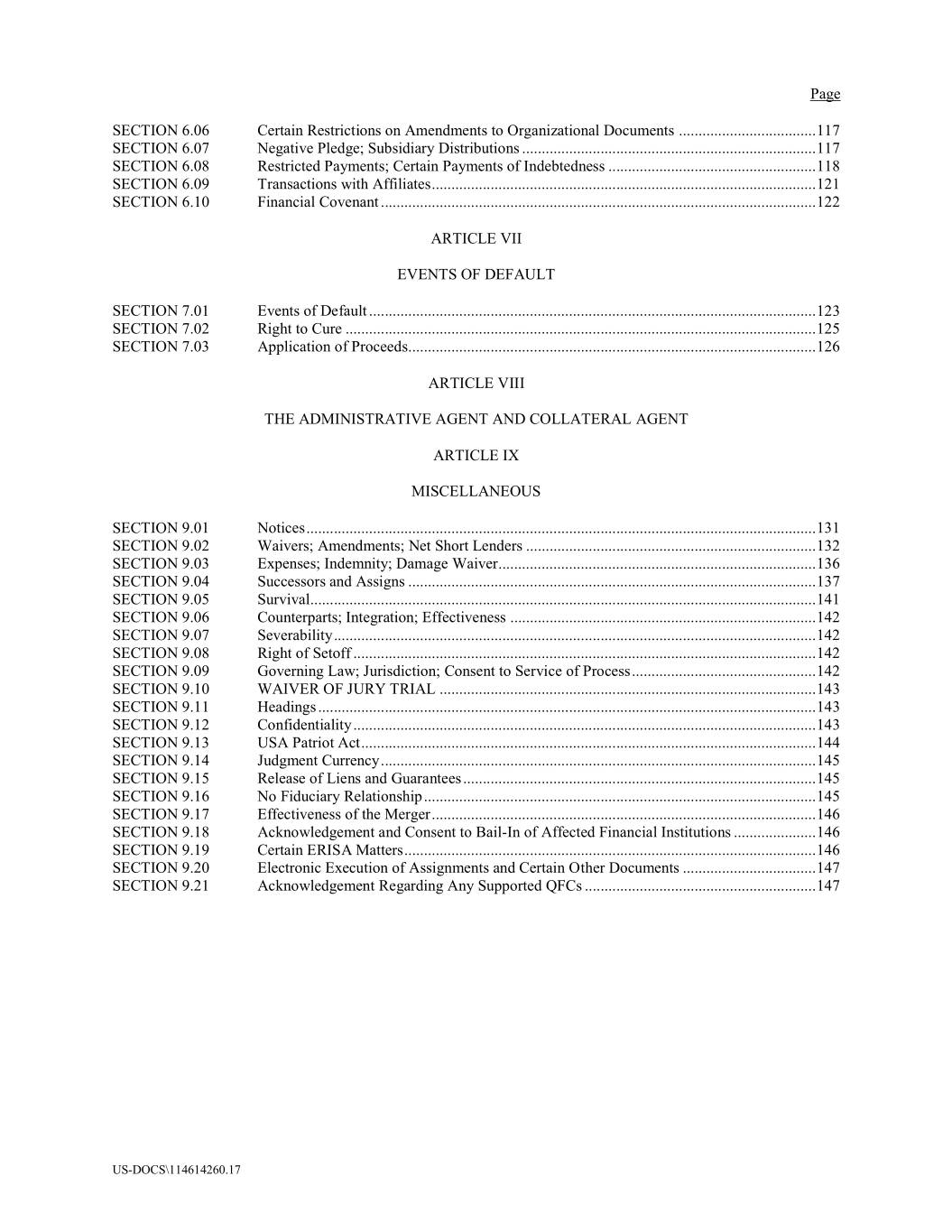Page SECTION 6.06 Certain Restrictions on Amendments to Organizational Documents ................................... 117 SECTION 6.07 Negative Pledge; Subsidiary Distributions ........................................................................... 117 SECTION 6.08 Restricted Payments; Certain Payments of Indebtedness ..................................................... 118 SECTION 6.09 Transactions with Affiliates .................................................................................................. 121 SECTION 6.10 Financial Covenant ............................................................................................................... 122 ARTICLE VII EVENTS OF DEFAULT SECTION 7.01 Events of Default .................................................................................................................. 123 SECTION 7.02 Right to Cure ........................................................................................................................ 125 SECTION 7.03 Application of Proceeds ........................................................................................................ 126 ARTICLE VIII THE ADMINISTRATIVE AGENT AND COLLATERAL AGENT ARTICLE IX MISCELLANEOUS SECTION 9.01 Notices .................................................................................................................................. 131 SECTION 9.02 Waivers; Amendments; Net Short Lenders .......................................................................... 132 SECTION 9.03 Expenses; Indemnity; Damage Waiver ................................................................................. 136 SECTION 9.04 Successors and Assigns ........................................................................................................ 137 SECTION 9.05 Survival................................................................................................................................. 141 SECTION 9.06 Counterparts; Integration; Effectiveness .............................................................................. 142 SECTION 9.07 Severability ........................................................................................................................... 142 SECTION 9.08 Right of Setoff ...................................................................................................................... 142 SECTION 9.09 Governing Law; Jurisdiction; Consent to Service of Process ............................................... 142 SECTION 9.10 WAIVER OF JURY TRIAL ................................................................................................ 143 SECTION 9.11 Headings ............................................................................................................................... 143 SECTION 9.12 Confidentiality ...................................................................................................................... 143 SECTION 9.13 USA Patriot Act .................................................................................................................... 144 SECTION 9.14 Judgment Currency ............................................................................................................... 145 SECTION 9.15 Release of Liens and Guarantees .......................................................................................... 145 SECTION 9.16 No Fiduciary Relationship .................................................................................................... 145 SECTION 9.17 Effectiveness of the Merger .................................................................................................. 146 SECTION 9.18 Acknowledgement and Consent to Bail-In of Affected Financial Institutions ..................... 146 SECTION 9.19 Certain ERISA Matters ......................................................................................................... 146 SECTION 9.20 Electronic Execution of Assignments and Certain Other Documents .................................. 147 SECTION 9.21 Acknowledgement Regarding Any Supported QFCs ........................................................... 147 US-DOCS\114614260.17