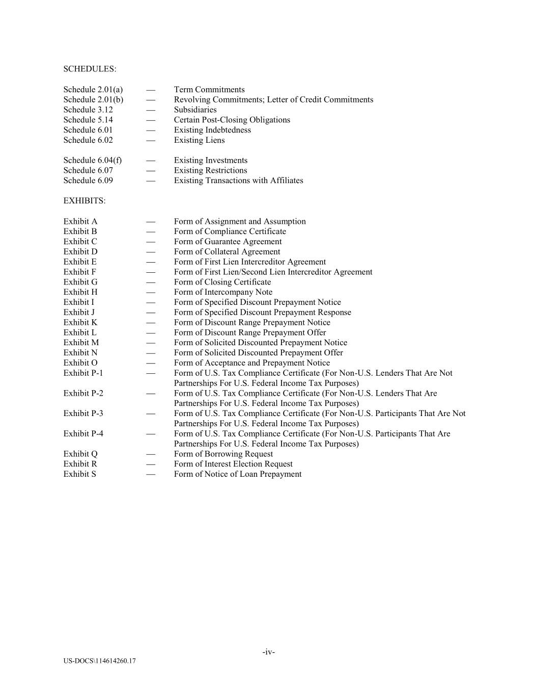 SCHEDULES: Schedule 2.01(a) Term Commitments Schedule 2.01(b) Revolving Commitments; Letter of Credit Commitments Schedule 3.12 Subsidiaries Schedule 5.14 Certain Post-Closing Obligations Schedule 6.01 Existing Indebtedness Schedule 6.02 Existing Liens Schedule 6.04(f) Existing Investments Schedule 6.07 Existing Restrictions Schedule 6.09 Existing Transactions with Affiliates EXHIBITS: Exhibit A Form of Assignment and Assumption Exhibit B Form of Compliance Certificate Exhibit C Form of Guarantee Agreement Exhibit D Form of Collateral Agreement Exhibit E Form of First Lien Intercreditor Agreement Exhibit F Form of First Lien/Second Lien Intercreditor Agreement Exhibit G Form of Closing Certificate Exhibit H Form of Intercompany Note Exhibit I Form of Specified Discount Prepayment Notice Exhibit J Form of Specified Discount Prepayment Response Exhibit K Form of Discount Range Prepayment Notice Exhibit L Form of Discount Range Prepayment Offer Exhibit M Form of Solicited Discounted Prepayment Notice Exhibit N Form of Solicited Discounted Prepayment Offer Exhibit O Form of Acceptance and Prepayment Notice Exhibit P-1 Form of U.S. Tax Compliance Certificate (For Non-U.S. Lenders That Are Not Partnerships For U.S. Federal Income Tax Purposes) Exhibit P-2 Form of U.S. Tax Compliance Certificate (For Non-U.S. Lenders That Are Partnerships For U.S. Federal Income Tax Purposes) Exhibit P-3 Form of U.S. Tax Compliance Certificate (For Non-U.S. Participants That Are Not Partnerships For U.S. Federal Income Tax Purposes) Exhibit P-4 Form of U.S. Tax Compliance Certificate (For Non-U.S. Participants That Are Partnerships For U.S. Federal Income Tax Purposes) Exhibit Q Form of Borrowing Request Exhibit R Form of Interest Election Request Exhibit S Form of Notice of Loan Prepayment -iv- US-DOCS\114614260.17
