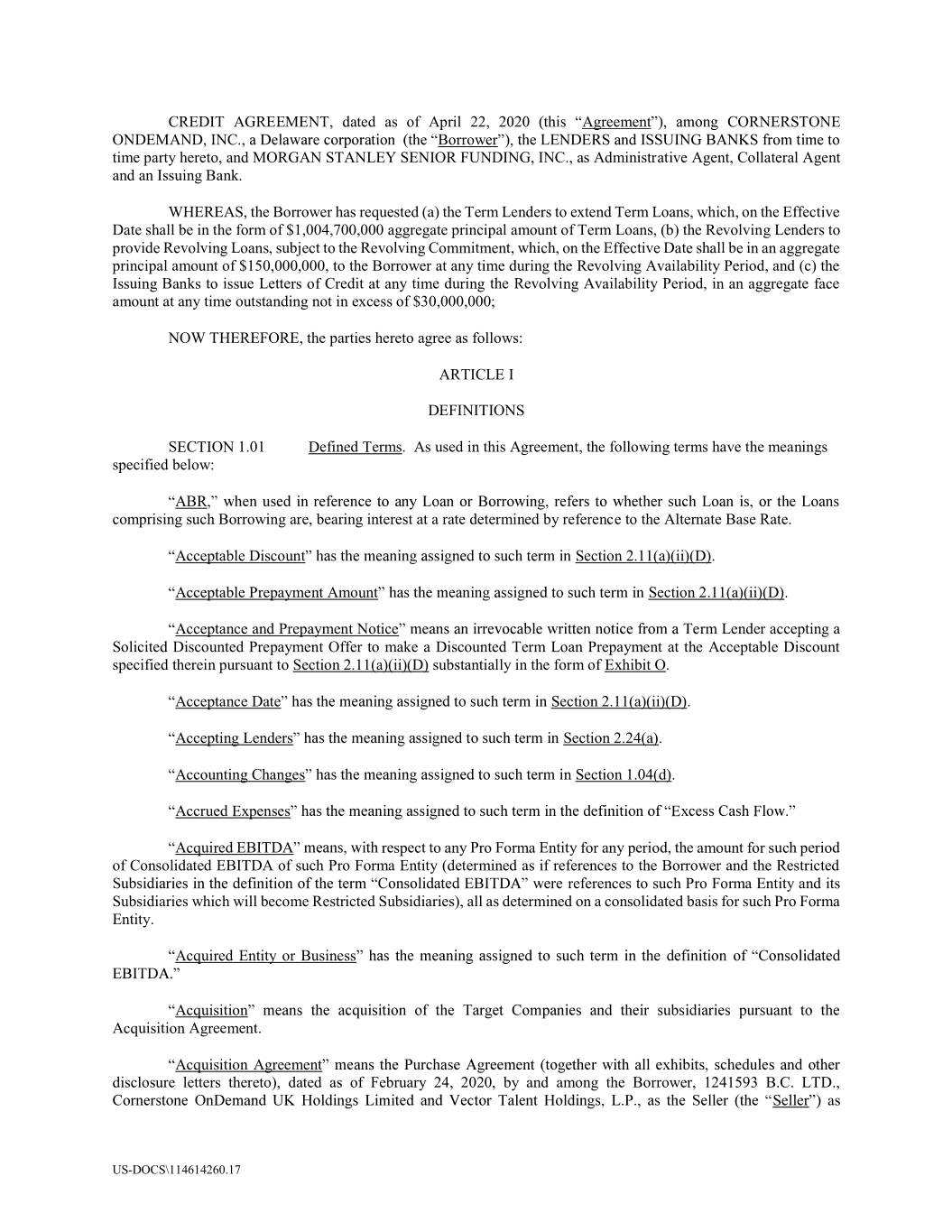 CREDIT AGREEMENT, dated as of April 22 Agreement CORNERSTONE ONDEMAND, INC., Borrower time party hereto, and MORGAN STANLEY SENIOR FUNDING, INC., as Administrative Agent, Collateral Agent and an Issuing Bank. WHEREAS, the Borrower has requested (a) the Term Lenders to extend Term Loans, which, on the Effective Date shall be in the form of $1,004,700,000 aggregate principal amount of Term Loans, (b) the Revolving Lenders to provide Revolving Loans, subject to the Revolving Commitment, which, on the Effective Date shall be in an aggregate principal amount of $150,000,000, to the Borrower at any time during the Revolving Availability Period, and (c) the Issuing Banks to issue Letters of Credit at any time during the Revolving Availability Period, in an aggregate face amount at any time outstanding not in excess of $30,000,000; NOW THEREFORE, the parties hereto agree as follows: ARTICLE I DEFINITIONS SECTION 1.01 Defined Terms. As used in this Agreement, the following terms have the meanings specified below: ABR comprising such Borrowing are, bearing interest at a rate determined by reference to the Alternate Base Rate. Acceptable Discount Section 2.11(a)(ii)(D). Acceptable Prepayment Amount Section 2.11(a)(ii)(D). Acceptance and Prepayment Notice rm Lender accepting a Solicited Discounted Prepayment Offer to make a Discounted Term Loan Prepayment at the Acceptable Discount specified therein pursuant to Section 2.11(a)(ii)(D) substantially in the form of Exhibit O. Acceptance Date Section 2.11(a)(ii)(D). Accepting Lenders Section 2.24(a). Accounting Changes n Section 1.04(d). Accrued Expenses Acquired EBITDA respect to any Pro Forma Entity for any period, the amount for such period of Consolidated EBITDA of such Pro Forma Entity (determined as if references to the Borrower and the Restricted references to such Pro Forma Entity and its Subsidiaries which will become Restricted Subsidiaries), all as determined on a consolidated basis for such Pro Forma Entity. Acquired Entity or Business Acquisition Acquisition Agreement. Acquisition Agreement disclosure letters thereto), dated as of February 24, 2020, by and among the Borrower, 1241593 B.C. LTD., Seller as US-DOCS\114614260.17