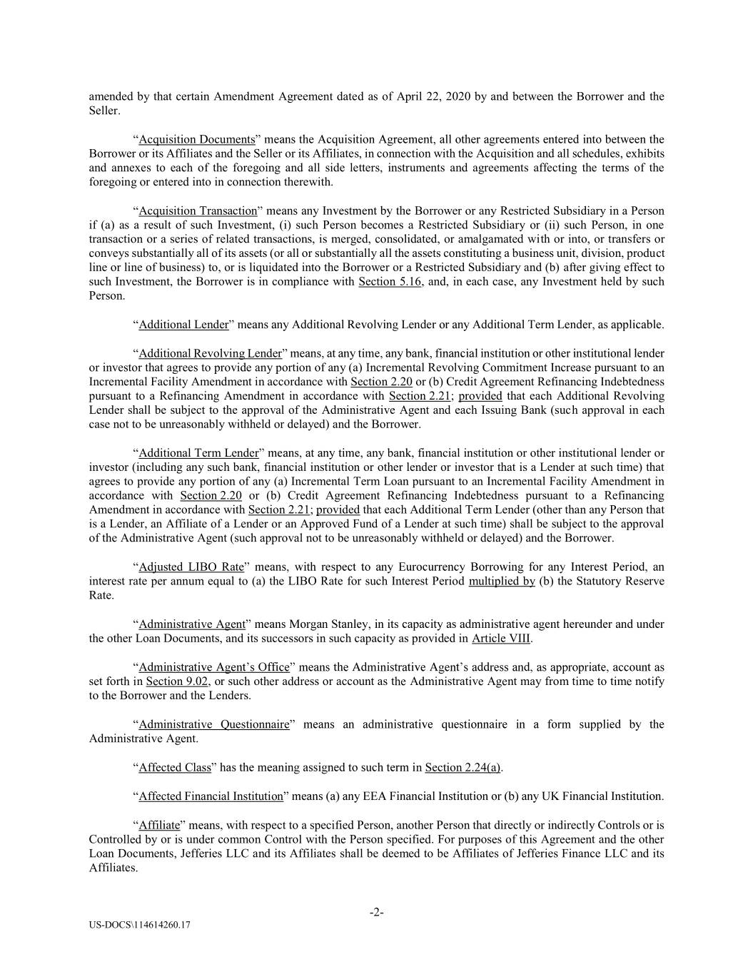 amended by that certain Amendment Agreement dated as of April 22, 2020 by and between the Borrower and the Seller. Acquisition Documents Borrower or its Affiliates and the Seller or its Affiliates, in connection with the Acquisition and all schedules, exhibits and annexes to each of the foregoing and all side letters, instruments and agreements affecting the terms of the foregoing or entered into in connection therewith. Acquisition Transaction Borrower or any Restricted Subsidiary in a Person if (a) as a result of such Investment, (i) such Person becomes a Restricted Subsidiary or (ii) such Person, in one transaction or a series of related transactions, is merged, consolidated, or amalgamated with or into, or transfers or conveys substantially all of its assets (or all or substantially all the assets constituting a business unit, division, product line or line of business) to, or is liquidated into the Borrower or a Restricted Subsidiary and (b) after giving effect to such Investment, the Borrower is in compliance with Section 5.16, and, in each case, any Investment held by such Person. Additional Lender Additional Revolving Lender or investor that agrees to provide any portion of any (a) Incremental Revolving Commitment Increase pursuant to an Incremental Facility Amendment in accordance with Section 2.20 or (b) Credit Agreement Refinancing Indebtedness pursuant to a Refinancing Amendment in accordance with Section 2.21; provided that each Additional Revolving Lender shall be subject to the approval of the Administrative Agent and each Issuing Bank (such approval in each case not to be unreasonably withheld or delayed) and the Borrower. Additional Term Lender any bank, financial institution or other institutional lender or investor (including any such bank, financial institution or other lender or investor that is a Lender at such time) that agrees to provide any portion of any (a) Incremental Term Loan pursuant to an Incremental Facility Amendment in accordance with Section 2.20 or (b) Credit Agreement Refinancing Indebtedness pursuant to a Refinancing Amendment in accordance with Section 2.21; provided that each Additional Term Lender (other than any Person that is a Lender, an Affiliate of a Lender or an Approved Fund of a Lender at such time) shall be subject to the approval of the Administrative Agent (such approval not to be unreasonably withheld or delayed) and the Borrower. Adjusted LIBO Rate interest rate per annum equal to (a) the LIBO Rate for such Interest Period multiplied by (b) the Statutory Reserve Rate. Administrative Agent the other Loan Documents, and its successors in such capacity as provided in Article VIII. set forth in Section 9.02, or such other address or account as the Administrative Agent may from time to time notify to the Borrower and the Lenders. Administrative Questionnaire Administrative Agent. Affected Class n Section 2.24(a). Affected Financial Institution Affiliate with respect to a specified Person, another Person that directly or indirectly Controls or is Controlled by or is under common Control with the Person specified. For purposes of this Agreement and the other Loan Documents, Jefferies LLC and its Affiliates shall be deemed to be Affiliates of Jefferies Finance LLC and its Affiliates. -2- US-DOCS\114614260.17