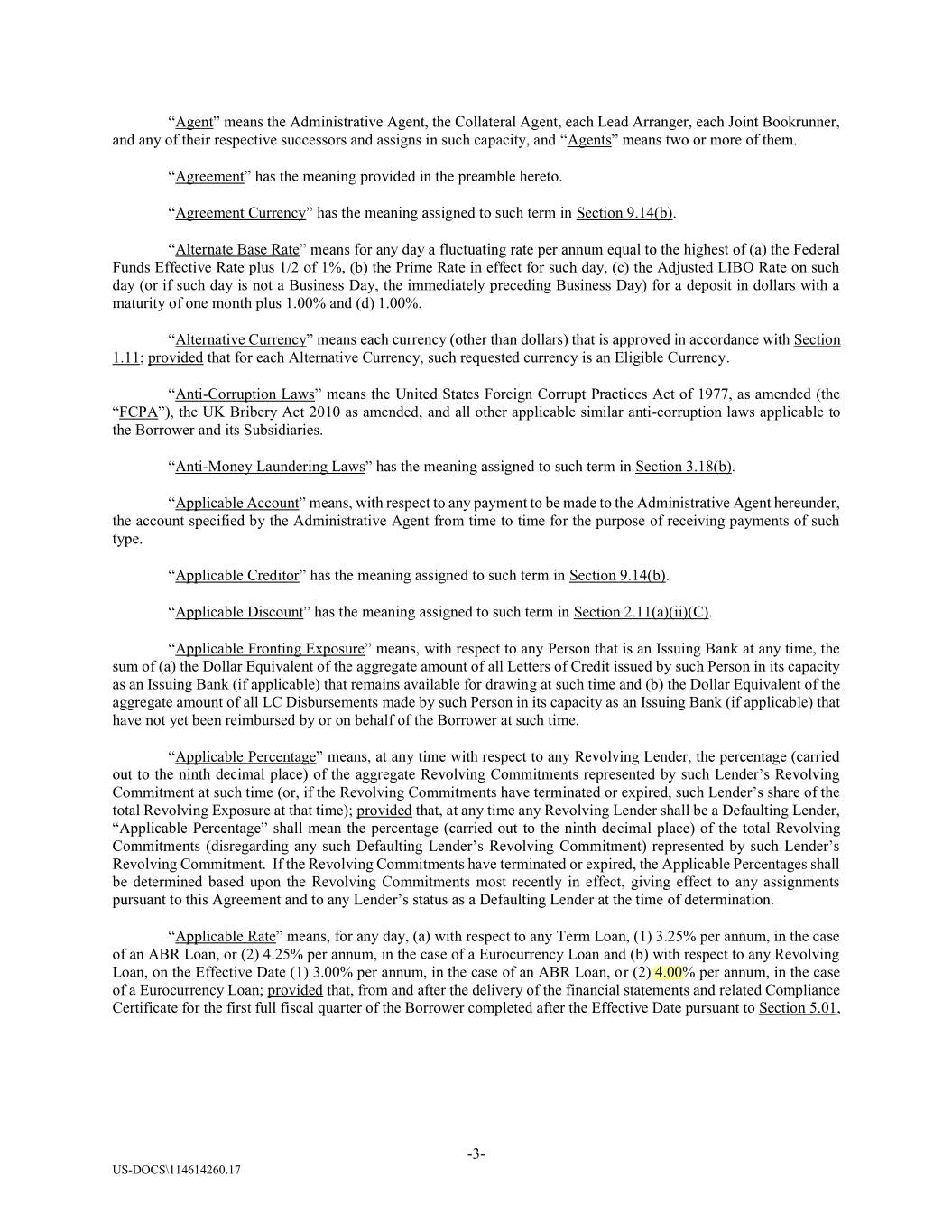 Agent and any of their respective successors and assigns in such capacity, and Agents Agreement Agreement Currency Section 9.14(b). Alternate Base Rate Funds Effective Rate plus 1/2 of 1%, (b) the Prime Rate in effect for such day, (c) the Adjusted LIBO Rate on such day (or if such day is not a Business Day, the immediately preceding Business Day) for a deposit in dollars with a maturity of one month plus 1.00% and (d) 1.00%. Alternative Currency Section 1.11; provided that for each Alternative Currency, such requested currency is an Eligible Currency. Anti-Corruption Laws ces Act of 1977, as amended (the FCPA the UK Bribery Act 2010 as amended, and all other applicable similar anti-corruption laws applicable to the Borrower and its Subsidiaries. Anti-Money Laundering Laws Section 3.18(b). Applicable Account the account specified by the Administrative Agent from time to time for the purpose of receiving payments of such type. Applicable Creditor Section 9.14(b). Applicable Discount Section 2.11(a)(ii)(C). Applicable Fronting Exposure with respect to any Person that is an Issuing Bank at any time, the sum of (a) the Dollar Equivalent of the aggregate amount of all Letters of Credit issued by such Person in its capacity as an Issuing Bank (if applicable) that remains available for drawing at such time and (b) the Dollar Equivalent of the aggregate amount of all LC Disbursements made by such Person in its capacity as an Issuing Bank (if applicable) that have not yet been reimbursed by or on behalf of the Borrower at such time. Applicable Percentage Commitment at such time (or, if the Revolving Commitm total Revolving Exposure at that time); provided that, at any time any Revolving Lender shall be a Defaulting Lender, cimal place) of the total Revolving Revolving Commitment. If the Revolving Commitments have terminated or expired, the Applicable Percentages shall be determined based upon the Revolving Commitments most recently in effect, giving effect to any assignments Applicable Rate with respect to any Term Loan, (1) 3.25% per annum, in the case of an ABR Loan, or (2) 4.25% per annum, in the case of a Eurocurrency Loan and (b) with respect to any Revolving Loan, on the Effective Date (1) 3.00% per annum, in the case of an ABR Loan, orr (2) 4.00% per annum, in the case of a Eurocurrency Loan; provided that, from and after the delivery of the financial statements and related Compliance Certificate for the first full fiscal quarter of the Borrower completed after the Effective Date pursuant to Section 5.01, -3- US-DOCS\114614260.17