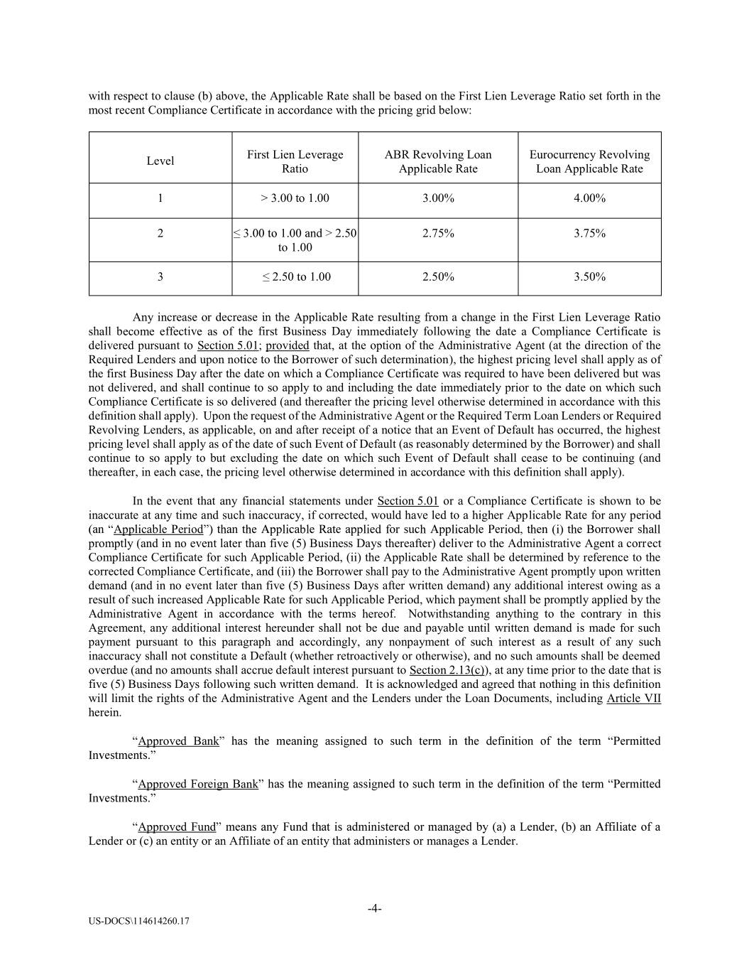 with respect to clause (b) above, the Applicable Rate shall be based on the First Lien Leverage Ratio set forth in the most recent Compliance Certificate in accordance with the pricing grid below: First Lien Leverage ABR Revolving Loan Eurocurrency Revolving Level Ratio Applicable Rate Loan Applicable Rate 1 > 3.00 to 1.00 3.00% 4.00% 2 2.75% 3.75% to 1.00 3 2.50% 3.50% Any increase or decrease in the Applicable Rate resulting from a change in the First Lien Leverage Ratio shall become effective as of the first Business Day immediately following the date a Compliance Certificate is delivered pursuant to Section 5.01; provided that, at the option of the Administrative Agent (at the direction of the Required Lenders and upon notice to the Borrower of such determination), the highest pricing level shall apply as of the first Business Day after the date on which a Compliance Certificate was required to have been delivered but was not delivered, and shall continue to so apply to and including the date immediately prior to the date on which such Compliance Certificate is so delivered (and thereafter the pricing level otherwise determined in accordance with this definition shall apply). Upon the request of the Administrative Agent or the Required Term Loan Lenders or Required Revolving Lenders, as applicable, on and after receipt of a notice that an Event of Default has occurred, the highest pricing level shall apply as of the date of such Event of Default (as reasonably determined by the Borrower) and shall continue to so apply to but excluding the date on which such Event of Default shall cease to be continuing (and thereafter, in each case, the pricing level otherwise determined in accordance with this definition shall apply). In the event that any financial statements under Section 5.01 or a Compliance Certificate is shown to be inaccurate at any time and such inaccuracy, if corrected, would have led to a higher Applicable Rate for any period Applicable Period promptly (and in no event later than five (5) Business Days thereafter) deliver to the Administrative Agent a correct Compliance Certificate for such Applicable Period, (ii) the Applicable Rate shall be determined by reference to the corrected Compliance Certificate, and (iii) the Borrower shall pay to the Administrative Agent promptly upon written demand (and in no event later than five (5) Business Days after written demand) any additional interest owing as a result of such increased Applicable Rate for such Applicable Period, which payment shall be promptly applied by the Administrative Agent in accordance with the terms hereof. Notwithstanding anything to the contrary in this Agreement, any additional interest hereunder shall not be due and payable until written demand is made for such payment pursuant to this paragraph and accordingly, any nonpayment of such interest as a result of any such inaccuracy shall not constitute a Default (whether retroactively or otherwise), and no such amounts shall be deemed overdue (and no amounts shall accrue default interest pursuant to Section 2.13(c)), at any time prior to the date that is five (5) Business Days following such written demand. It is acknowledged and agreed that nothing in this definition will limit the rights of the Administrative Agent and the Lenders under the Loan Documents, including Article VII herein. Approved Bank Approved Foreign Bank Approved Fund Lender or (c) an entity or an Affiliate of an entity that administers or manages a Lender. -4- US-DOCS\114614260.17