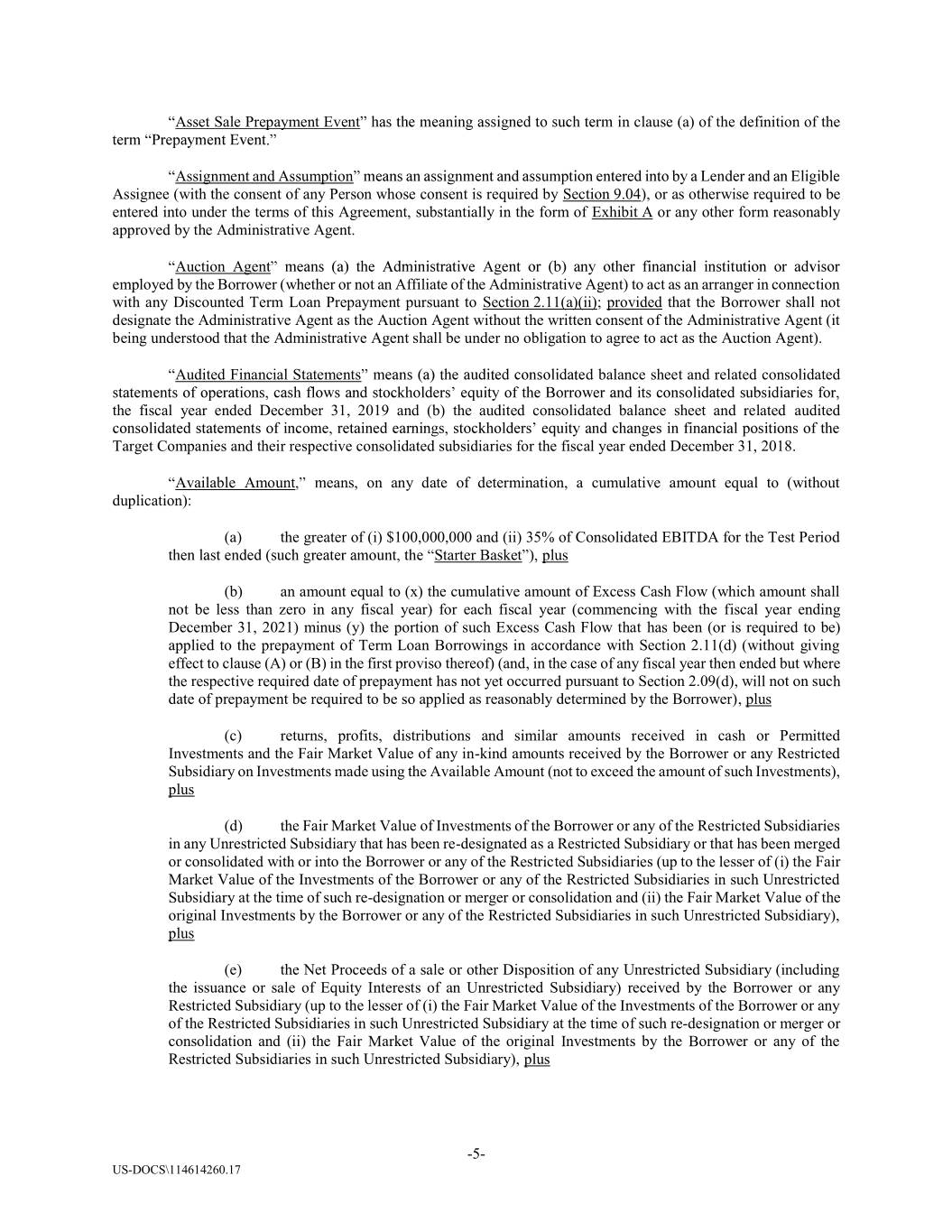 Asset Sale Prepayment Event n clause (a) of the definition of the Assignment and Assumption Assignee (with the consent of any Person whose consent is required by Section 9.04), or as otherwise required to be entered into under the terms of this Agreement, substantially in the form of Exhibit A or any other form reasonably approved by the Administrative Agent. Auction Agent employed by the Borrower (whether or not an Affiliate of the Administrative Agent) to act as an arranger in connection with any Discounted Term Loan Prepayment pursuant to Section 2.11(a)(ii); provided that the Borrower shall not designate the Administrative Agent as the Auction Agent without the written consent of the Administrative Agent (it being understood that the Administrative Agent shall be under no obligation to agree to act as the Auction Agent). Audited Financial Statements d balance sheet and related consolidated the fiscal year ended December 31, 2019 and (b) the audited consolidated balance sheet and related audited Target Companies and their respective consolidated subsidiaries for the fiscal year ended December 31, 2018. Available Amount eans, on any date of determination, a cumulative amount equal to (without duplication): (a) the greater of (i) $100,000,000 and (ii) 35% of Consolidated EBITDA for the Test Period Starter Basket plus (b) an amount equal to (x) the cumulative amount of Excess Cash Flow (which amount shall not be less than zero in any fiscal year) for each fiscal year (commencing with the fiscal year ending December 31, 2021) minus (y) the portion of such Excess Cash Flow that has been (or is required to be) applied to the prepayment of Term Loan Borrowings in accordance with Section 2.11(d) (without giving effect to clause (A) or (B) in the first proviso thereof) (and, in the case of any fiscal year then ended but where the respective required date of prepayment has not yet occurred pursuant to Section 2.09(d), will not on such date of prepayment be required to be so applied as reasonably determined by the Borrower), plus (c) returns, profits, distributions and similar amounts received in cash or Permitted Investments and the Fair Market Value of any in-kind amounts received by the Borrower or any Restricted Subsidiary on Investments made using the Available Amount (not to exceed the amount of such Investments), plus (d) the Fair Market Value of Investments of the Borrower or any of the Restricted Subsidiaries in any Unrestricted Subsidiary that has been re-designated as a Restricted Subsidiary or that has been merged or consolidated with or into the Borrower or any of the Restricted Subsidiaries (up to the lesser of (i) the Fair Market Value of the Investments of the Borrower or any of the Restricted Subsidiaries in such Unrestricted Subsidiary at the time of such re-designation or merger or consolidation and (ii) the Fair Market Value of the original Investments by the Borrower or any of the Restricted Subsidiaries in such Unrestricted Subsidiary), plus (e) the Net Proceeds of a sale or other Disposition of any Unrestricted Subsidiary (including the issuance or sale of Equity Interests of an Unrestricted Subsidiary) received by the Borrower or any Restricted Subsidiary (up to the lesser of (i) the Fair Market Value of the Investments of the Borrower or any of the Restricted Subsidiaries in such Unrestricted Subsidiary at the time of such re-designation or merger or consolidation and (ii) the Fair Market Value of the original Investments by the Borrower or any of the Restricted Subsidiaries in such Unrestricted Subsidiary), plus -5- US-DOCS\114614260.17