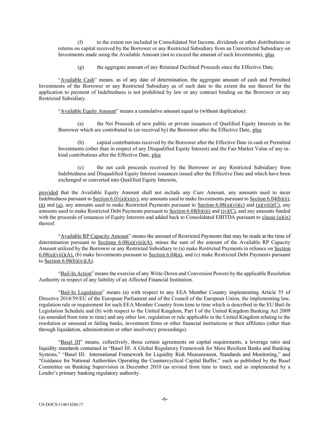 (f) to the extent not included in Consolidated Net Income, dividends or other distributions or returns on capital received by the Borrower or any Restricted Subsidiary from an Unrestricted Subsidiary on Investments made using the Available Amount (not to exceed the amount of such Investments), plus (g) the aggregate amount of any Retained Declined Proceeds since the Effective Date. Available Cash Investments of the Borrower or any Restricted Subsidiary as of such date to the extent the use thereof for the application to payment of Indebtedness is not prohibited by law or any contract binding on the Borrower or any Restricted Subsidiary. Available Equity Amount (a) the Net Proceeds of new public or private issuances of Qualified Equity Interests in the Borrower which are contributed to (or received by) the Borrower after the Effective Date, plus (b) capital contributions received by the Borrower after the Effective Date in cash or Permitted Investments (other than in respect of any Disqualified Equity Interest) and the Fair Market Value of any in- kind contributions after the Effective Date, plus (c) the net cash proceeds received by the Borrower or any Restricted Subsidiary from Indebtedness and Disqualified Equity Interest issuances issued after the Effective Date and which have been exchanged or converted into Qualified Equity Interests, provided that the Available Equity Amount shall not include any Cure Amount, any amounts used to incur Indebtedness pursuant to Section 6.01(a)(xxiv), any amounts used to make Investments pursuant to Section 6.04(b)(ii), (n) and (q), any amounts used to make Restricted Payments pursuant to Section 6.08(a)(vi)(c) and (a)(viii)(C), any amounts used to make Restricted Debt Payments pursuant to Section 6.08(b)(iii) and (iv)(C), and any amounts funded with the proceeds of issuances of Equity Interests and added back to Consolidated EBITDA pursuant to clause (a)(ix) thereof. Available RP Capacity Amount determination pursuant to Sections 6.08(a)(viii)(A), minus the sum of the amount of the Available RP Capacity Amount utilized by the Borrower or any Restricted Subsidiary to (a) make Restricted Payments in reliance on Section 6.08(a)(viii)(A), (b) make Investments pursuant to Section 6.04(n), and (c) make Restricted Debt Payments pursuant to Section 6.08(b)(iv)(A). Bail-In Action -Down and Conversion Powers by the applicable Resolution Authority in respect of any liability of an Affected Financial Institution. Bail-In Legislation Directive 2014/59/EU of the European Parliament and of the Council of the European Union, the implementing law, regulation rule or requirement for such EEA Member Country from time to time which is described in the EU Bail-In Legislation Schedule and (b) with respect to the United Kingdom, Part I of the United Kingdom Banking Act 2009 (as amended from time to time) and any other law, regulation or rule applicable in the United Kingdom relating to the resolution or unsound or failing banks, investment firms or other financial institutions or their affiliates (other than through liquidation, administration or other insolvency proceedings). Basel III Global Regulatory Framework for More Resilient Banks and Banking each as published by the Basel Committee on Banking Supervision in December 2010 (as revised from time to time), and as implemented by a -6- US-DOCS\114614260.17