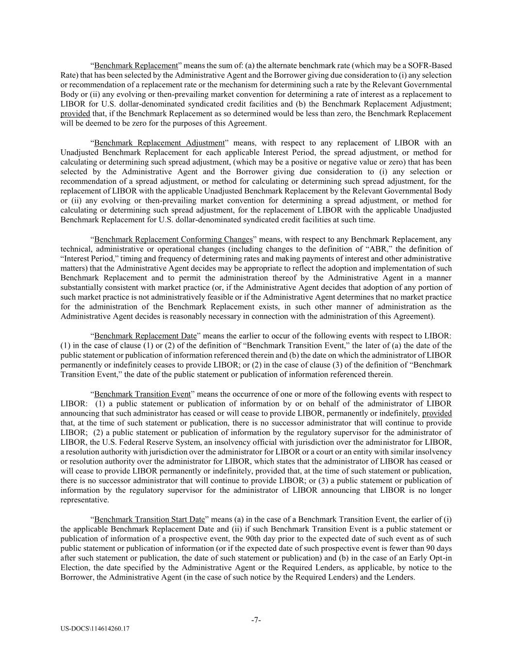 Benchmark Replacement ate (which may be a SOFR-Based Rate) that has been selected by the Administrative Agent and the Borrower giving due consideration to (i) any selection or recommendation of a replacement rate or the mechanism for determining such a rate by the Relevant Governmental Body or (ii) any evolving or then-prevailing market convention for determining a rate of interest as a replacement to LIBOR for U.S. dollar-denominated syndicated credit facilities and (b) the Benchmark Replacement Adjustment; provided that, if the Benchmark Replacement as so determined would be less than zero, the Benchmark Replacement will be deemed to be zero for the purposes of this Agreement. Benchmark Replacement Adjustment Unadjusted Benchmark Replacement for each applicable Interest Period, the spread adjustment, or method for calculating or determining such spread adjustment, (which may be a positive or negative value or zero) that has been selected by the Administrative Agent and the Borrower giving due consideration to (i) any selection or recommendation of a spread adjustment, or method for calculating or determining such spread adjustment, for the replacement of LIBOR with the applicable Unadjusted Benchmark Replacement by the Relevant Governmental Body or (ii) any evolving or then-prevailing market convention for determining a spread adjustment, or method for calculating or determining such spread adjustment, for the replacement of LIBOR with the applicable Unadjusted Benchmark Replacement for U.S. dollar-denominated syndicated credit facilities at such time. Benchmark Replacement Conforming Changes technical, administrative or operational changes (including changes to the def matters) that the Administrative Agent decides may be appropriate to reflect the adoption and implementation of such Benchmark Replacement and to permit the administration thereof by the Administrative Agent in a manner substantially consistent with market practice (or, if the Administrative Agent decides that adoption of any portion of such market practice is not administratively feasible or if the Administrative Agent determines that no market practice for the administration of the Benchmark Replacement exists, in such other manner of administration as the Administrative Agent decides is reasonably necessary in connection with the administration of this Agreement). Benchmark Replacement Date later of (a) the date of the public statement or publication of information referenced therein and (b) the date on which the administrator of LIBOR permanently or indefinitely ceases to provide LIBOR; or (2) in the case of clause (3) of the definition of Benchmark Transition Event LIBOR: (1) a public statement or publication of information by or on behalf of the administrator of LIBOR announcing that such administrator has ceased or will cease to provide LIBOR, permanently or indefinitely, provided that, at the time of such statement or publication, there is no successor administrator that will continue to provide LIBOR; (2) a public statement or publication of information by the regulatory supervisor for the administrator of LIBOR, the U.S. Federal Reserve System, an insolvency official with jurisdiction over the administrator for LIBOR, a resolution authority with jurisdiction over the administrator for LIBOR or a court or an entity with similar insolvency or resolution authority over the administrator for LIBOR, which states that the administrator of LIBOR has ceased or will cease to provide LIBOR permanently or indefinitely, provided that, at the time of such statement or publication, there is no successor administrator that will continue to provide LIBOR; or (3) a public statement or publication of information by the regulatory supervisor for the administrator of LIBOR announcing that LIBOR is no longer representative. Benchmark Transition Start Date the applicable Benchmark Replacement Date and (ii) if such Benchmark Transition Event is a public statement or publication of information of a prospective event, the 90th day prior to the expected date of such event as of such public statement or publication of information (or if the expected date of such prospective event is fewer than 90 days after such statement or publication, the date of such statement or publication) and (b) in the case of an Early Opt-in Election, the date specified by the Administrative Agent or the Required Lenders, as applicable, by notice to the Borrower, the Administrative Agent (in the case of such notice by the Required Lenders) and the Lenders. -7- US-DOCS\114614260.17