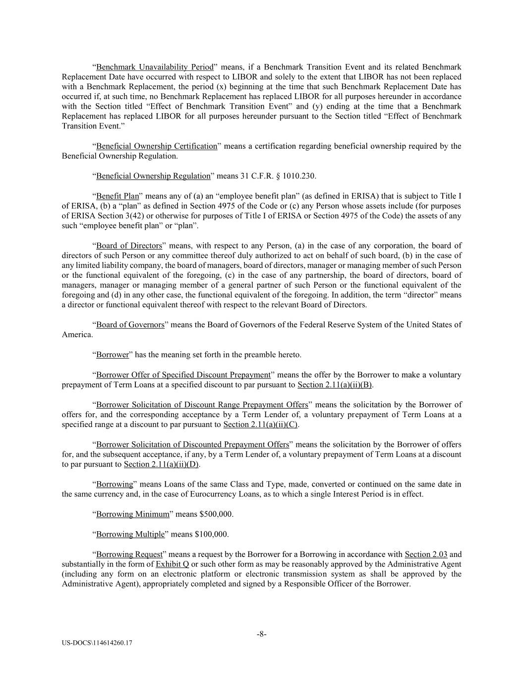 Benchmark Unavailability Period Replacement Date have occurred with respect to LIBOR and solely to the extent that LIBOR has not been replaced with a Benchmark Replacement, the period (x) beginning at the time that such Benchmark Replacement Date has occurred if, at such time, no Benchmark Replacement has replaced LIBOR for all purposes hereunder in accordance of Benchmark Beneficial Ownership Certification Beneficial Ownership Regulation. Beneficial Ownership Regulation Benefit Plan of ERISA Section 3(42) or otherwise for purposes of Title I of ERISA or Section 4975 of the Code) the assets of any Board of Directors directors of such Person or any committee thereof duly authorized to act on behalf of such board, (b) in the case of any limited liability company, the board of managers, board of directors, manager or managing member of such Person or the functional equivalent of the foregoing, (c) in the case of any partnership, the board of directors, board of managers, manager or managing member of a general partner of such Person or the functional equivalent of the foregoing and (d) in any other case, the functional equivalent of the foregoing. In addition, the term a director or functional equivalent thereof with respect to the relevant Board of Directors. Board of Governors America. Borrower rth in the preamble hereto. Borrower Offer of Specified Discount Prepayment prepayment of Term Loans at a specified discount to par pursuant to Section 2.11(a)(ii)(B). Borrower Solicitation of Discount Range Prepayment Offers offers for, and the corresponding acceptance by a Term Lender of, a voluntary prepayment of Term Loans at a specified range at a discount to par pursuant to Section 2.11(a)(ii)(C). Borrower Solicitation of Discounted Prepayment Offers for, and the subsequent acceptance, if any, by a Term Lender of, a voluntary prepayment of Term Loans at a discount to par pursuant to Section 2.11(a)(ii)(D). Borrowing the same currency and, in the case of Eurocurrency Loans, as to which a single Interest Period is in effect. Borrowing Minimum Borrowing Multiple Borrowing Request Section 2.03 and substantially in the form of Exhibit Q or such other form as may be reasonably approved by the Administrative Agent (including any form on an electronic platform or electronic transmission system as shall be approved by the Administrative Agent), appropriately completed and signed by a Responsible Officer of the Borrower. -8- US-DOCS\114614260.17