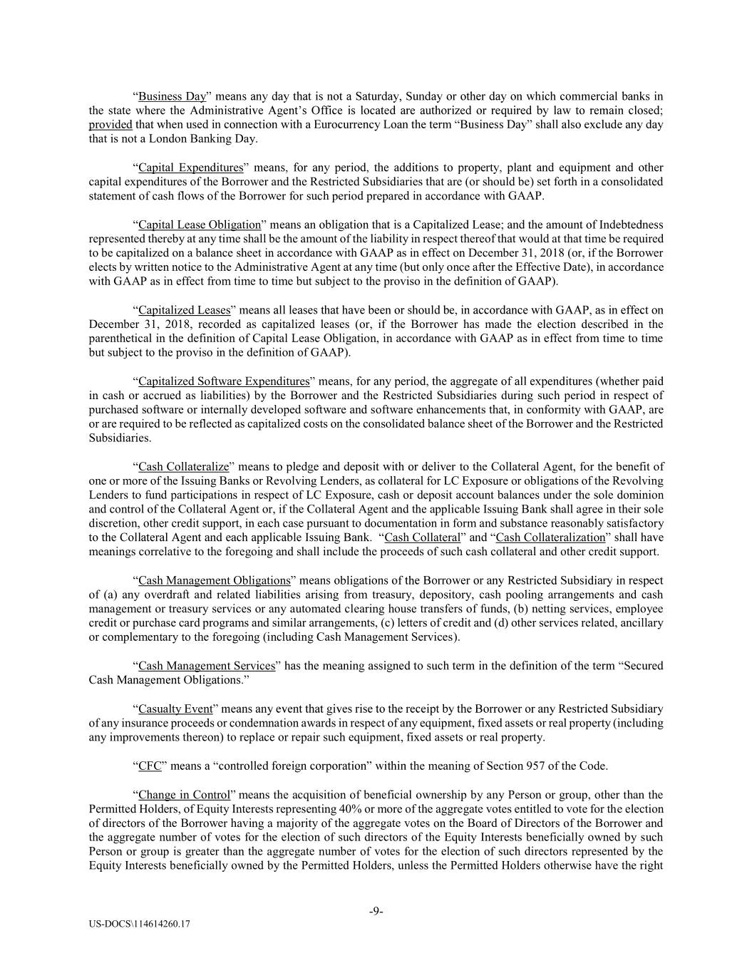Business Day the state where t provided that is not a London Banking Day. Capital Expenditures capital expenditures of the Borrower and the Restricted Subsidiaries that are (or should be) set forth in a consolidated statement of cash flows of the Borrower for such period prepared in accordance with GAAP. Capital Lease Obligation represented thereby at any time shall be the amount of the liability in respect thereof that would at that time be required to be capitalized on a balance sheet in accordance with GAAP as in effect on December 31, 2018 (or, if the Borrower elects by written notice to the Administrative Agent at any time (but only once after the Effective Date), in accordance with GAAP as in effect from time to time but subject to the proviso in the definition of GAAP). Capitalized Leases December 31, 2018, recorded as capitalized leases (or, if the Borrower has made the election described in the parenthetical in the definition of Capital Lease Obligation, in accordance with GAAP as in effect from time to time but subject to the proviso in the definition of GAAP). Capitalized Software Expenditures in cash or accrued as liabilities) by the Borrower and the Restricted Subsidiaries during such period in respect of purchased software or internally developed software and software enhancements that, in conformity with GAAP, are or are required to be reflected as capitalized costs on the consolidated balance sheet of the Borrower and the Restricted Subsidiaries. Cash Collateralize to the Collateral Agent, for the benefit of one or more of the Issuing Banks or Revolving Lenders, as collateral for LC Exposure or obligations of the Revolving Lenders to fund participations in respect of LC Exposure, cash or deposit account balances under the sole dominion and control of the Collateral Agent or, if the Collateral Agent and the applicable Issuing Bank shall agree in their sole discretion, other credit support, in each case pursuant to documentation in form and substance reasonably satisfactory Cash Collateral Cash Collateralization meanings correlative to the foregoing and shall include the proceeds of such cash collateral and other credit support. Cash Management Obligations of (a) any overdraft and related liabilities arising from treasury, depository, cash pooling arrangements and cash management or treasury services or any automated clearing house transfers of funds, (b) netting services, employee credit or purchase card programs and similar arrangements, (c) letters of credit and (d) other services related, ancillary or complementary to the foregoing (including Cash Management Services). Cash Management Services Casualty Event of any insurance proceeds or condemnation awards in respect of any equipment, fixed assets or real property (including any improvements thereon) to replace or repair such equipment, fixed assets or real property. CFC the meaning of Section 957 of the Code. Change in Control means the acquisition of beneficial ownership by any Person or group, other than the Permitted Holders, of Equity Interests representing 40% or more of the aggregate votes entitled to vote for the election of directors of the Borrower having a majority of the aggregate votes on the Board of Directors of the Borrower and the aggregate number of votes for the election of such directors of the Equity Interests beneficially owned by such Person or group is greater than the aggregate number of votes for the election of such directors represented by the Equity Interests beneficially owned by the Permitted Holders, unless the Permitted Holders otherwise have the right -9- US-DOCS\114614260.17