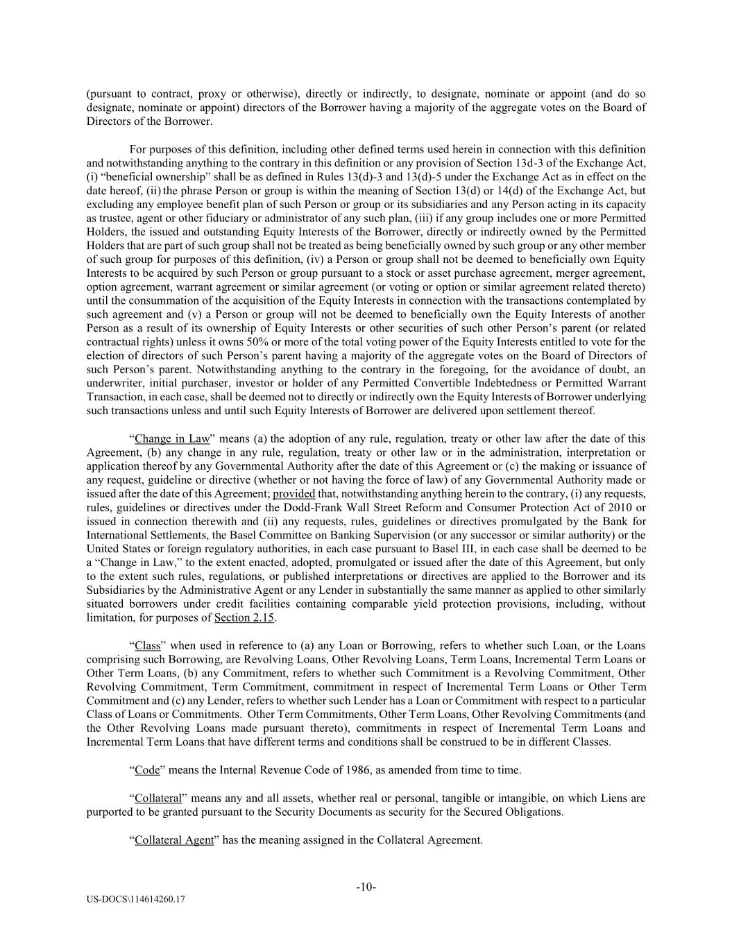 (pursuant to contract, proxy or otherwise), directly or indirectly, to designate, nominate or appoint (and do so designate, nominate or appoint) directors of the Borrower having a majority of the aggregate votes on the Board of Directors of the Borrower. For purposes of this definition, including other defined terms used herein in connection with this definition and notwithstanding anything to the contrary in this definition or any provision of Section 13d-3 of the Exchange Act, -3 and 13(d)-5 under the Exchange Act as in effect on the date hereof, (ii) the phrase Person or group is within the meaning of Section 13(d) or 14(d) of the Exchange Act, but excluding any employee benefit plan of such Person or group or its subsidiaries and any Person acting in its capacity as trustee, agent or other fiduciary or administrator of any such plan, (iii) if any group includes one or more Permitted Holders, the issued and outstanding Equity Interests of the Borrower, directly or indirectly owned by the Permitted Holders that are part of such group shall not be treated as being beneficially owned by such group or any other member of such group for purposes of this definition, (iv) a Person or group shall not be deemed to beneficially own Equity Interests to be acquired by such Person or group pursuant to a stock or asset purchase agreement, merger agreement, option agreement, warrant agreement or similar agreement (or voting or option or similar agreement related thereto) until the consummation of the acquisition of the Equity Interests in connection with the transactions contemplated by such agreement and (v) a Person or group will not be deemed to beneficially own the Equity Interests of another Person as a result of its ownership of Equity Interes contractual rights) unless it owns 50% or more of the total voting power of the Equity Interests entitled to vote for the e aggregate votes on the Board of Directors of Notwithstanding anything to the contrary in the foregoing, for the avoidance of doubt, an underwriter, initial purchaser, investor or holder of any Permitted Convertible Indebtedness or Permitted Warrant Transaction, in each case, shall be deemed not to directly or indirectly own the Equity Interests of Borrower underlying such transactions unless and until such Equity Interests of Borrower are delivered upon settlement thereof. Change in Law the adoption of any rule, regulation, treaty or other law after the date of this Agreement, (b) any change in any rule, regulation, treaty or other law or in the administration, interpretation or application thereof by any Governmental Authority after the date of this Agreement or (c) the making or issuance of any request, guideline or directive (whether or not having the force of law) of any Governmental Authority made or issued after the date of this Agreement; provided that, notwithstanding anything herein to the contrary, (i) any requests, rules, guidelines or directives under the Dodd-Frank Wall Street Reform and Consumer Protection Act of 2010 or issued in connection therewith and (ii) any requests, rules, guidelines or directives promulgated by the Bank for International Settlements, the Basel Committee on Banking Supervision (or any successor or similar authority) or the United States or foreign regulatory authorities, in each case pursuant to Basel III, in each case shall be deemed to be to the extent such rules, regulations, or published interpretations or directives are applied to the Borrower and its Subsidiaries by the Administrative Agent or any Lender in substantially the same manner as applied to other similarly situated borrowers under credit facilities containing comparable yield protection provisions, including, without limitation, for purposes of Section 2.15. Class comprising such Borrowing, are Revolving Loans, Other Revolving Loans, Term Loans, Incremental Term Loans or Other Term Loans, (b) any Commitment, refers to whether such Commitment is a Revolving Commitment, Other Revolving Commitment, Term Commitment, commitment in respect of Incremental Term Loans or Other Term Commitment and (c) any Lender, refers to whether such Lender has a Loan or Commitment with respect to a particular Class of Loans or Commitments. Other Term Commitments, Other Term Loans, Other Revolving Commitments (and the Other Revolving Loans made pursuant thereto), commitments in respect of Incremental Term Loans and Incremental Term Loans that have different terms and conditions shall be construed to be in different Classes. Code m time to time. Collateral purported to be granted pursuant to the Security Documents as security for the Secured Obligations. Collateral Agent ng assigned in the Collateral Agreement. -10- US-DOCS\114614260.17