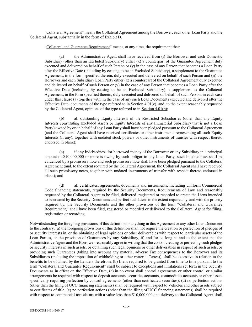 Collateral Agreement Collateral Agent, substantially in the form of Exhibit D. Collateral and Guarantee Requirement time, the requirement that: (a) the Administrative Agent shall have received from (i) the Borrower and each Domestic Subsidiary (other than an Excluded Subsidiary) either (x) a counterpart of the Guarantee Agreement duly executed and delivered on behalf of such Person or (y) in the case of any Person that becomes a Loan Party after the Effective Date (including by ceasing to be an Excluded Subsidiary), a supplement to the Guarantee Agreement, in the form specified therein, duly executed and delivered on behalf of such Person and (ii) the Borrower and each Subsidiary Loan Party either (x) a counterpart of the Collateral Agreement duly executed and delivered on behalf of such Person or (y) in the case of any Person that becomes a Loan Party after the Effective Date (including by ceasing to be an Excluded Subsidiary), a supplement to the Collateral Agreement, in the form specified therein, duly executed and delivered on behalf of such Person, in each case under this clause (a) together with, in the case of any such Loan Documents executed and delivered after the Effective Date, documents of the type referred to in Section 4.01(c), and, to the extent reasonably requested by the Collateral Agent, opinions of the type referred to in Section 4.01(b); (b) all outstanding Equity Interests of the Restricted Subsidiaries (other than any Equity Interests constituting Excluded Assets or Equity Interests of any Immaterial Subsidiary that is not a Loan Party) owned by or on behalf of any Loan Party shall have been pledged pursuant to the Collateral Agreement (and the Collateral Agent shall have received certificates or other instruments representing all such Equity Interests (if any), together with undated stock powers or other instruments of transfer with respect thereto endorsed in blank); (c) if any Indebtedness for borrowed money of the Borrower or any Subsidiary in a principal amount of $10,000,000 or more is owing by such obligor to any Loan Party, such Indebtedness shall be evidenced by a promissory note and such promissory note shall have been pledged pursuant to the Collateral Agreement (and, to the extent required by the Collateral Agreement, the Collateral Agent shall have received all such promissory notes, together with undated instruments of transfer with respect thereto endorsed in blank); and (d) all certificates, agreements, documents and instruments, including Uniform Commercial Code financing statements, required by the Security Documents, Requirements of Law and reasonably requested by the Collateral Agent to be filed, delivered, registered or recorded to create the Liens intended to be created by the Security Documents and perfect such Liens to the extent required by, and with the priority required by, the Se registration or recording. Notwithstanding the foregoing provisions of this definition or anything in this Agreement or any other Loan Document to the contrary, (a) the foregoing provisions of this definition shall not require the creation or perfection of pledges of or security interests in, or the obtaining of legal opinions or other deliverables with respect to, particular assets of the Loan Parties, or the provision of Guarantees by any Subsidiary, if, and for so long as and to the extent that the Administrative Agent and the Borrower reasonably agree in writing that the cost of creating or perfecting such pledges or security interests in such assets, or obtaining such legal opinions or other deliverables in respect of such assets, or providing such Guarantees (taking into account any material adverse Tax consequences to the Borrower and its Subsidiaries (including the imposition of withholding or other material Taxes)), shall be excessive in relation to the benefits to be obtained by the Lenders therefrom, (b) Liens required to be granted from time to time pursuant to the Documents as in effect on the Effective Date, (c) in no event shall control agreements or other control or similar arrangements be required with respect to deposit accounts, securities accounts, commodities accounts or other assets specifically requiring perfection by control agreements (other than certificated securities), (d) no perfection actions (other than the filing of UCC financing statements) shall be required with respect to Vehicles and other assets subject to certificates of title, (e) no perfection actions (other than the filing of UCC financing statements) shall be required with respect to commercial tort claims with a value less than $10,000,000 and delivery to the Collateral Agent shall -11- US-DOCS\114614260.17