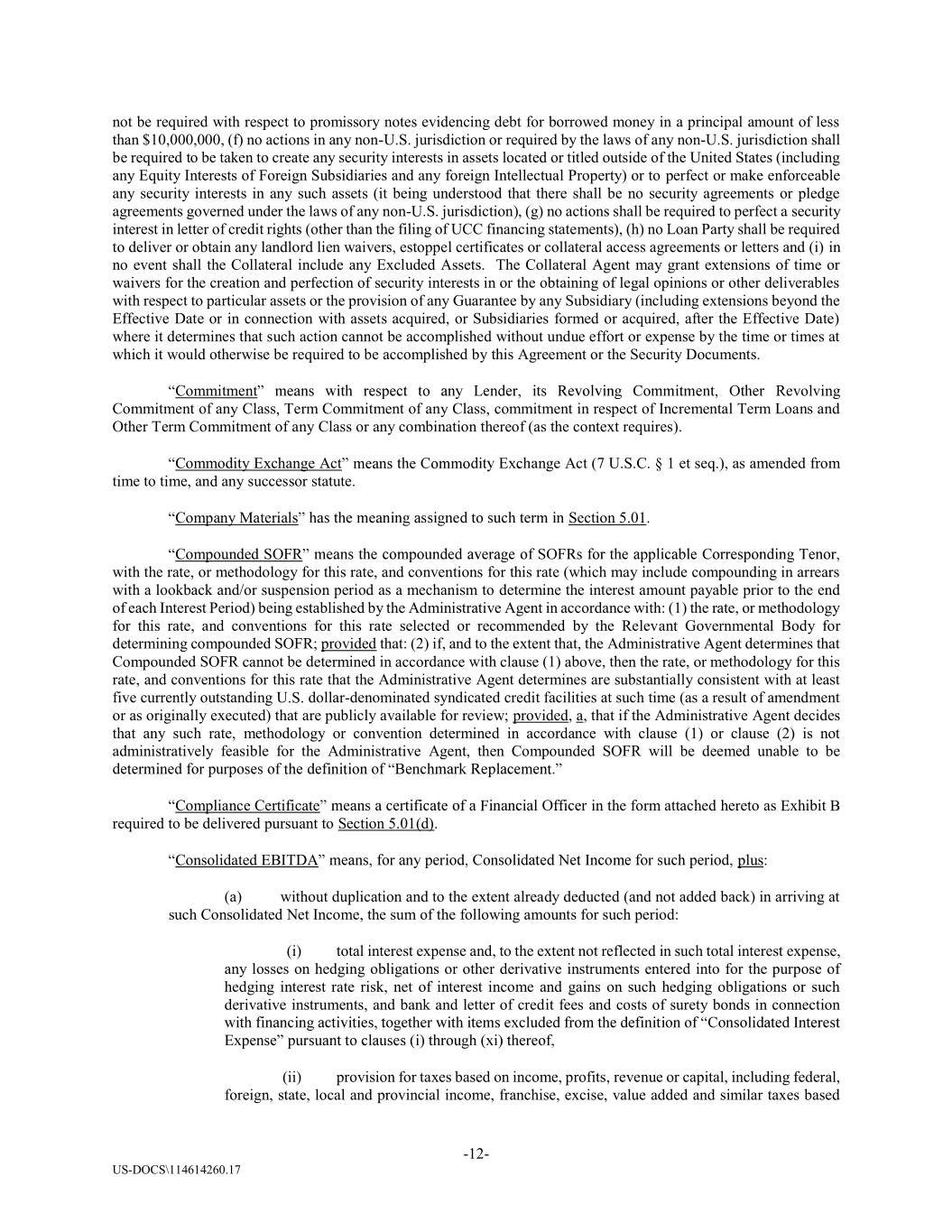 not be required with respect to promissory notes evidencing debt for borrowed money in a principal amount of less than $10,000,000, (f) no actions in any non-U.S. jurisdiction or required by the laws of any non-U.S. jurisdiction shall be required to be taken to create any security interests in assets located or titled outside of the United States (including any Equity Interests of Foreign Subsidiaries and any foreign Intellectual Property) or to perfect or make enforceable any security interests in any such assets (it being understood that there shall be no security agreements or pledge agreements governed under the laws of any non-U.S. jurisdiction), (g) no actions shall be required to perfect a security interest in letter of credit rights (other than the filing of UCC financing statements), (h) no Loan Party shall be required to deliver or obtain any landlord lien waivers, estoppel certificates or collateral access agreements or letters and (i) in no event shall the Collateral include any Excluded Assets. The Collateral Agent may grant extensions of time or waivers for the creation and perfection of security interests in or the obtaining of legal opinions or other deliverables with respect to particular assets or the provision of any Guarantee by any Subsidiary (including extensions beyond the Effective Date or in connection with assets acquired, or Subsidiaries formed or acquired, after the Effective Date) where it determines that such action cannot be accomplished without undue effort or expense by the time or times at which it would otherwise be required to be accomplished by this Agreement or the Security Documents. Commitment Revolving Commitment of any Class, Term Commitment of any Class, commitment in respect of Incremental Term Loans and Other Term Commitment of any Class or any combination thereof (as the context requires). Commodity Exchange Act ange Act (7 U.S.C. § 1 et seq.), as amended from time to time, and any successor statute. Company Materials Section 5.01. Compounded SOFR with the rate, or methodology for this rate, and conventions for this rate (which may include compounding in arrears with a lookback and/or suspension period as a mechanism to determine the interest amount payable prior to the end of each Interest Period) being established by the Administrative Agent in accordance with: (1) the rate, or methodology for this rate, and conventions for this rate selected or recommended by the Relevant Governmental Body for determining compounded SOFR; provided that: (2) if, and to the extent that, the Administrative Agent determines that Compounded SOFR cannot be determined in accordance with clause (1) above, then the rate, or methodology for this rate, and conventions for this rate that the Administrative Agent determines are substantially consistent with at least five currently outstanding U.S. dollar-denominated syndicated credit facilities at such time (as a result of amendment or as originally executed) that are publicly available for review; provided, a, that if the Administrative Agent decides that any such rate, methodology or convention determined in accordance with clause (1) or clause (2) is not administratively feasible for the Administrative Agent, then Compounded SOFR will be deemed unable to be Compliance Certificate in the form attached hereto as Exhibit B required to be delivered pursuant to Section 5.01(d). Consolidated EBITDA plus: (a) without duplication and to the extent already deducted (and not added back) in arriving at such Consolidated Net Income, the sum of the following amounts for such period: (i) total interest expense and, to the extent not reflected in such total interest expense, any losses on hedging obligations or other derivative instruments entered into for the purpose of hedging interest rate risk, net of interest income and gains on such hedging obligations or such derivative instruments, and bank and letter of credit fees and costs of surety bonds in connection (ii) provision for taxes based on income, profits, revenue or capital, including federal, foreign, state, local and provincial income, franchise, excise, value added and similar taxes based -12- US-DOCS\114614260.17