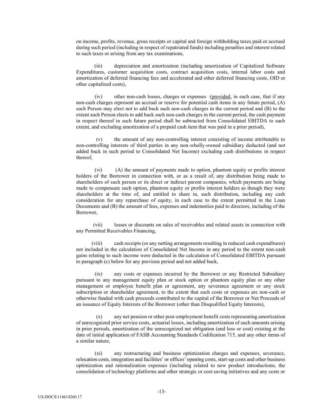 on income, profits, revenue, gross receipts or capital and foreign withholding taxes paid or accrued during such period (including in respect of repatriated funds) including penalties and interest related to such taxes or arising from any tax examinations, (iii) depreciation and amortization (including amortization of Capitalized Software Expenditures, customer acquisition costs, contract acquisition costs, internal labor costs and amortization of deferred financing fees and accelerated and other deferred financing costs, OID or other capitalized costs), (iv) other non-cash losses, charges or expenses (provided, in each case, that if any non-cash charges represent an accrual or reserve for potential cash items in any future period, (A) such Person may elect not to add back such non-cash charges in the current period and (B) to the extent such Person elects to add back such non-cash charges in the current period, the cash payment in respect thereof in such future period shall be subtracted from Consolidated EBITDA to such extent, and excluding amortization of a prepaid cash item that was paid in a prior period), (v) the amount of any non-controlling interest consisting of income attributable to non-controlling interests of third parties in any non-wholly-owned subsidiary deducted (and not added back in such period to Consolidated Net Income) excluding cash distributions in respect thereof, (vi) (A) the amount of payments made to option, phantom equity or profits interest holders of the Borrower in connection with, or as a result of, any distribution being made to shareholders of such person or its direct or indirect parent companies, which payments are being made to compensate such option, phantom equity or profits interest holders as though they were shareholders at the time of, and entitled to share in, such distribution, including any cash consideration for any repurchase of equity, in each case to the extent permitted in the Loan Documents and (B) the amount of fees, expenses and indemnities paid to directors, including of the Borrower, (vii) losses or discounts on sales of receivables and related assets in connection with any Permitted Receivables Financing, (viii) cash receipts (or any netting arrangements resulting in reduced cash expenditures) not included in the calculation of Consolidated Net Income in any period to the extent non-cash gains relating to such income were deducted in the calculation of Consolidated EBITDA pursuant to paragraph (c) below for any previous period and not added back, (ix) any costs or expenses incurred by the Borrower or any Restricted Subsidiary pursuant to any management equity plan or stock option or phantom equity plan or any other management or employee benefit plan or agreement, any severance agreement or any stock subscription or shareholder agreement, to the extent that such costs or expenses are non-cash or otherwise funded with cash proceeds contributed to the capital of the Borrower or Net Proceeds of an issuance of Equity Interests of the Borrower (other than Disqualified Equity Interests), (x) any net pension or other post-employment benefit costs representing amortization of unrecognized prior service costs, actuarial losses, including amortization of such amounts arising in prior periods, amortization of the unrecognized net obligation (and loss or cost) existing at the date of initial application of FASB Accounting Standards Codification 715, and any other items of a similar nature, (xi) any restructuring and business optimization charges and expenses, severance, -up costs and other business optimization and rationalization expenses (including related to new product introductions, the consolidation of technology platforms and other strategic or cost saving initiatives and any costs or -13- US-DOCS\114614260.17