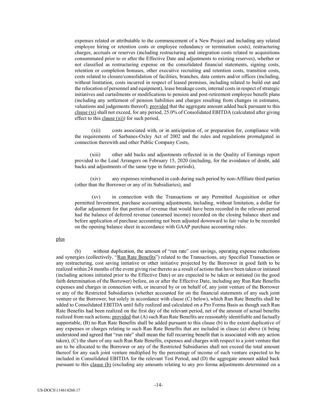 expenses related or attributable to the commencement of a New Project and including any related employee hiring or retention costs or employee redundancy or termination costs), restructuring charges, accruals or reserves (including restructuring and integration costs related to acquisitions consummated prior to or after the Effective Date and adjustments to existing reserves), whether or not classified as restructuring expense on the consolidated financial statements, signing costs, retention or completion bonuses, other executive recruiting and retention costs, transition costs, costs related to closure/consolidation of facilities, branches, data centers and/or offices (including, without limitation, costs incurred in respect of leased premises, including related to build out and the relocation of personnel and equipment), lease breakage costs, internal costs in respect of strategic initiatives and curtailments or modifications to pension and post-retirement employee benefit plans (including any settlement of pension liabilities and charges resulting from changes in estimates, valuations and judgements thereof); provided that the aggregate amount added back pursuant to this clause (xi) shall not exceed, for any period, 25.0% of Consolidated EBITDA (calculated after giving effect to this clause (xi)) for such period, (xii) costs associated with, or in anticipation of, or preparation for, compliance with the requirements of Sarbanes-Oxley Act of 2002 and the rules and regulations promulgated in connection therewith and other Public Company Costs, (xiii) other add backs and adjustments reflected in in the Quality of Earnings report provided to the Lead Arrangers on February 15, 2020 (including, for the avoidance of doubt, add backs and adjustments of the same type in future periods), (xiv) any expenses reimbursed in cash during such period by non-Affiliate third parties (other than the Borrower or any of its Subsidiaries), and (xv) in connection with the Transactions or any Permitted Acquisition or other permitted Investment, purchase accounting adjustments, including, without limitation, a dollar for dollar adjustment for that portion of revenue that would have been recorded in the relevant period had the balance of deferred revenue (unearned income) recorded on the closing balance sheet and before application of purchase accounting not been adjusted downward to fair value to be recorded on the opening balance sheet in accordance with GAAP purchase accounting rules. plus (b) and sy Run Rate Benefits related to the Transactions, any Specified Transaction or any restructuring, cost saving initiative or other initiative projected by the Borrower in good faith to be realized within 24 months of the event giving rise thereto as a result of actions that have been taken or initiated (including actions initiated prior to the Effective Date) or are expected to be taken or initiated (in the good faith determination of the Borrower) before, on or after the Effective Date, including any Run Rate Benefits expenses and charges in connection with, or incurred by or on behalf of, any joint venture of the Borrower or any of the Restricted Subsidiaries (whether accounted for on the financial statements of any such joint venture or the Borrower, but solely in accordance with clause (C) below), which Run Rate Benefits shall be added to Consolidated EBITDA until fully realized and calculated on a Pro Forma Basis as though such Run Rate Benefits had been realized on the first day of the relevant period, net of the amount of actual benefits realized from such actions; provided that (A) such Run Rate Benefits are reasonably identifiable and factually supportable, (B) no Run Rate Benefits shall be added pursuant to this clause (b) to the extent duplicative of any expenses or charges relating to such Run Rate Benefits that are included in clause (a) above (it being taken), (C) the share of any such Run Rate Benefits, expenses and charges with respect to a joint venture that are to be allocated to the Borrower or any of the Restricted Subsidiaries shall not exceed the total amount thereof for any such joint venture multiplied by the percentage of income of such venture expected to be included in Consolidated EBITDA for the relevant Test Period, and (D) the aggregate amount added back pursuant to this clause (b) (excluding any amounts relating to any pro forma adjustments determined on a -14- US-DOCS\114614260.17