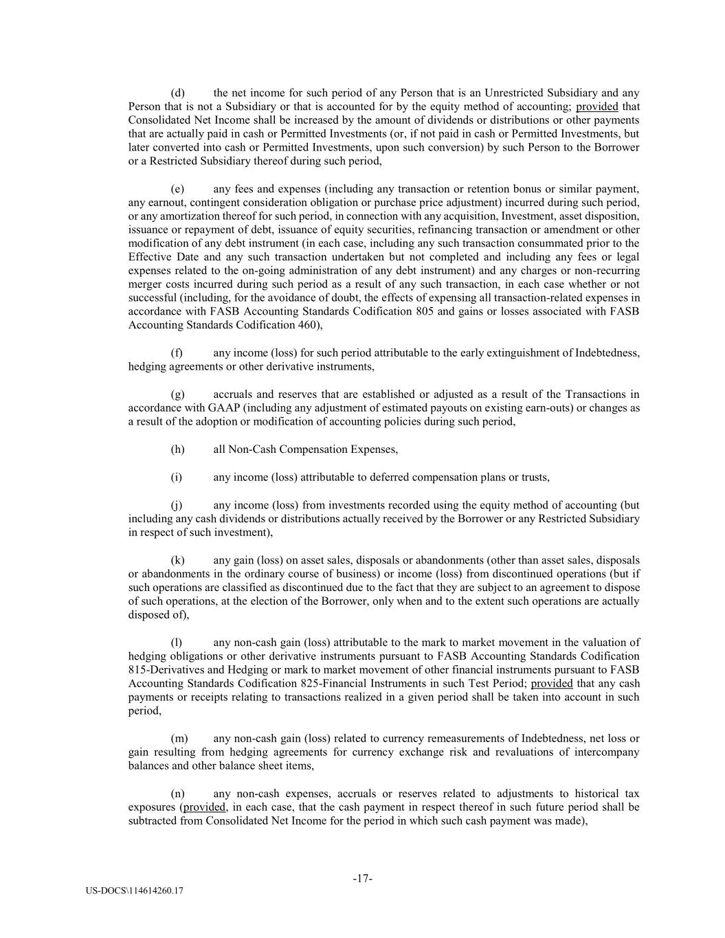 (d) the net income for such period of any Person that is an Unrestricted Subsidiary and any Person that is not a Subsidiary or that is accounted for by the equity method of accounting; provided that Consolidated Net Income shall be increased by the amount of dividends or distributions or other payments that are actually paid in cash or Permitted Investments (or, if not paid in cash or Permitted Investments, but later converted into cash or Permitted Investments, upon such conversion) by such Person to the Borrower or a Restricted Subsidiary thereof during such period, (e) any fees and expenses (including any transaction or retention bonus or similar payment, any earnout, contingent consideration obligation or purchase price adjustment) incurred during such period, or any amortization thereof for such period, in connection with any acquisition, Investment, asset disposition, issuance or repayment of debt, issuance of equity securities, refinancing transaction or amendment or other modification of any debt instrument (in each case, including any such transaction consummated prior to the Effective Date and any such transaction undertaken but not completed and including any fees or legal expenses related to the on-going administration of any debt instrument) and any charges or non-recurring merger costs incurred during such period as a result of any such transaction, in each case whether or not successful (including, for the avoidance of doubt, the effects of expensing all transaction-related expenses in accordance with FASB Accounting Standards Codification 805 and gains or losses associated with FASB Accounting Standards Codification 460), (f) any income (loss) for such period attributable to the early extinguishment of Indebtedness, hedging agreements or other derivative instruments, (g) accruals and reserves that are established or adjusted as a result of the Transactions in accordance with GAAP (including any adjustment of estimated payouts on existing earn-outs) or changes as a result of the adoption or modification of accounting policies during such period, (h) all Non-Cash Compensation Expenses, (i) any income (loss) attributable to deferred compensation plans or trusts, (j) any income (loss) from investments recorded using the equity method of accounting (but including any cash dividends or distributions actually received by the Borrower or any Restricted Subsidiary in respect of such investment), (k) any gain (loss) on asset sales, disposals or abandonments (other than asset sales, disposals or abandonments in the ordinary course of business) or income (loss) from discontinued operations (but if such operations are classified as discontinued due to the fact that they are subject to an agreement to dispose of such operations, at the election of the Borrower, only when and to the extent such operations are actually disposed of), (l) any non-cash gain (loss) attributable to the mark to market movement in the valuation of hedging obligations or other derivative instruments pursuant to FASB Accounting Standards Codification 815-Derivatives and Hedging or mark to market movement of other financial instruments pursuant to FASB Accounting Standards Codification 825-Financial Instruments in such Test Period; provided that any cash payments or receipts relating to transactions realized in a given period shall be taken into account in such period, (m) any non-cash gain (loss) related to currency remeasurements of Indebtedness, net loss or gain resulting from hedging agreements for currency exchange risk and revaluations of intercompany balances and other balance sheet items, (n) any non-cash expenses, accruals or reserves related to adjustments to historical tax exposures (provided, in each case, that the cash payment in respect thereof in such future period shall be subtracted from Consolidated Net Income for the period in which such cash payment was made), -17- US-DOCS\114614260.17