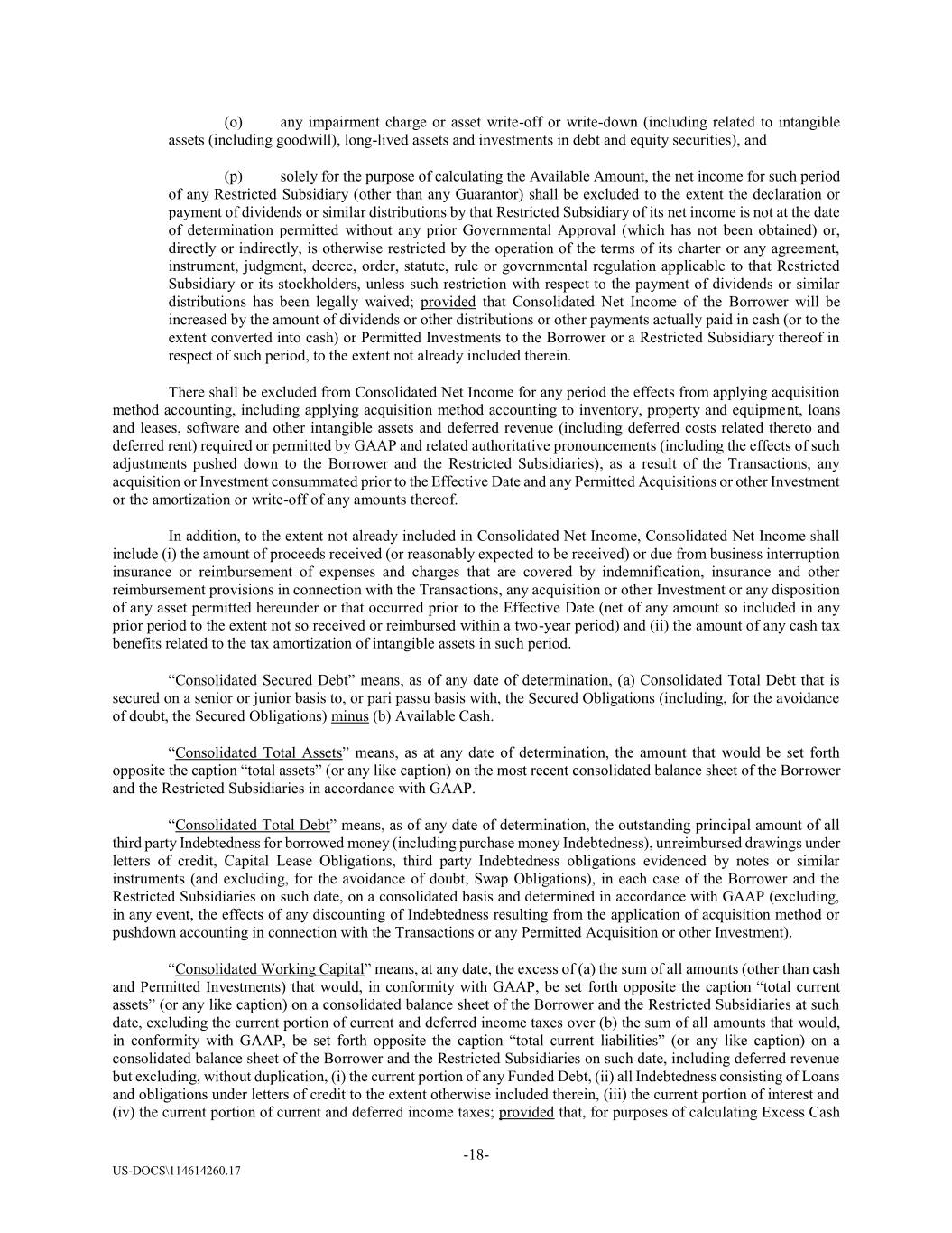 (o) any impairment charge or asset write-off or write-down (including related to intangible assets (including goodwill), long-lived assets and investments in debt and equity securities), and (p) solely for the purpose of calculating the Available Amount, the net income for such period of any Restricted Subsidiary (other than any Guarantor) shall be excluded to the extent the declaration or payment of dividends or similar distributions by that Restricted Subsidiary of its net income is not at the date of determination permitted without any prior Governmental Approval (which has not been obtained) or, directly or indirectly, is otherwise restricted by the operation of the terms of its charter or any agreement, instrument, judgment, decree, order, statute, rule or governmental regulation applicable to that Restricted Subsidiary or its stockholders, unless such restriction with respect to the payment of dividends or similar distributions has been legally waived; provided that Consolidated Net Income of the Borrower will be increased by the amount of dividends or other distributions or other payments actually paid in cash (or to the extent converted into cash) or Permitted Investments to the Borrower or a Restricted Subsidiary thereof in respect of such period, to the extent not already included therein. There shall be excluded from Consolidated Net Income for any period the effects from applying acquisition method accounting, including applying acquisition method accounting to inventory, property and equipment, loans and leases, software and other intangible assets and deferred revenue (including deferred costs related thereto and deferred rent) required or permitted by GAAP and related authoritative pronouncements (including the effects of such adjustments pushed down to the Borrower and the Restricted Subsidiaries), as a result of the Transactions, any acquisition or Investment consummated prior to the Effective Date and any Permitted Acquisitions or other Investment or the amortization or write-off of any amounts thereof. In addition, to the extent not already included in Consolidated Net Income, Consolidated Net Income shall include (i) the amount of proceeds received (or reasonably expected to be received) or due from business interruption insurance or reimbursement of expenses and charges that are covered by indemnification, insurance and other reimbursement provisions in connection with the Transactions, any acquisition or other Investment or any disposition of any asset permitted hereunder or that occurred prior to the Effective Date (net of any amount so included in any prior period to the extent not so received or reimbursed within a two-year period) and (ii) the amount of any cash tax benefits related to the tax amortization of intangible assets in such period. Consolidated Secured Debt secured on a senior or junior basis to, or pari passu basis with, the Secured Obligations (including, for the avoidance of doubt, the Secured Obligations) minus (b) Available Cash. Consolidated Total Assets rower and the Restricted Subsidiaries in accordance with GAAP. Consolidated Total Debt third party Indebtedness for borrowed money (including purchase money Indebtedness), unreimbursed drawings under letters of credit, Capital Lease Obligations, third party Indebtedness obligations evidenced by notes or similar instruments (and excluding, for the avoidance of doubt, Swap Obligations), in each case of the Borrower and the Restricted Subsidiaries on such date, on a consolidated basis and determined in accordance with GAAP (excluding, in any event, the effects of any discounting of Indebtedness resulting from the application of acquisition method or pushdown accounting in connection with the Transactions or any Permitted Acquisition or other Investment). Consolidated Working Capital and Permitted Investments) that would, in conformity with GAAP, be set date, excluding the current portion of current and deferred income taxes over (b) the sum of all amounts that would, consolidated balance sheet of the Borrower and the Restricted Subsidiaries on such date, including deferred revenue but excluding, without duplication, (i) the current portion of any Funded Debt, (ii) all Indebtedness consisting of Loans and obligations under letters of credit to the extent otherwise included therein, (iii) the current portion of interest and (iv) the current portion of current and deferred income taxes; provided that, for purposes of calculating Excess Cash -18- US-DOCS\114614260.17