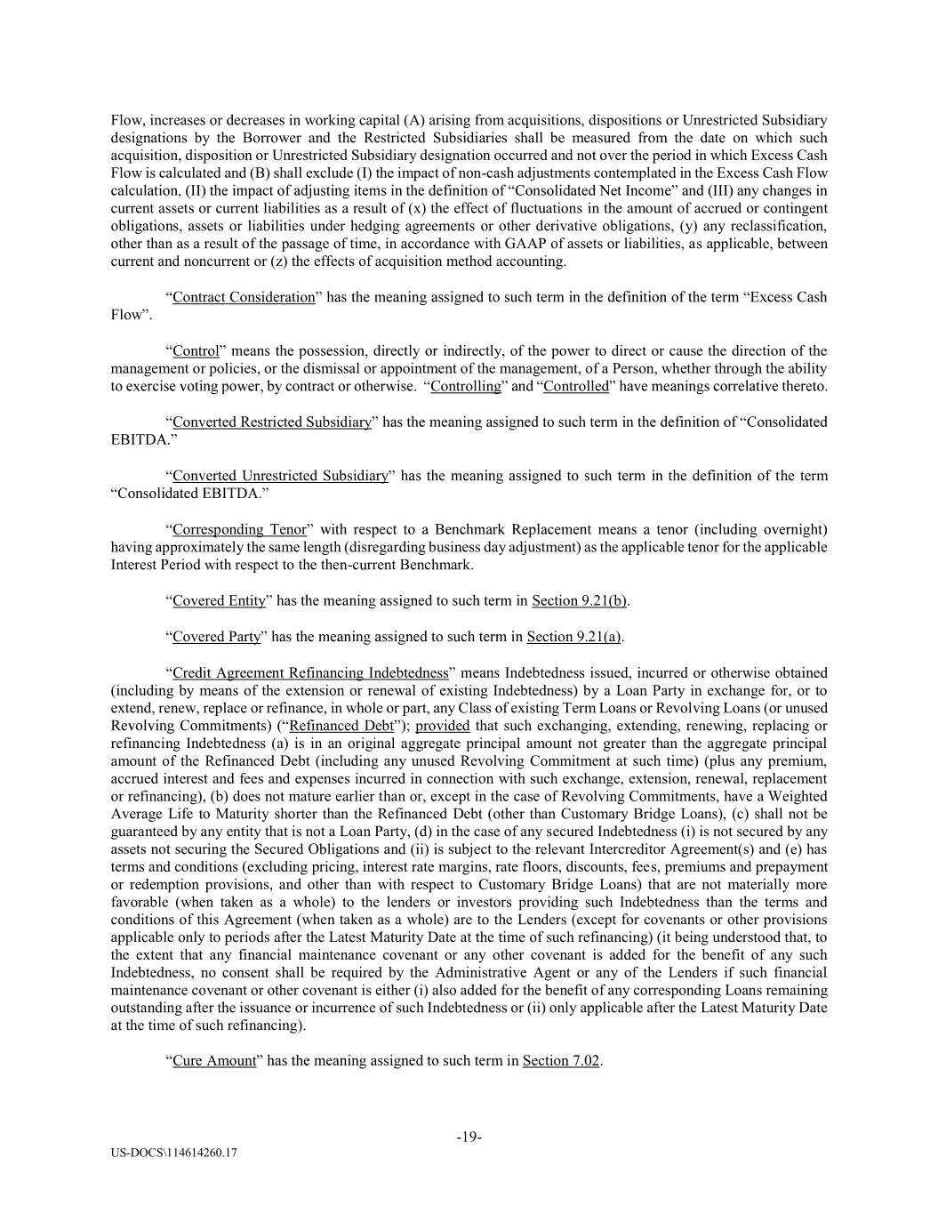 Flow, increases or decreases in working capital (A) arising from acquisitions, dispositions or Unrestricted Subsidiary designations by the Borrower and the Restricted Subsidiaries shall be measured from the date on which such acquisition, disposition or Unrestricted Subsidiary designation occurred and not over the period in which Excess Cash Flow is calculated and (B) shall exclude (I) the impact of non-cash adjustments contemplated in the Excess Cash Flow current assets or current liabilities as a result of (x) the effect of fluctuations in the amount of accrued or contingent obligations, assets or liabilities under hedging agreements or other derivative obligations, (y) any reclassification, other than as a result of the passage of time, in accordance with GAAP of assets or liabilities, as applicable, between current and noncurrent or (z) the effects of acquisition method accounting. Contract Consideration Control indirectly, of the power to direct or cause the direction of the management or policies, or the dismissal or appointment of the management, of a Person, whether through the ability Controlling Controlled Converted Restricted Subsidiary Converted Unrestricted Subsidiary he term Corresponding Tenor having approximately the same length (disregarding business day adjustment) as the applicable tenor for the applicable Interest Period with respect to the then-current Benchmark. Covered Entity Section 9.21(b). Covered Party Section 9.21(a). Credit Agreement Refinancing Indebtedness tedness issued, incurred or otherwise obtained (including by means of the extension or renewal of existing Indebtedness) by a Loan Party in exchange for, or to extend, renew, replace or refinance, in whole or part, any Class of existing Term Loans or Revolving Loans (or unused Refinanced Debt provided that such exchanging, extending, renewing, replacing or refinancing Indebtedness (a) is in an original aggregate principal amount not greater than the aggregate principal amount of the Refinanced Debt (including any unused Revolving Commitment at such time) (plus any premium, accrued interest and fees and expenses incurred in connection with such exchange, extension, renewal, replacement or refinancing), (b) does not mature earlier than or, except in the case of Revolving Commitments, have a Weighted Average Life to Maturity shorter than the Refinanced Debt (other than Customary Bridge Loans), (c) shall not be guaranteed by any entity that is not a Loan Party, (d) in the case of any secured Indebtedness (i) is not secured by any assets not securing the Secured Obligations and (ii) is subject to the relevant Intercreditor Agreement(s) and (e) has terms and conditions (excluding pricing, interest rate margins, rate floors, discounts, fees, premiums and prepayment or redemption provisions, and other than with respect to Customary Bridge Loans) that are not materially more favorable (when taken as a whole) to the lenders or investors providing such Indebtedness than the terms and conditions of this Agreement (when taken as a whole) are to the Lenders (except for covenants or other provisions applicable only to periods after the Latest Maturity Date at the time of such refinancing) (it being understood that, to the extent that any financial maintenance covenant or any other covenant is added for the benefit of any such Indebtedness, no consent shall be required by the Administrative Agent or any of the Lenders if such financial maintenance covenant or other covenant is either (i) also added for the benefit of any corresponding Loans remaining outstanding after the issuance or incurrence of such Indebtedness or (ii) only applicable after the Latest Maturity Date at the time of such refinancing). Cure Amount rm in Section 7.02. -19- US-DOCS\114614260.17
