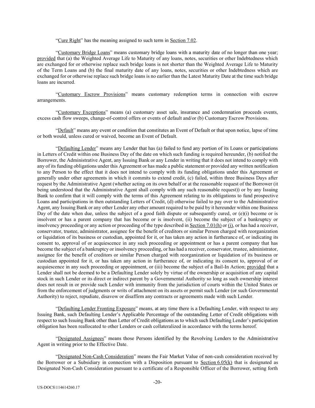 Cure Right Section 7.02. Customary Bridge Loans provided that (a) the Weighted Average Life to Maturity of any loans, notes, securities or other Indebtedness which are exchanged for or otherwise replace such bridge loans is not shorter than the Weighted Average Life to Maturity of the Term Loans and (b) the final maturity date of any loans, notes, securities or other Indebtedness which are exchanged for or otherwise replace such bridge loans is no earlier than the Latest Maturity Date at the time such bridge loans are incurred. Customary Escrow Provisions ry redemption terms in connection with escrow arrangements. Customary Exceptions excess cash flow sweeps, change-of-control offers or events of default and/or (b) Customary Escrow Provisions. Default or both would, unless cured or waived, become an Event of Default. Defaulting Lender in Letters of Credit within one Business Day of the date on which such funding is required hereunder, (b) notified the Borrower, the Administrative Agent, any Issuing Bank or any Lender in writing that it does not intend to comply with any of its funding obligations under this Agreement or has made a public statement or provided any written notification to any Person to the effect that it does not intend to comply with its funding obligations under this Agreement or generally under other agreements in which it commits to extend credit, (c) failed, within three Business Days after request by the Administrative Agent (whether acting on its own behalf or at the reasonable request of the Borrower (it being understood that the Administrative Agent shall comply with any such reasonable request)) or by any Issuing Bank to confirm that it will comply with the terms of this Agreement relating to its obligations to fund prospective Loans and participations in then outstanding Letters of Credit, (d) otherwise failed to pay over to the Administrative Agent, any Issuing Bank or any other Lender any other amount required to be paid by it hereunder within one Business Day of the date when due, unless the subject of a good faith dispute or subsequently cured, or (e)(i) become or is insolvent or has a parent company that has become or is insolvent, (ii) become the subject of a bankruptcy or insolvency proceeding or any action or proceeding of the type described in Section 7.01(h) or (i), or has had a receiver, conservator, trustee, administrator, assignee for the benefit of creditors or similar Person charged with reorganization or liquidation of its business or custodian, appointed for it, or has taken any action in furtherance of, or indicating its consent to, approval of or acquiescence in any such proceeding or appointment or has a parent company that has become the subject of a bankruptcy or insolvency proceeding, or has had a receiver, conservator, trustee, administrator, assignee for the benefit of creditors or similar Person charged with reorganization or liquidation of its business or custodian appointed for it, or has taken any action in furtherance of, or indicating its consent to, approval of or acquiescence in any such proceeding or appointment, or (iii) become the subject of a Bail-In Action; provided that a Lender shall not be deemed to be a Defaulting Lender solely by virtue of the ownership or acquisition of any capital stock in such Lender or its direct or indirect parent by a Governmental Authority so long as such ownership interest does not result in or provide such Lender with immunity from the jurisdiction of courts within the United States or from the enforcement of judgments or writs of attachment on its assets or permit such Lender (or such Governmental Authority) to reject, repudiate, disavow or disaffirm any contracts or agreements made with such Lender. Defaulting Lender Fronting Exposure any obligation has been reallocated to other Lenders or cash collateralized in accordance with the terms hereof. Designated Assignees Agent in writing prior to the Effective Date. Designated Non-Cash Consideration -cash consideration received by the Borrower or a Subsidiary in connection with a Disposition pursuant to Section 6.05(k) that is designated as Designated Non-Cash Consideration pursuant to a certificate of a Responsible Officer of the Borrower, setting forth -20- US-DOCS\114614260.17