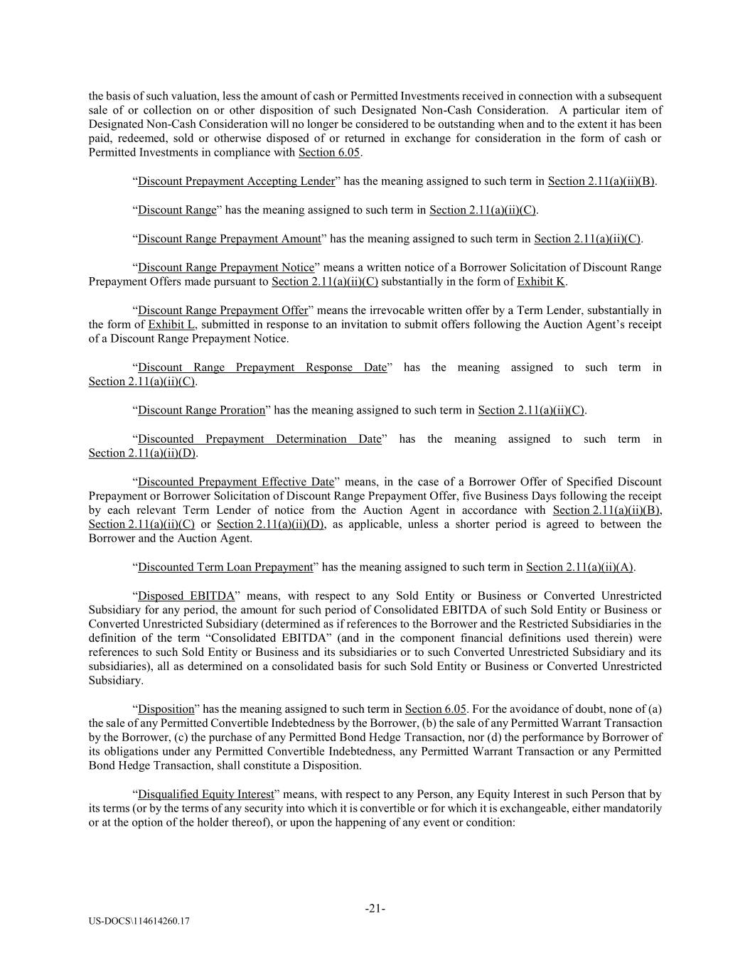 the basis of such valuation, less the amount of cash or Permitted Investments received in connection with a subsequent sale of or collection on or other disposition of such Designated Non-Cash Consideration. A particular item of Designated Non-Cash Consideration will no longer be considered to be outstanding when and to the extent it has been paid, redeemed, sold or otherwise disposed of or returned in exchange for consideration in the form of cash or Permitted Investments in compliance with Section 6.05. Discount Prepayment Accepting Lender Section 2.11(a)(ii)(B). Discount Range Section 2.11(a)(ii)(C). Discount Range Prepayment Amount Section 2.11(a)(ii)(C). Discount Range Prepayment Notice en notice of a Borrower Solicitation of Discount Range Prepayment Offers made pursuant to Section 2.11(a)(ii)(C) substantially in the form of Exhibit K. Discount Range Prepayment Offer the form of Exhibit L of a Discount Range Prepayment Notice. Discount Range Prepayment Response Date Section 2.11(a)(ii)(C). Discount Range Proration Section 2.11(a)(ii)(C). Discounted Prepayment Determination Date in Section 2.11(a)(ii)(D). Discounted Prepayment Effective Date Prepayment or Borrower Solicitation of Discount Range Prepayment Offer, five Business Days following the receipt by each relevant Term Lender of notice from the Auction Agent in accordance with Section 2.11(a)(ii)(B), Section 2.11(a)(ii)(C) or Section 2.11(a)(ii)(D), as applicable, unless a shorter period is agreed to between the Borrower and the Auction Agent. Discounted Term Loan Prepayment Section 2.11(a)(ii)(A). Disposed EBITDA Subsidiary for any period, the amount for such period of Consolidated EBITDA of such Sold Entity or Business or Converted Unrestricted Subsidiary (determined as if references to the Borrower and the Restricted Subsidiaries in the e component financial definitions used therein) were references to such Sold Entity or Business and its subsidiaries or to such Converted Unrestricted Subsidiary and its subsidiaries), all as determined on a consolidated basis for such Sold Entity or Business or Converted Unrestricted Subsidiary. Disposition Section 6.05. For the avoidance of doubt, none of (a) the sale of any Permitted Convertible Indebtedness by the Borrower, (b) the sale of any Permitted Warrant Transaction by the Borrower, (c) the purchase of any Permitted Bond Hedge Transaction, nor (d) the performance by Borrower of its obligations under any Permitted Convertible Indebtedness, any Permitted Warrant Transaction or any Permitted Bond Hedge Transaction, shall constitute a Disposition. Disqualified Equity Interest its terms (or by the terms of any security into which it is convertible or for which it is exchangeable, either mandatorily or at the option of the holder thereof), or upon the happening of any event or condition: -21- US-DOCS\114614260.17