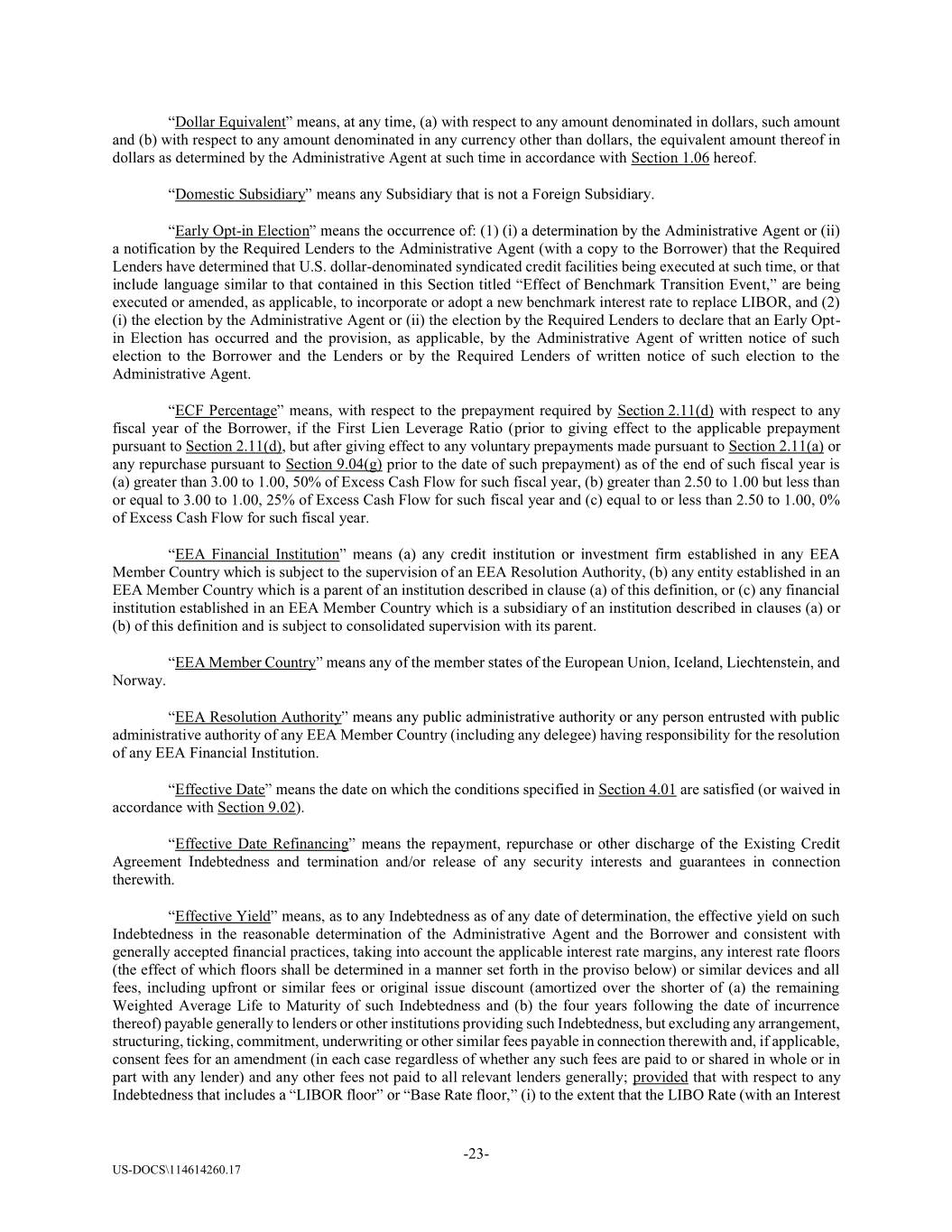 Dollar Equivalent with respect to any amount denominated in dollars, such amount and (b) with respect to any amount denominated in any currency other than dollars, the equivalent amount thereof in dollars as determined by the Administrative Agent at such time in accordance with Section 1.06 hereof. Domestic Subsidiary Early Opt-in Election a notification by the Required Lenders to the Administrative Agent (with a copy to the Borrower) that the Required Lenders have determined that U.S. dollar-denominated syndicated credit facilities being executed at such time, or that executed or amended, as applicable, to incorporate or adopt a new benchmark interest rate to replace LIBOR, and (2) (i) the election by the Administrative Agent or (ii) the election by the Required Lenders to declare that an Early Opt- in Election has occurred and the provision, as applicable, by the Administrative Agent of written notice of such election to the Borrower and the Lenders or by the Required Lenders of written notice of such election to the Administrative Agent. ECF Percentage eans, with respect to the prepayment required by Section 2.11(d) with respect to any fiscal year of the Borrower, if the First Lien Leverage Ratio (prior to giving effect to the applicable prepayment pursuant to Section 2.11(d), but after giving effect to any voluntary prepayments made pursuant to Section 2.11(a) or any repurchase pursuant to Section 9.04(g) prior to the date of such prepayment) as of the end of such fiscal year is (a) greater than 3.00 to 1.00, 50% of Excess Cash Flow for such fiscal year, (b) greater than 2.50 to 1.00 but less than or equal to 3.00 to 1.00, 25% of Excess Cash Flow for such fiscal year and (c) equal to or less than 2.50 to 1.00, 0% of Excess Cash Flow for such fiscal year. EEA Financial Institution Member Country which is subject to the supervision of an EEA Resolution Authority, (b) any entity established in an EEA Member Country which is a parent of an institution described in clause (a) of this definition, or (c) any financial institution established in an EEA Member Country which is a subsidiary of an institution described in clauses (a) or (b) of this definition and is subject to consolidated supervision with its parent. EEA Member Country Norway. EEA Resolution Authority administrative authority of any EEA Member Country (including any delegee) having responsibility for the resolution of any EEA Financial Institution. Effective Date eans the date on which the conditions specified in Section 4.01 are satisfied (or waived in accordance with Section 9.02). Effective Date Refinancing Agreement Indebtedness and termination and/or release of any security interests and guarantees in connection therewith. Effective Yield Indebtedness in the reasonable determination of the Administrative Agent and the Borrower and consistent with generally accepted financial practices, taking into account the applicable interest rate margins, any interest rate floors (the effect of which floors shall be determined in a manner set forth in the proviso below) or similar devices and all fees, including upfront or similar fees or original issue discount (amortized over the shorter of (a) the remaining Weighted Average Life to Maturity of such Indebtedness and (b) the four years following the date of incurrence thereof) payable generally to lenders or other institutions providing such Indebtedness, but excluding any arrangement, structuring, ticking, commitment, underwriting or other similar fees payable in connection therewith and, if applicable, consent fees for an amendment (in each case regardless of whether any such fees are paid to or shared in whole or in part with any lender) and any other fees not paid to all relevant lenders generally; provided that with respect to any -23- US-DOCS\114614260.17