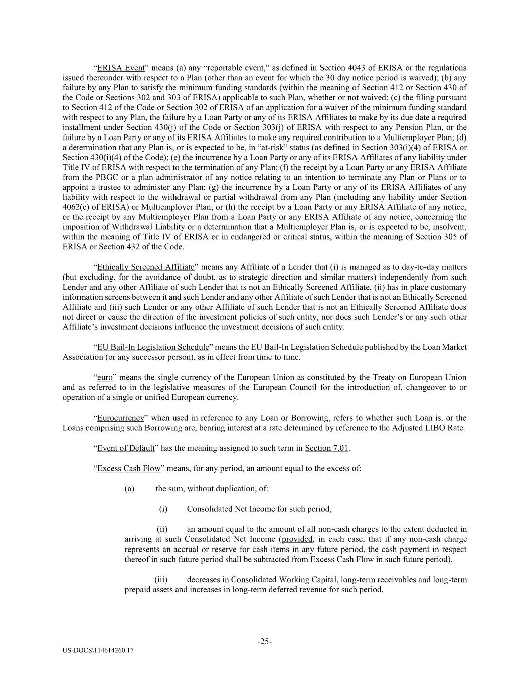 ERISA Event issued thereunder with respect to a Plan (other than an event for which the 30 day notice period is waived); (b) any failure by any Plan to satisfy the minimum funding standards (within the meaning of Section 412 or Section 430 of the Code or Sections 302 and 303 of ERISA) applicable to such Plan, whether or not waived; (c) the filing pursuant to Section 412 of the Code or Section 302 of ERISA of an application for a waiver of the minimum funding standard with respect to any Plan, the failure by a Loan Party or any of its ERISA Affiliates to make by its due date a required installment under Section 430(j) of the Code or Section 303(j) of ERISA with respect to any Pension Plan, or the failure by a Loan Party or any of its ERISA Affiliates to make any required contribution to a Multiemployer Plan; (d) - n 303(i)(4) of ERISA or Section 430(i)(4) of the Code); (e) the incurrence by a Loan Party or any of its ERISA Affiliates of any liability under Title IV of ERISA with respect to the termination of any Plan; (f) the receipt by a Loan Party or any ERISA Affiliate from the PBGC or a plan administrator of any notice relating to an intention to terminate any Plan or Plans or to appoint a trustee to administer any Plan; (g) the incurrence by a Loan Party or any of its ERISA Affiliates of any liability with respect to the withdrawal or partial withdrawal from any Plan (including any liability under Section 4062(e) of ERISA) or Multiemployer Plan; or (h) the receipt by a Loan Party or any ERISA Affiliate of any notice, or the receipt by any Multiemployer Plan from a Loan Party or any ERISA Affiliate of any notice, concerning the imposition of Withdrawal Liability or a determination that a Multiemployer Plan is, or is expected to be, insolvent, within the meaning of Title IV of ERISA or in endangered or critical status, within the meaning of Section 305 of ERISA or Section 432 of the Code. Ethically Screened Affiliate i) is managed as to day-to-day matters (but excluding, for the avoidance of doubt, as to strategic direction and similar matters) independently from such Lender and any other Affiliate of such Lender that is not an Ethically Screened Affiliate, (ii) has in place customary information screens between it and such Lender and any other Affiliate of such Lender that is not an Ethically Screened Affiliate and (iii) such Lender or any other Affiliate of such Lender that is not an Ethically Screened Affiliate does other EU Bail-In Legislation Schedule -In Legislation Schedule published by the Loan Market Association (or any successor person), as in effect from time to time. euro and as referred to in the legislative measures of the European Council for the introduction of, changeover to or operation of a single or unified European currency. Eurocurrency Loans comprising such Borrowing are, bearing interest at a rate determined by reference to the Adjusted LIBO Rate. Event of Default Section 7.01. Excess Cash Flow (a) the sum, without duplication, of: (i) Consolidated Net Income for such period, (ii) an amount equal to the amount of all non-cash charges to the extent deducted in arriving at such Consolidated Net Income (provided, in each case, that if any non-cash charge represents an accrual or reserve for cash items in any future period, the cash payment in respect thereof in such future period shall be subtracted from Excess Cash Flow in such future period), (iii) decreases in Consolidated Working Capital, long-term receivables and long-term prepaid assets and increases in long-term deferred revenue for such period, -25- US-DOCS\114614260.17