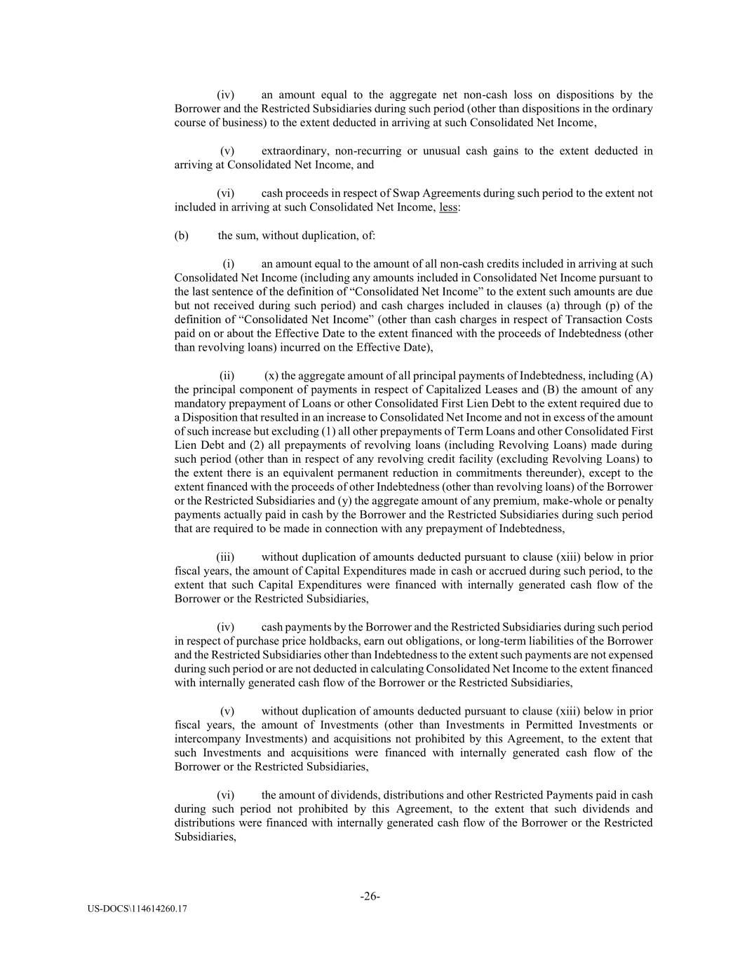 (iv) an amount equal to the aggregate net non-cash loss on dispositions by the Borrower and the Restricted Subsidiaries during such period (other than dispositions in the ordinary course of business) to the extent deducted in arriving at such Consolidated Net Income, (v) extraordinary, non-recurring or unusual cash gains to the extent deducted in arriving at Consolidated Net Income, and (vi) cash proceeds in respect of Swap Agreements during such period to the extent not included in arriving at such Consolidated Net Income, less: (b) the sum, without duplication, of: (i) an amount equal to the amount of all non-cash credits included in arriving at such Consolidated Net Income (including any amounts included in Consolidated Net Income pursuant to but not received during such period) and cash charges included in clauses (a) through (p) of the paid on or about the Effective Date to the extent financed with the proceeds of Indebtedness (other than revolving loans) incurred on the Effective Date), (ii) (x) the aggregate amount of all principal payments of Indebtedness, including (A) the principal component of payments in respect of Capitalized Leases and (B) the amount of any mandatory prepayment of Loans or other Consolidated First Lien Debt to the extent required due to a Disposition that resulted in an increase to Consolidated Net Income and not in excess of the amount of such increase but excluding (1) all other prepayments of Term Loans and other Consolidated First Lien Debt and (2) all prepayments of revolving loans (including Revolving Loans) made during such period (other than in respect of any revolving credit facility (excluding Revolving Loans) to the extent there is an equivalent permanent reduction in commitments thereunder), except to the extent financed with the proceeds of other Indebtedness (other than revolving loans) of the Borrower or the Restricted Subsidiaries and (y) the aggregate amount of any premium, make-whole or penalty payments actually paid in cash by the Borrower and the Restricted Subsidiaries during such period that are required to be made in connection with any prepayment of Indebtedness, (iii) without duplication of amounts deducted pursuant to clause (xiii) below in prior fiscal years, the amount of Capital Expenditures made in cash or accrued during such period, to the extent that such Capital Expenditures were financed with internally generated cash flow of the Borrower or the Restricted Subsidiaries, (iv) cash payments by the Borrower and the Restricted Subsidiaries during such period in respect of purchase price holdbacks, earn out obligations, or long-term liabilities of the Borrower and the Restricted Subsidiaries other than Indebtedness to the extent such payments are not expensed during such period or are not deducted in calculating Consolidated Net Income to the extent financed with internally generated cash flow of the Borrower or the Restricted Subsidiaries, (v) without duplication of amounts deducted pursuant to clause (xiii) below in prior fiscal years, the amount of Investments (other than Investments in Permitted Investments or intercompany Investments) and acquisitions not prohibited by this Agreement, to the extent that such Investments and acquisitions were financed with internally generated cash flow of the Borrower or the Restricted Subsidiaries, (vi) the amount of dividends, distributions and other Restricted Payments paid in cash during such period not prohibited by this Agreement, to the extent that such dividends and distributions were financed with internally generated cash flow of the Borrower or the Restricted Subsidiaries, -26- US-DOCS\114614260.17
