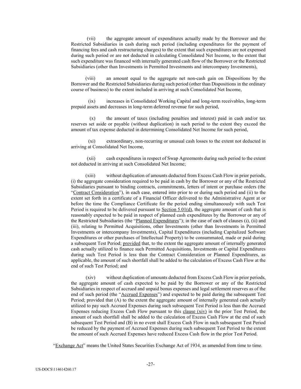 (vii) the aggregate amount of expenditures actually made by the Borrower and the Restricted Subsidiaries in cash during such period (including expenditures for the payment of financing fees and cash restructuring charges) to the extent that such expenditures are not expensed during such period or are not deducted in calculating Consolidated Net Income, to the extent that such expenditure was financed with internally generated cash flow of the Borrower or the Restricted Subsidiaries (other than Investments in Permitted Investments and intercompany Investments), (viii) an amount equal to the aggregate net non-cash gain on Dispositions by the Borrower and the Restricted Subsidiaries during such period (other than Dispositions in the ordinary course of business) to the extent included in arriving at such Consolidated Net Income, (ix) increases in Consolidated Working Capital and long-term receivables, long-term prepaid assets and decreases in long-term deferred revenue for such period, (x) the amount of taxes (including penalties and interest) paid in cash and/or tax reserves set aside or payable (without duplication) in such period to the extent they exceed the amount of tax expense deducted in determining Consolidated Net Income for such period, (xi) extraordinary, non-recurring or unusual cash losses to the extent not deducted in arriving at Consolidated Net Income, (xii) cash expenditures in respect of Swap Agreements during such period to the extent not deducted in arriving at such Consolidated Net Income; (xiii) without duplication of amounts deducted from Excess Cash Flow in prior periods, (i) the aggregate consideration required to be paid in cash by the Borrower or any of the Restricted Subsidiaries pursuant to binding contracts, commitments, letters of intent or purchase orders (the Contract Consideration ior to or during such period and (ii) to the extent set forth in a certificate of a Financial Officer delivered to the Administrative Agent at or before the time the Compliance Certificate for the period ending simultaneously with such Test Period is required to be delivered pursuant to Section 5.01(d), the aggregate amount of cash that is reasonably expected to be paid in respect of planned cash expenditures by the Borrower or any of Planned Expenditures (iii), relating to Permitted Acquisitions, other Investments (other than Investments in Permitted Investments or intercompany Investments), Capital Expenditures (including Capitalized Software Expenditures or other purchases of Intellectual Property) to be consummated, made or paid during a subsequent Test Period; provided that, to the extent the aggregate amount of internally generated cash actually utilized to finance such Permitted Acquisitions, Investments or Capital Expenditures during such Test Period is less than the Contract Consideration or Planned Expenditures, as applicable, the amount of such shortfall shall be added to the calculation of Excess Cash Flow at the end of such Test Period; and (xiv) without duplication of amounts deducted from Excess Cash Flow in prior periods, the aggregate amount of cash expected to be paid by the Borrower or any of the Restricted Subsidiaries in respect of accrued and unpaid bonus expenses and legal settlement reserves as of the Accrued Expenses Period; provided that (A) to the extent the aggregate amount of internally generated cash actually utilized to pay such Accrued Expenses during such subsequent Test Period is less than the Accrued Expenses reducing Excess Cash Flow pursuant to this clause (xiv) in the prior Test Period, the amount of such shortfall shall be added to the calculation of Excess Cash Flow at the end of such subsequent Test Period and (B) in no event shall Excess Cash Flow in such subsequent Test Period be reduced by the payment of Accrued Expenses during such subsequent Test Period to the extent the amount of such Accrued Expenses have reduced Excess Cash flow in the prior Test Period. Exchange Act -27- US-DOCS\114614260.17
