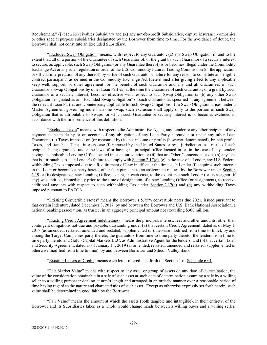 Receivables Subsidiary and (k) any not-for-profit Subsidiaries, captive insurance companies or other special purpose subsidiaries designated by the Borrower from time to time. For the avoidance of doubt, the Borrower shall not constitute an Excluded Subsidiary. Excluded Swap Obligation extent that, all or a portion of the Guarantee of such Guarantor of, or the grant by such Guarantor of a security interest to secure, as applicable, such Swap Obligation (or any Guarantee thereof) is or becomes illegal under the Commodity Exchange Act or any rule, regulation or order of the U.S. Commodity Futures Trading Commission (or the application or official interpretation of any thereof) by vi keep well, support, or other agreement for the benefit of such Guarantor and any and all Guarantees of such Guarantor of a security interest, becomes effective with respect to such Swap Obligation or (b) any other Swap the relevant Loan Parties and counterparty applicable to such Swap Obligations. If a Swap Obligation arises under a Master Agreement governing more than one Swap, such exclusion shall apply only to the portion of such Swap Obligation that is attributable to Swaps for which such Guarantee or security interest is or becomes excluded in accordance with the first sentence of this definition. Excluded Taxes payment to be made by or on account of any obligation of any Loan Party hereunder or under any other Loan Document, (a) Taxes imposed on (or measured by) its net income or profits (however denominated), branch profits Taxes, and franchise Taxes, in each case (i) imposed by the United States or by a jurisdiction as a result of such recipient being organized under the laws of or having its principal office located in or, in the case of any Lender, having its applicable Lending Office located in, such jurisdiction or (ii) that are Other Connection Taxes, (b) any Tax Section 2.17(e), (c) in the case of a Lender, any U.S. Federal withholding Taxes imposed due to a Requirement of Law in effect at the time such Lender (i) acquires such interest in the Loan or becomes a party hereto, other than pursuant to an assignment request by the Borrower under Section 2.19 or (ii) designates a new Lending Office, except, in each case, to the extent that such Lender (or its assignor, if any) was entitled, immediately prior to the time of designation of a new Lending Office (or assignment), to receive additional amounts with respect to such withholding Tax under Section 2.17(a) and (d) any withholding Taxes imposed pursuant to FATCA. Existing Convertible Notes that certain Indenture, dated December 8, 2017, by and between the Borrower and U.S. Bank National Association, a national banking association, as trustee, in an aggregate principal amount not exceeding $300 million. Existing Credit Agreement Indebtedness contingent obligations not due and payable, outstanding under (a) that certain Credit Agreement, dated as of May 1, 2017 (as amended, restated, amended and restated, supplemented or otherwise modified from time to time), by and among the Target Companies party thereto, the guarantors from time to time party thereto, the lenders from time to time party thereto and Golub Capital Markets LLC, as Administrative Agent for the lenders, and (b) that certain Loan and Security Agreement, dated as of January 11, 2019 (as amended, restated, amended and restated, supplemented or otherwise modified from time to time), by and between Borrower and Silicon Valley Bank. Existing Letters of Credit Schedule 6.01. Fair Market Value value of the consideration obtainable in a sale of such asset at such date of determination assuming a sale by a willing seller to a willing purchaser dealing time having regard to the nature and characteristics of such asset. Except as otherwise expressly set forth herein, such value shall be determined in good faith by the Borrower. Fair Value Borrower and its Subsidiaries taken as a whole would change hands between a willing buyer and a willing seller, -29- US-DOCS\114614260.17