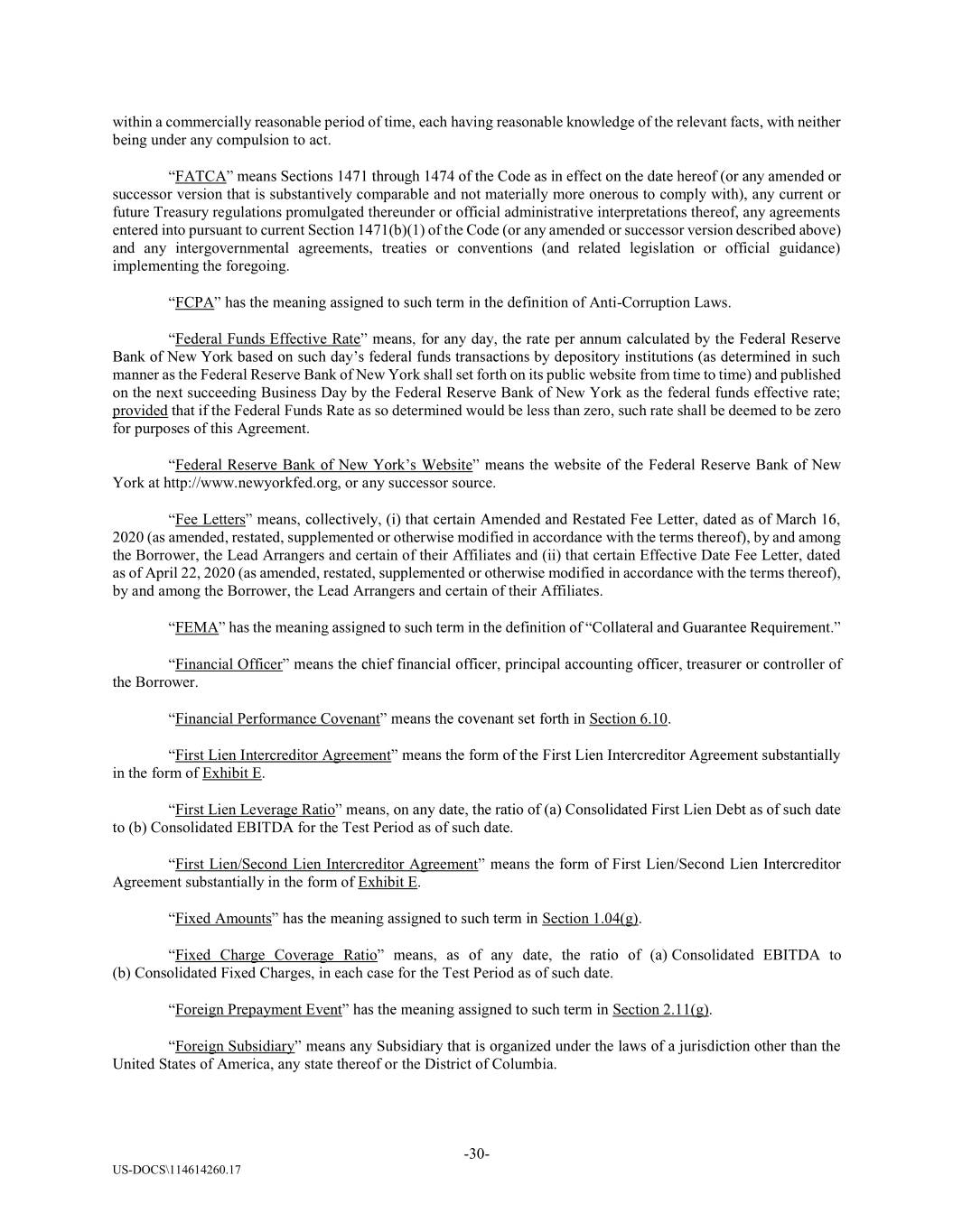 within a commercially reasonable period of time, each having reasonable knowledge of the relevant facts, with neither being under any compulsion to act. FATCA successor version that is substantively comparable and not materially more onerous to comply with), any current or future Treasury regulations promulgated thereunder or official administrative interpretations thereof, any agreements entered into pursuant to current Section 1471(b)(1) of the Code (or any amended or successor version described above) and any intergovernmental agreements, treaties or conventions (and related legislation or official guidance) implementing the foregoing. FCPA ition of Anti-Corruption Laws. Federal Funds Effective Rate manner as the Federal Reserve Bank of New York shall set forth on its public website from time to time) and published on the next succeeding Business Day by the Federal Reserve Bank of New York as the federal funds effective rate; provided that if the Federal Funds Rate as so determined would be less than zero, such rate shall be deemed to be zero for purposes of this Agreement. York at http://www.newyorkfed.org, or any successor source. Fee Letters 2020 (as amended, restated, supplemented or otherwise modified in accordance with the terms thereof), by and among the Borrower, the Lead Arrangers and certain of their Affiliates and (ii) that certain Effective Date Fee Letter, dated as of April 22, 2020 (as amended, restated, supplemented or otherwise modified in accordance with the terms thereof), by and among the Borrower, the Lead Arrangers and certain of their Affiliates. FEMA Financial Officer roller of the Borrower. Financial Performance Covenant Section 6.10. First Lien Intercreditor Agreement in the form of Exhibit E. First Lien Leverage Ratio to (b) Consolidated EBITDA for the Test Period as of such date. First Lien/Second Lien Intercreditor Agreement Agreement substantially in the form of Exhibit E. Fixed Amounts Section 1.04(g). Fixed Charge Coverage Ratio Consolidated EBITDA to (b) Consolidated Fixed Charges, in each case for the Test Period as of such date. Foreign Prepayment Event Section 2.11(g). Foreign Subsidiary United States of America, any state thereof or the District of Columbia. -30- US-DOCS\114614260.17