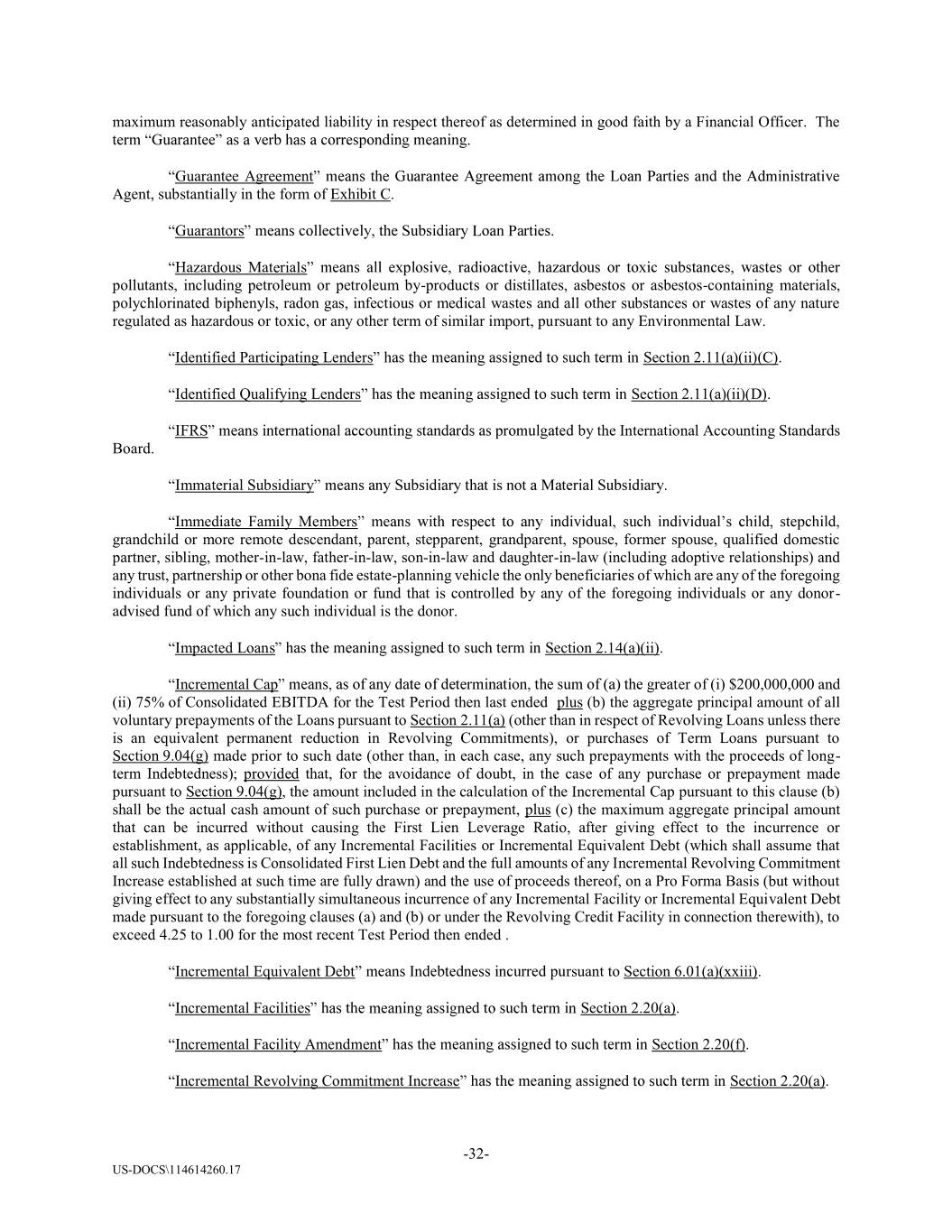 maximum reasonably anticipated liability in respect thereof as determined in good faith by a Financial Officer. The Guarantee Agreement Agent, substantially in the form of Exhibit C. Guarantors Hazardous Materials pollutants, including petroleum or petroleum by-products or distillates, asbestos or asbestos-containing materials, polychlorinated biphenyls, radon gas, infectious or medical wastes and all other substances or wastes of any nature regulated as hazardous or toxic, or any other term of similar import, pursuant to any Environmental Law. Identified Participating Lenders Section 2.11(a)(ii)(C). Identified Qualifying Lenders Section 2.11(a)(ii)(D). IFRS by the International Accounting Standards Board. Immaterial Subsidiary Immediate Family Members grandchild or more remote descendant, parent, stepparent, grandparent, spouse, former spouse, qualified domestic partner, sibling, mother-in-law, father-in-law, son-in-law and daughter-in-law (including adoptive relationships) and any trust, partnership or other bona fide estate-planning vehicle the only beneficiaries of which are any of the foregoing individuals or any private foundation or fund that is controlled by any of the foregoing individuals or any donor- advised fund of which any such individual is the donor. Impacted Loans Section 2.14(a)(ii). Incremental Cap er of (i) $200,000,000 and (ii) 75% of Consolidated EBITDA for the Test Period then last ended plus (b) the aggregate principal amount of all voluntary prepayments of the Loans pursuant to Section 2.11(a) (other than in respect of Revolving Loans unless there is an equivalent permanent reduction in Revolving Commitments), or purchases of Term Loans pursuant to Section 9.04(g) made prior to such date (other than, in each case, any such prepayments with the proceeds of long- term Indebtedness); provided that, for the avoidance of doubt, in the case of any purchase or prepayment made pursuant to Section 9.04(g), the amount included in the calculation of the Incremental Cap pursuant to this clause (b) shall be the actual cash amount of such purchase or prepayment, plus (c) the maximum aggregate principal amount that can be incurred without causing the First Lien Leverage Ratio, after giving effect to the incurrence or establishment, as applicable, of any Incremental Facilities or Incremental Equivalent Debt (which shall assume that all such Indebtedness is Consolidated First Lien Debt and the full amounts of any Incremental Revolving Commitment Increase established at such time are fully drawn) and the use of proceeds thereof, on a Pro Forma Basis (but without giving effect to any substantially simultaneous incurrence of any Incremental Facility or Incremental Equivalent Debt made pursuant to the foregoing clauses (a) and (b) or under the Revolving Credit Facility in connection therewith), to exceed 4.25 to 1.00 for the most recent Test Period then ended . Incremental Equivalent Debt rsuant to Section 6.01(a)(xxiii). Incremental Facilities Section 2.20(a). Incremental Facility Amendment Section 2.20(f). Incremental Revolving Commitment Increase Section 2.20(a). -32- US-DOCS\114614260.17