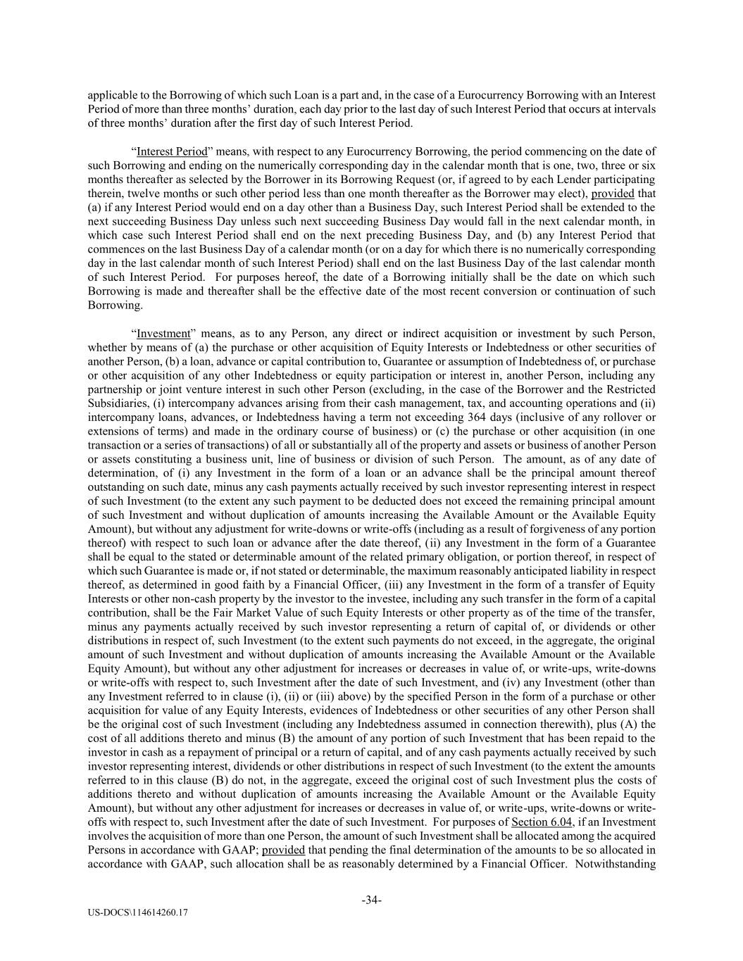 applicable to the Borrowing of which such Loan is a part and, in the case of a Eurocurrency Borrowing with an Interest tervals Interest Period such Borrowing and ending on the numerically corresponding day in the calendar month that is one, two, three or six months thereafter as selected by the Borrower in its Borrowing Request (or, if agreed to by each Lender participating therein, twelve months or such other period less than one month thereafter as the Borrower may elect), provided that (a) if any Interest Period would end on a day other than a Business Day, such Interest Period shall be extended to the next succeeding Business Day unless such next succeeding Business Day would fall in the next calendar month, in which case such Interest Period shall end on the next preceding Business Day, and (b) any Interest Period that commences on the last Business Day of a calendar month (or on a day for which there is no numerically corresponding day in the last calendar month of such Interest Period) shall end on the last Business Day of the last calendar month of such Interest Period. For purposes hereof, the date of a Borrowing initially shall be the date on which such Borrowing is made and thereafter shall be the effective date of the most recent conversion or continuation of such Borrowing. Investment whether by means of (a) the purchase or other acquisition of Equity Interests or Indebtedness or other securities of another Person, (b) a loan, advance or capital contribution to, Guarantee or assumption of Indebtedness of, or purchase or other acquisition of any other Indebtedness or equity participation or interest in, another Person, including any partnership or joint venture interest in such other Person (excluding, in the case of the Borrower and the Restricted Subsidiaries, (i) intercompany advances arising from their cash management, tax, and accounting operations and (ii) intercompany loans, advances, or Indebtedness having a term not exceeding 364 days (inclusive of any rollover or extensions of terms) and made in the ordinary course of business) or (c) the purchase or other acquisition (in one transaction or a series of transactions) of all or substantially all of the property and assets or business of another Person or assets constituting a business unit, line of business or division of such Person. The amount, as of any date of determination, of (i) any Investment in the form of a loan or an advance shall be the principal amount thereof outstanding on such date, minus any cash payments actually received by such investor representing interest in respect of such Investment (to the extent any such payment to be deducted does not exceed the remaining principal amount of such Investment and without duplication of amounts increasing the Available Amount or the Available Equity Amount), but without any adjustment for write-downs or write-offs (including as a result of forgiveness of any portion thereof) with respect to such loan or advance after the date thereof, (ii) any Investment in the form of a Guarantee shall be equal to the stated or determinable amount of the related primary obligation, or portion thereof, in respect of which such Guarantee is made or, if not stated or determinable, the maximum reasonably anticipated liability in respect thereof, as determined in good faith by a Financial Officer, (iii) any Investment in the form of a transfer of Equity Interests or other non-cash property by the investor to the investee, including any such transfer in the form of a capital contribution, shall be the Fair Market Value of such Equity Interests or other property as of the time of the transfer, minus any payments actually received by such investor representing a return of capital of, or dividends or other distributions in respect of, such Investment (to the extent such payments do not exceed, in the aggregate, the original amount of such Investment and without duplication of amounts increasing the Available Amount or the Available Equity Amount), but without any other adjustment for increases or decreases in value of, or write-ups, write-downs or write-offs with respect to, such Investment after the date of such Investment, and (iv) any Investment (other than any Investment referred to in clause (i), (ii) or (iii) above) by the specified Person in the form of a purchase or other acquisition for value of any Equity Interests, evidences of Indebtedness or other securities of any other Person shall be the original cost of such Investment (including any Indebtedness assumed in connection therewith), plus (A) the cost of all additions thereto and minus (B) the amount of any portion of such Investment that has been repaid to the investor in cash as a repayment of principal or a return of capital, and of any cash payments actually received by such investor representing interest, dividends or other distributions in respect of such Investment (to the extent the amounts referred to in this clause (B) do not, in the aggregate, exceed the original cost of such Investment plus the costs of additions thereto and without duplication of amounts increasing the Available Amount or the Available Equity Amount), but without any other adjustment for increases or decreases in value of, or write-ups, write-downs or write- offs with respect to, such Investment after the date of such Investment. For purposes of Section 6.04, if an Investment involves the acquisition of more than one Person, the amount of such Investment shall be allocated among the acquired Persons in accordance with GAAP; provided that pending the final determination of the amounts to be so allocated in accordance with GAAP, such allocation shall be as reasonably determined by a Financial Officer. Notwithstanding -34- US-DOCS\114614260.17
