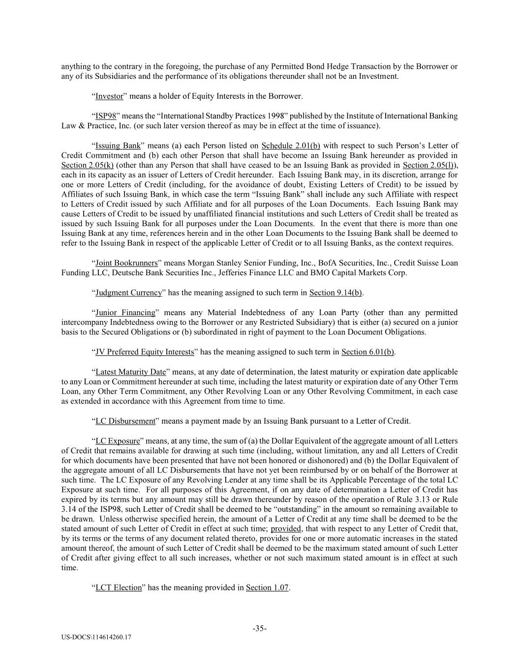 anything to the contrary in the foregoing, the purchase of any Permitted Bond Hedge Transaction by the Borrower or any of its Subsidiaries and the performance of its obligations thereunder shall not be an Investment. Investor ISP98 Law & Practice, Inc. (or such later version thereof as may be in effect at the time of issuance). Issuing Bank Schedule 2.01(b) Credit Commitment and (b) each other Person that shall have become an Issuing Bank hereunder as provided in Section 2.05(k) (other than any Person that shall have ceased to be an Issuing Bank as provided in Section 2.05(l)), each in its capacity as an issuer of Letters of Credit hereunder. Each Issuing Bank may, in its discretion, arrange for one or more Letters of Credit (including, for the avoidance of doubt, Existing Letters of Credit) to be issued by to Letters of Credit issued by such Affiliate and for all purposes of the Loan Documents. Each Issuing Bank may cause Letters of Credit to be issued by unaffiliated financial institutions and such Letters of Credit shall be treated as issued by such Issuing Bank for all purposes under the Loan Documents. In the event that there is more than one Issuing Bank at any time, references herein and in the other Loan Documents to the Issuing Bank shall be deemed to refer to the Issuing Bank in respect of the applicable Letter of Credit or to all Issuing Banks, as the context requires. Joint Bookrunners means Morgan Stanley Senior Funding, Inc., BofA Securities, Inc., Credit Suisse Loan Funding LLC, Deutsche Bank Securities Inc., Jefferies Finance LLC and BMO Capital Markets Corp. Judgment Currency Section 9.14(b). Junior Financing intercompany Indebtedness owing to the Borrower or any Restricted Subsidiary) that is either (a) secured on a junior basis to the Secured Obligations or (b) subordinated in right of payment to the Loan Document Obligations. JV Preferred Equity Interests Section 6.01(b). Latest Maturity Date to any Loan or Commitment hereunder at such time, including the latest maturity or expiration date of any Other Term Loan, any Other Term Commitment, any Other Revolving Loan or any Other Revolving Commitment, in each case as extended in accordance with this Agreement from time to time. LC Disbursement LC Exposure of Credit that remains available for drawing at such time (including, without limitation, any and all Letters of Credit for which documents have been presented that have not been honored or dishonored) and (b) the Dollar Equivalent of the aggregate amount of all LC Disbursements that have not yet been reimbursed by or on behalf of the Borrower at such time. The LC Exposure of any Revolving Lender at any time shall be its Applicable Percentage of the total LC Exposure at such time. For all purposes of this Agreement, if on any date of determination a Letter of Credit has expired by its terms but any amount may still be drawn thereunder by reason of the operation of Rule 3.13 or Rule be drawn. Unless otherwise specified herein, the amount of a Letter of Credit at any time shall be deemed to be the stated amount of such Letter of Credit in effect at such time; provided, that with respect to any Letter of Credit that, by its terms or the terms of any document related thereto, provides for one or more automatic increases in the stated amount thereof, the amount of such Letter of Credit shall be deemed to be the maximum stated amount of such Letter of Credit after giving effect to all such increases, whether or not such maximum stated amount is in effect at such time. LCT Election ided in Section 1.07. -35- US-DOCS\114614260.17