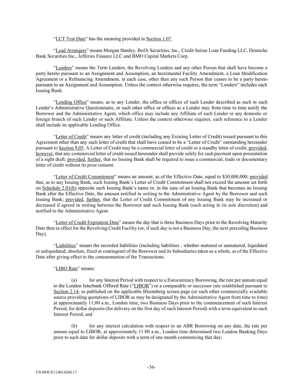 LCT Test Date Section 1.07. Lead Arrangers BofA Securities, Inc., Credit Suisse Loan Funding LLC, Deutsche Bank Securities Inc., Jefferies Finance LLC and BMO Capital Markets Corp. Lenders evolving Lenders and any other Person that shall have become a party hereto pursuant to an Assignment and Assumption, an Incremental Facility Amendment, a Loan Modification Agreement or a Refinancing Amendment, in each case, other than any such Person that ceases to be a party hereto Issuing Bank. Lending Office such Borrower and the Administrative Agent, which office may include any Affiliate of such Lender or any domestic or foreign branch of such Lender or such Affiliate. Unless the context otherwise requires, each reference to a Lender shall include its applicable Lending Office. Letter of Credit Agreem pursuant to Section 9.05. A Letter of Credit may be a commercial letter of credit or a standby letter of credit; provided, however, that any commercial letter of credit issued hereunder shall provide solely for cash payment upon presentation of a sight draft; provided, further, that no Issuing Bank shall be required to issue a commercial, trade or documentary letter of credit without its prior consent. Letter of Credit Commitment provided that, as to any Issuing Bank, suc on Schedule 2.01(b) Bank after the Effective Date, the amount notified in writing to the Administrative Agent by the Borrower and such Issuing Bank; provided, further, that the Letter of Credit Commitment of any Issuing Bank may be increased or decreased if agreed in writing between the Borrower and such Issuing Bank (each acting in its sole discretion) and notified to the Administrative Agent. Letter of Credit Expiration Date Date then in effect for the Revolving Credit Facility (or, if such day is not a Business Day, the next preceding Business Day). Liabilities or unliquidated, absolute, fixed or contingent) of the Borrower and its Subsidiaries taken as a whole, as of the Effective Date after giving effect to the consummation of the Transactions. LIBO Rate (a) for any Interest Period with respect to a Eurocurrency Borrowing, the rate per annum equal LIBOR parable or successor rate established pursuant to Section 2.14, as published on the applicable Bloomberg screen page (or such other commercially available source providing quotations of LIBOR as may be designated by the Administrative Agent from time to time) at approximately 11:00 a.m., London time, two Business Days prior to the commencement of such Interest Period, for dollar deposits (for delivery on the first day of such Interest Period) with a term equivalent to such Interest Period; and (b) for any interest calculation with respect to an ABR Borrowing on any date, the rate per annum equal to LIBOR, at approximately 11:00 a.m., London time determined two London Banking Days prior to such date for dollar deposits with a term of one month commencing that day; -36- US-DOCS\114614260.17