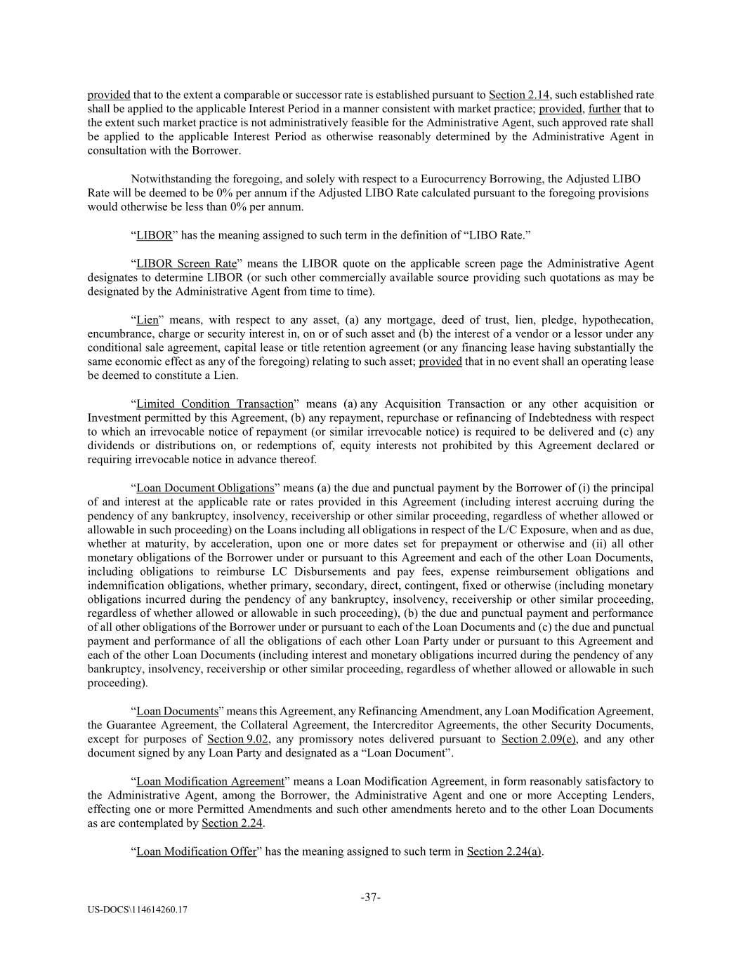 provided that to the extent a comparable or successor rate is established pursuant to Section 2.14, such established rate shall be applied to the applicable Interest Period in a manner consistent with market practice; provided, further that to the extent such market practice is not administratively feasible for the Administrative Agent, such approved rate shall be applied to the applicable Interest Period as otherwise reasonably determined by the Administrative Agent in consultation with the Borrower. Notwithstanding the foregoing, and solely with respect to a Eurocurrency Borrowing, the Adjusted LIBO Rate will be deemed to be 0% per annum if the Adjusted LIBO Rate calculated pursuant to the foregoing provisions would otherwise be less than 0% per annum. LIBOR LIBOR Screen Rate designates to determine LIBOR (or such other commercially available source providing such quotations as may be designated by the Administrative Agent from time to time). Lien encumbrance, charge or security interest in, on or of such asset and (b) the interest of a vendor or a lessor under any conditional sale agreement, capital lease or title retention agreement (or any financing lease having substantially the same economic effect as any of the foregoing) relating to such asset; provided that in no event shall an operating lease be deemed to constitute a Lien. Limited Condition Transaction any Acquisition Transaction or any other acquisition or Investment permitted by this Agreement, (b) any repayment, repurchase or refinancing of Indebtedness with respect to which an irrevocable notice of repayment (or similar irrevocable notice) is required to be delivered and (c) any dividends or distributions on, or redemptions of, equity interests not prohibited by this Agreement declared or requiring irrevocable notice in advance thereof. Loan Document Obligations of and interest at the applicable rate or rates provided in this Agreement (including interest accruing during the pendency of any bankruptcy, insolvency, receivership or other similar proceeding, regardless of whether allowed or allowable in such proceeding) on the Loans including all obligations in respect of the L/C Exposure, when and as due, whether at maturity, by acceleration, upon one or more dates set for prepayment or otherwise and (ii) all other monetary obligations of the Borrower under or pursuant to this Agreement and each of the other Loan Documents, including obligations to reimburse LC Disbursements and pay fees, expense reimbursement obligations and indemnification obligations, whether primary, secondary, direct, contingent, fixed or otherwise (including monetary obligations incurred during the pendency of any bankruptcy, insolvency, receivership or other similar proceeding, regardless of whether allowed or allowable in such proceeding), (b) the due and punctual payment and performance of all other obligations of the Borrower under or pursuant to each of the Loan Documents and (c) the due and punctual payment and performance of all the obligations of each other Loan Party under or pursuant to this Agreement and each of the other Loan Documents (including interest and monetary obligations incurred during the pendency of any bankruptcy, insolvency, receivership or other similar proceeding, regardless of whether allowed or allowable in such proceeding). Loan Documents the Guarantee Agreement, the Collateral Agreement, the Intercreditor Agreements, the other Security Documents, except for purposes of Section 9.02, any promissory notes delivered pursuant to Section 2.09(e), and any other document . Loan Modification Agreement the Administrative Agent, among the Borrower, the Administrative Agent and one or more Accepting Lenders, effecting one or more Permitted Amendments and such other amendments hereto and to the other Loan Documents as are contemplated by Section 2.24. Loan Modification Offer Section 2.24(a). -37- US-DOCS\114614260.17