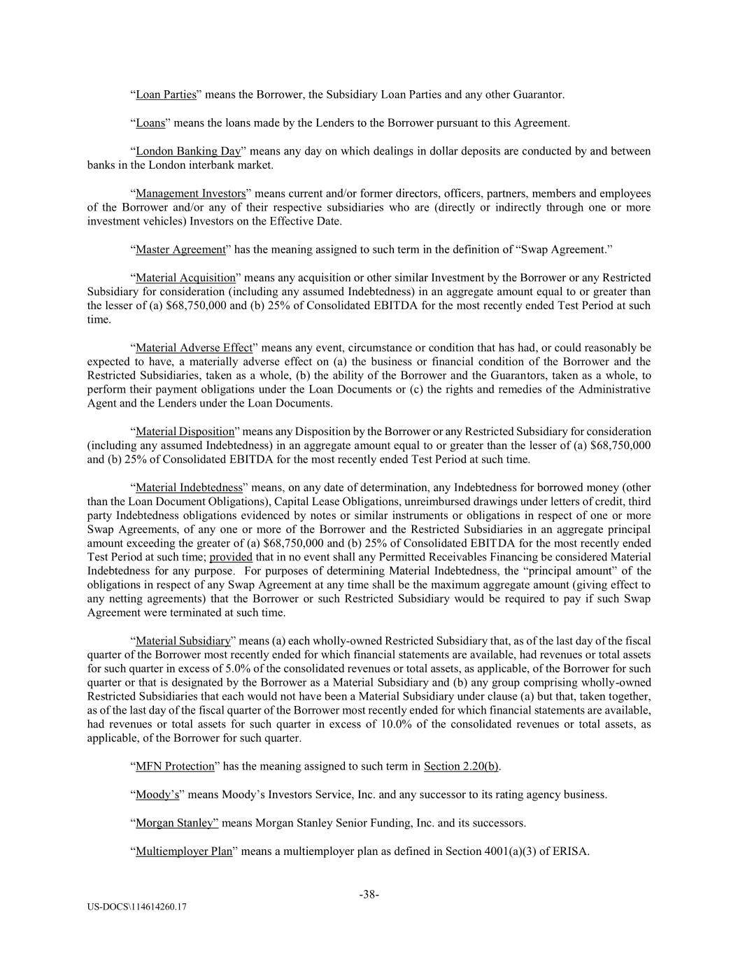 Loan Parties an Parties and any other Guarantor. Loans London Banking Day banks in the London interbank market. Management Investors of the Borrower and/or any of their respective subsidiaries who are (directly or indirectly through one or more investment vehicles) Investors on the Effective Date. Master Agreement Material Acquisition Subsidiary for consideration (including any assumed Indebtedness) in an aggregate amount equal to or greater than the lesser of (a) $68,750,000 and (b) 25% of Consolidated EBITDA for the most recently ended Test Period at such time. Material Adverse Effect nce or condition that has had, or could reasonably be expected to have, a materially adverse effect on (a) the business or financial condition of the Borrower and the Restricted Subsidiaries, taken as a whole, (b) the ability of the Borrower and the Guarantors, taken as a whole, to perform their payment obligations under the Loan Documents or (c) the rights and remedies of the Administrative Agent and the Lenders under the Loan Documents. Material Disposition estricted Subsidiary for consideration (including any assumed Indebtedness) in an aggregate amount equal to or greater than the lesser of (a) $68,750,000 and (b) 25% of Consolidated EBITDA for the most recently ended Test Period at such time. Material Indebtedness than the Loan Document Obligations), Capital Lease Obligations, unreimbursed drawings under letters of credit, third party Indebtedness obligations evidenced by notes or similar instruments or obligations in respect of one or more Swap Agreements, of any one or more of the Borrower and the Restricted Subsidiaries in an aggregate principal amount exceeding the greater of (a) $68,750,000 and (b) 25% of Consolidated EBITDA for the most recently ended Test Period at such time; provided that in no event shall any Permitted Receivables Financing be considered Material the obligations in respect of any Swap Agreement at any time shall be the maximum aggregate amount (giving effect to any netting agreements) that the Borrower or such Restricted Subsidiary would be required to pay if such Swap Agreement were terminated at such time. Material Subsidiary -owned Restricted Subsidiary that, as of the last day of the fiscal quarter of the Borrower most recently ended for which financial statements are available, had revenues or total assets for such quarter in excess of 5.0% of the consolidated revenues or total assets, as applicable, of the Borrower for such quarter or that is designated by the Borrower as a Material Subsidiary and (b) any group comprising wholly-owned Restricted Subsidiaries that each would not have been a Material Subsidiary under clause (a) but that, taken together, as of the last day of the fiscal quarter of the Borrower most recently ended for which financial statements are available, had revenues or total assets for such quarter in excess of 10.0% of the consolidated revenues or total assets, as applicable, of the Borrower for such quarter. MFN Protection Section 2.20(b). means Morgan Stanley Senior Funding, Inc. and its successors. Multiemployer Plan plan as defined in Section 4001(a)(3) of ERISA. -38- US-DOCS\114614260.17