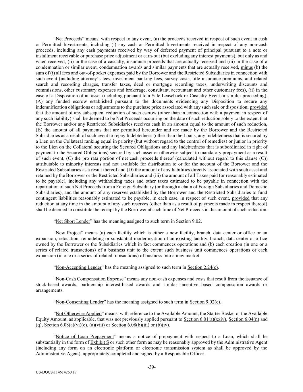 Net Proceeds or Permitted Investments, including (i) any cash or Permitted Investments received in respect of any non-cash proceeds, including any cash payments received by way of deferred payment of principal pursuant to a note or installment receivable or purchase price adjustment or earn-out (but excluding any interest payments), but only as and when received, (ii) in the case of a casualty, insurance proceeds that are actually received and (iii) in the case of a condemnation or similar event, condemnation awards and similar payments that are actually received, minus (b) the sum of (i) all fees and out-of-pocket expenses paid by the Borrower and the Restricted Subsidiaries in connection with search and recording charges, transfer taxes, deed or mortgage recording taxes, underwriting discounts and commissions, other customary expenses and brokerage, consultant, accountant and other customary fees), (ii) in the case of a Disposition of an asset (including pursuant to a Sale Leaseback or Casualty Event or similar proceeding), (A) any funded escrow established pursuant to the documents evidencing any Disposition to secure any indemnification obligations or adjustments to the purchase price associated with any such sale or disposition; provided that the amount of any subsequent reduction of such escrow (other than in connection with a payment in respect of any such liability) shall be deemed to be Net Proceeds occurring on the date of such reduction solely to the extent that the Borrower and/or any Restricted Subsidiaries receives cash in an amount equal to the amount of such reduction, (B) the amount of all payments that are permitted hereunder and are made by the Borrower and the Restricted Subsidiaries as a result of such event to repay Indebtedness (other than the Loans, any Indebtedness that is secured by a Lien on the Collateral ranking equal in priority (but without regard to the control of remedies) or junior in priority to the Lien on the Collateral securing the Secured Obligations and any Indebtedness that is subordinated in right of payment to the Secured Obligations) secured by such asset or otherwise subject to mandatory prepayment as a result of such event, (C) the pro rata portion of net cash proceeds thereof (calculated without regard to this clause (C)) attributable to minority interests and not available for distribution to or for the account of the Borrower and the Restricted Subsidiaries as a result thereof and (D) the amount of any liabilities directly associated with such asset and retained by the Borrower or the Restricted Subsidiaries and (iii) the amount of all Taxes paid (or reasonably estimated to be payable), including any withholding taxes and other taxes estimated to be payable in connection with the repatriation of such Net Proceeds from a Foreign Subsidiary (or through a chain of Foreign Subsidiaries and Domestic Subsidiaries), and the amount of any reserves established by the Borrower and the Restricted Subsidiaries to fund contingent liabilities reasonably estimated to be payable, in each case, in respect of such event, provided that any reduction at any time in the amount of any such reserves (other than as a result of payments made in respect thereof) shall be deemed to constitute the receipt by the Borrower at such time of Net Proceeds in the amount of such reduction. Net Short Lender New Project expansion, relocation, remodeling or substantial modernization of an existing facility, branch, data center or office owned by the Borrower or the Subsidiaries which in fact commences operations and (b) each creation (in one or a series of related transactions) of a business unit to the extent such business unit commences operations or each expansion (in one or a series of related transactions) of business into a new market. Non-Accepting Lender Section 2.24(c). Non-Cash Compensation Expense -cash expenses and costs that result from the issuance of stock-based awards, partnership interest-based awards and similar incentive based compensation awards or arrangements. Non-Consenting Lender Section 9.02(c). Not Otherwise Applied Equity Amount, as applicable, that was not previously applied pursuant to Section 6.01(a)(xxiv), Section 6.04(n) and (q), Section 6.08(a)(vi)(c), (a)(viii) or Section 6.08(b)(iii) or (b)(iv). Notice of Loan Prepayment shall be substantially in the form of Exhibit S or such other form as may be reasonably approved by the Administrative Agent (including any form on an electronic platform or electronic transmission system as shall be approved by the Administrative Agent), appropriately completed and signed by a Responsible Officer. -39- US-DOCS\114614260.17