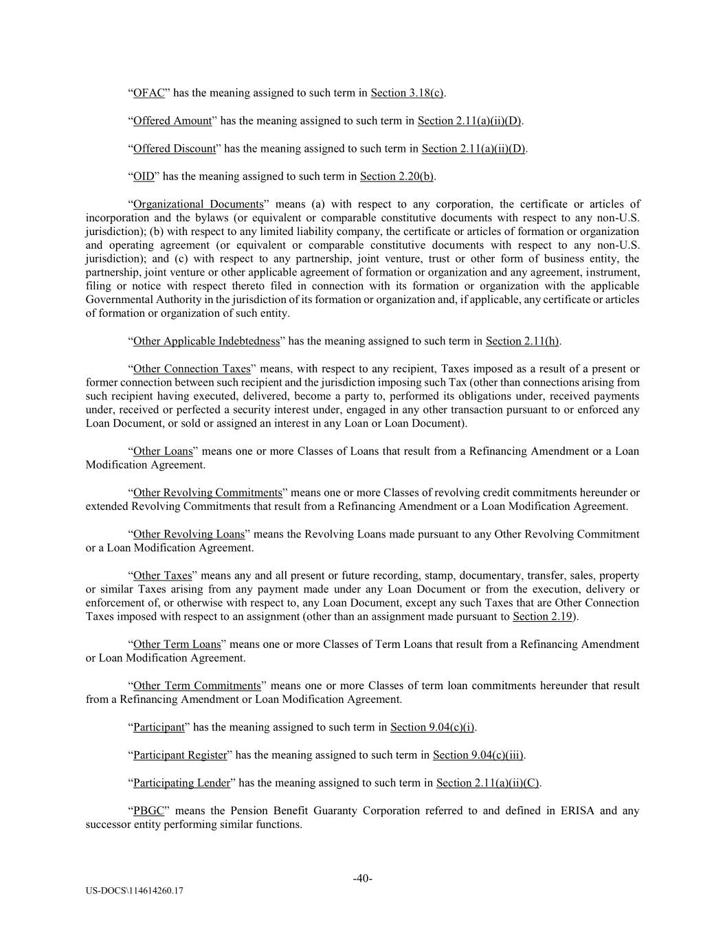 OFAC Section 3.18(c). Offered Amount Section 2.11(a)(ii)(D). Offered Discount Section 2.11(a)(ii)(D). OID Section 2.20(b). Organizational Documents incorporation and the bylaws (or equivalent or comparable constitutive documents with respect to any non-U.S. jurisdiction); (b) with respect to any limited liability company, the certificate or articles of formation or organization and operating agreement (or equivalent or comparable constitutive documents with respect to any non-U.S. jurisdiction); and (c) with respect to any partnership, joint venture, trust or other form of business entity, the partnership, joint venture or other applicable agreement of formation or organization and any agreement, instrument, filing or notice with respect thereto filed in connection with its formation or organization with the applicable Governmental Authority in the jurisdiction of its formation or organization and, if applicable, any certificate or articles of formation or organization of such entity. Other Applicable Indebtedness Section 2.11(h). Other Connection Taxes former connection between such recipient and the jurisdiction imposing such Tax (other than connections arising from such recipient having executed, delivered, become a party to, performed its obligations under, received payments under, received or perfected a security interest under, engaged in any other transaction pursuant to or enforced any Loan Document, or sold or assigned an interest in any Loan or Loan Document). Other Loans Modification Agreement. Other Revolving Commitments extended Revolving Commitments that result from a Refinancing Amendment or a Loan Modification Agreement. Other Revolving Loans the Revolving Loans made pursuant to any Other Revolving Commitment or a Loan Modification Agreement. Other Taxes or similar Taxes arising from any payment made under any Loan Document or from the execution, delivery or enforcement of, or otherwise with respect to, any Loan Document, except any such Taxes that are Other Connection Taxes imposed with respect to an assignment (other than an assignment made pursuant to Section 2.19). Other Term Loans or Loan Modification Agreement. Other Term Commitments from a Refinancing Amendment or Loan Modification Agreement. Participant Section 9.04(c)(i). Participant Register Section 9.04(c)(iii). Participating Lender Section 2.11(a)(ii)(C). PBGC successor entity performing similar functions. -40- US-DOCS\114614260.17