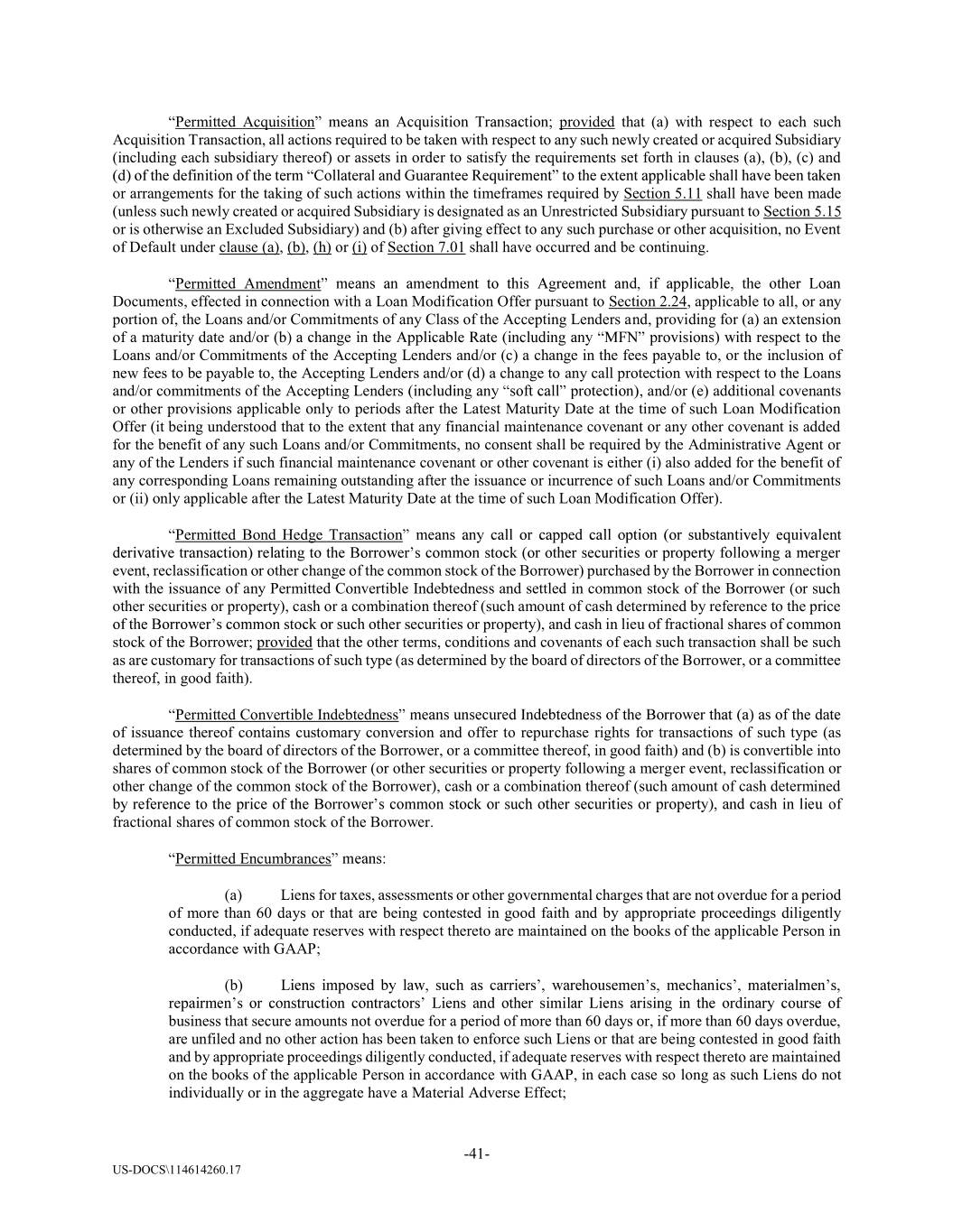 Permitted Acquisition provided that (a) with respect to each such Acquisition Transaction, all actions required to be taken with respect to any such newly created or acquired Subsidiary (including each subsidiary thereof) or assets in order to satisfy the requirements set forth in clauses (a), (b), (c) and or arrangements for the taking of such actions within the timeframes required by Section 5.11 shall have been made (unless such newly created or acquired Subsidiary is designated as an Unrestricted Subsidiary pursuant to Section 5.15 or is otherwise an Excluded Subsidiary) and (b) after giving effect to any such purchase or other acquisition, no Event of Default under clause (a), (b), (h) or (i) of Section 7.01 shall have occurred and be continuing. Permitted Amendment Documents, effected in connection with a Loan Modification Offer pursuant to Section 2.24, applicable to all, or any portion of, the Loans and/or Commitments of any Class of the Accepting Lenders and, providing for (a) an extension of a maturity date and/or (b) Loans and/or Commitments of the Accepting Lenders and/or (c) a change in the fees payable to, or the inclusion of new fees to be payable to, the Accepting Lenders and/or (d) a change to any call protection with respect to the Loans and/or commitments of the Accepting Lenders , and/or (e) additional covenants or other provisions applicable only to periods after the Latest Maturity Date at the time of such Loan Modification Offer (it being understood that to the extent that any financial maintenance covenant or any other covenant is added for the benefit of any such Loans and/or Commitments, no consent shall be required by the Administrative Agent or any of the Lenders if such financial maintenance covenant or other covenant is either (i) also added for the benefit of any corresponding Loans remaining outstanding after the issuance or incurrence of such Loans and/or Commitments or (ii) only applicable after the Latest Maturity Date at the time of such Loan Modification Offer). Permitted Bond Hedge Transaction ent event, reclassification or other change of the common stock of the Borrower) purchased by the Borrower in connection with the issuance of any Permitted Convertible Indebtedness and settled in common stock of the Borrower (or such other securities or property), cash or a combination thereof (such amount of cash determined by reference to the price r securities or property), and cash in lieu of fractional shares of common stock of the Borrower; provided that the other terms, conditions and covenants of each such transaction shall be such as are customary for transactions of such type (as determined by the board of directors of the Borrower, or a committee thereof, in good faith). Permitted Convertible Indebtedness of issuance thereof contains customary conversion and offer to repurchase rights for transactions of such type (as determined by the board of directors of the Borrower, or a committee thereof, in good faith) and (b) is convertible into shares of common stock of the Borrower (or other securities or property following a merger event, reclassification or other change of the common stock of the Borrower), cash or a combination thereof (such amount of cash determined of fractional shares of common stock of the Borrower. Permitted Encumbrances (a) Liens for taxes, assessments or other governmental charges that are not overdue for a period of more than 60 days or that are being contested in good faith and by appropriate proceedings diligently conducted, if adequate reserves with respect thereto are maintained on the books of the applicable Person in accordance with GAAP; (b) re business that secure amounts not overdue for a period of more than 60 days or, if more than 60 days overdue, are unfiled and no other action has been taken to enforce such Liens or that are being contested in good faith and by appropriate proceedings diligently conducted, if adequate reserves with respect thereto are maintained on the books of the applicable Person in accordance with GAAP, in each case so long as such Liens do not individually or in the aggregate have a Material Adverse Effect; -41- US-DOCS\114614260.17